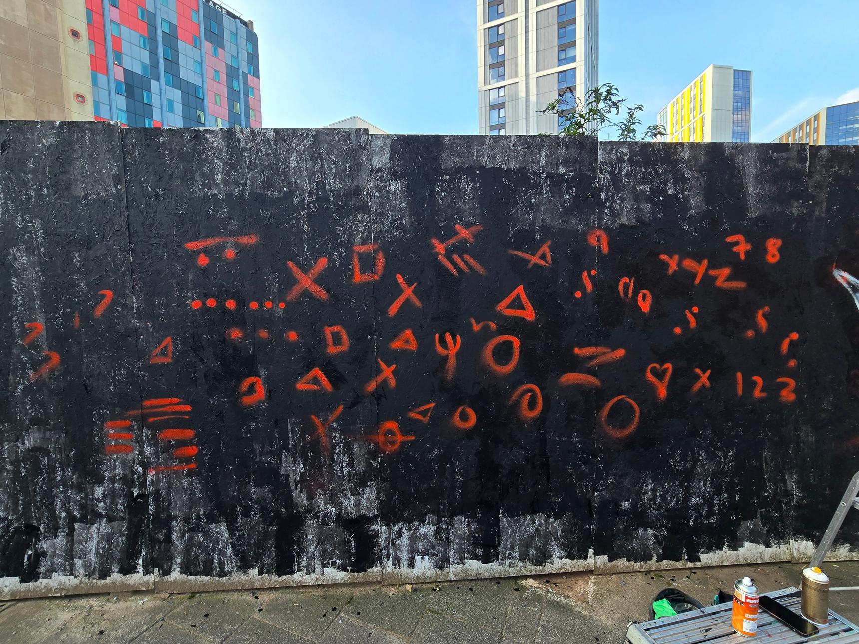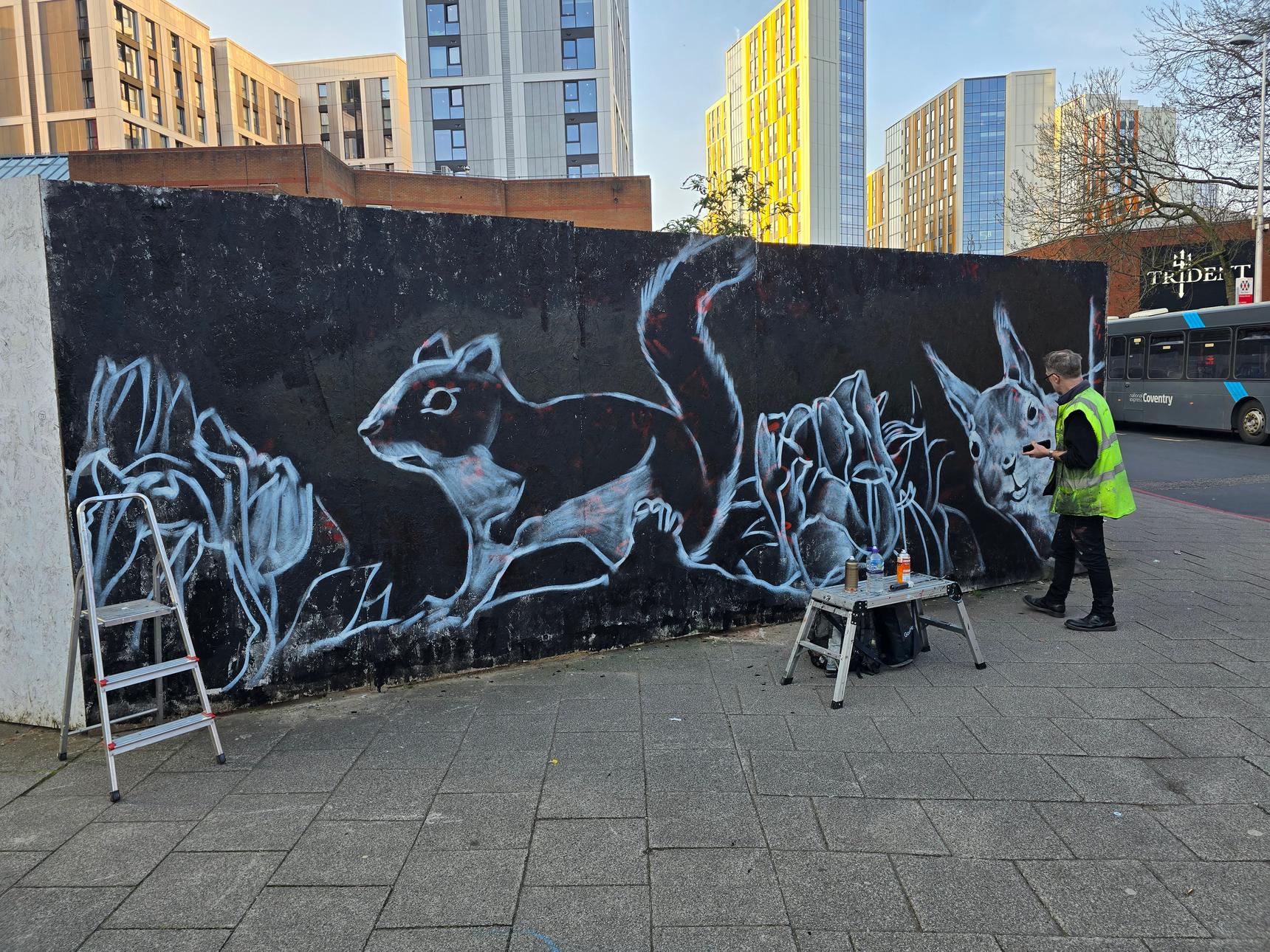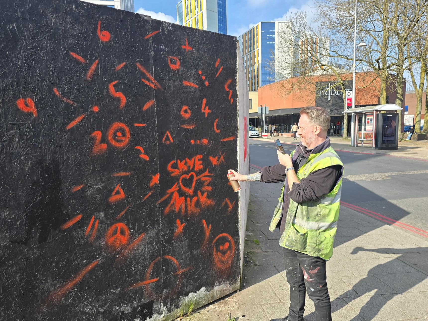 Coventry was City of Culture a few years back, and many murals started appearing in and around the city. Mick and his team were behind the vast majority of these murals. Even if it wasn't one he painted, he was often the one organising the scissor lifts, or preparing the walls prior to the paint, such as the Dan Kitchener piece just behind this mural. The land that these boards are surrounding has always been ear-marked for development; Mick positioned Dan's mural so that it will still be visible after the building is completed.