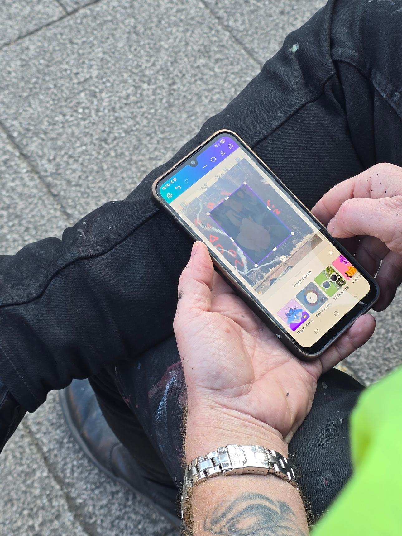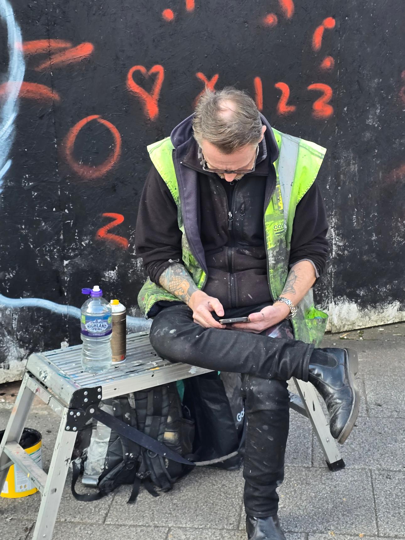 Still, he was able to carry on without threatening the phone too much, and the mural gradually took shape. At one point, the traffic warden from Saturday turned up, and I once again thanked him for turning that blind eye the night before.