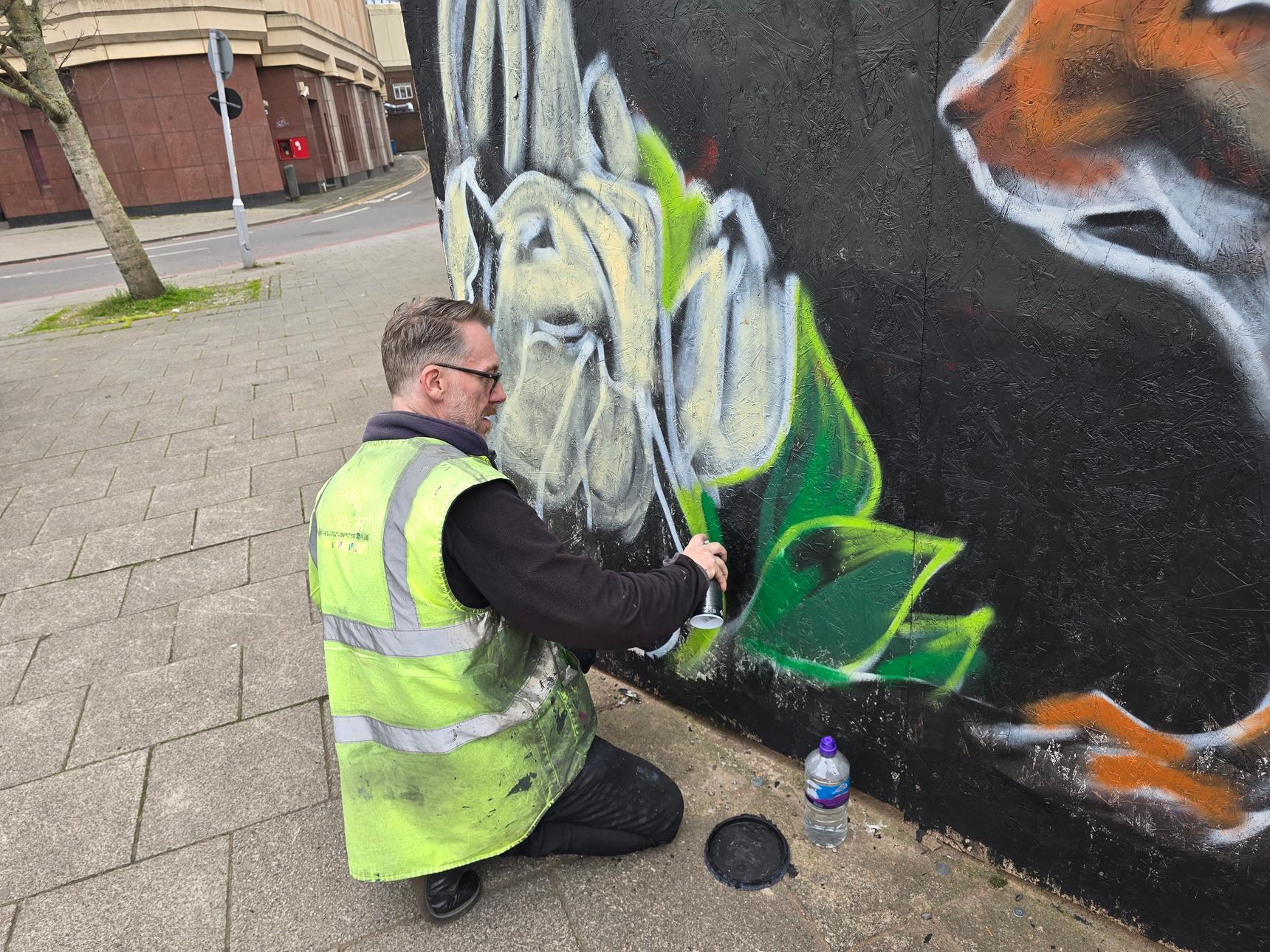 As the afternoon slowly turned towards sunset, Mick raced on to try and get the outlines completed and a bit of coloured shading in place, to try and counter the taggers. Tagging of murals in Coventry isn't too much of an issue, but every now and then a work of art is vandalised, like what happened here.