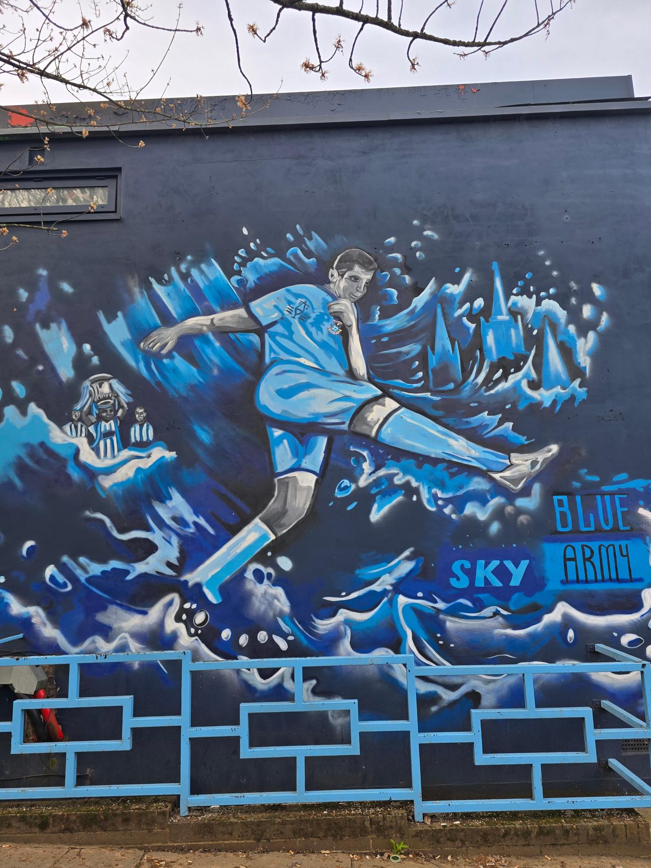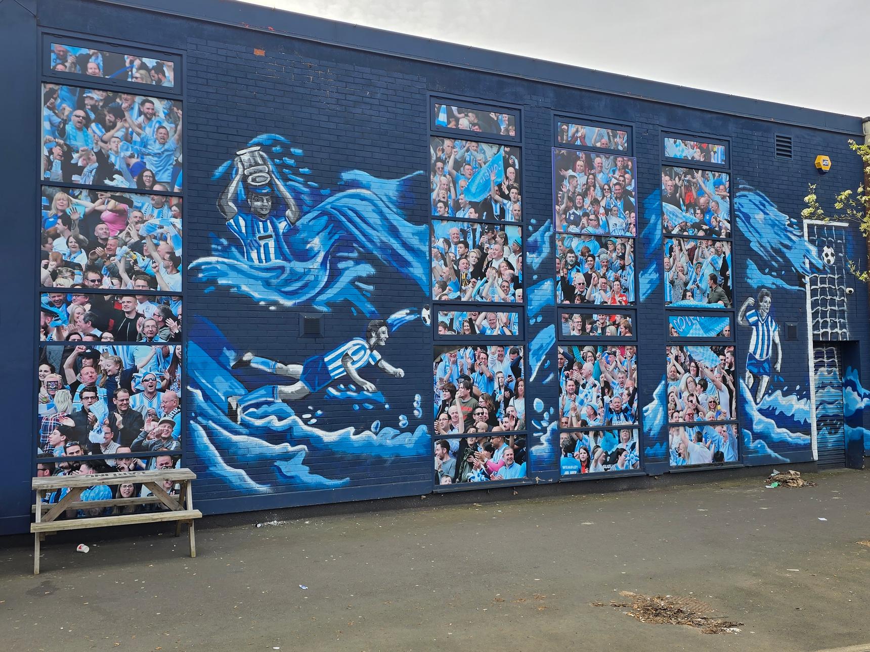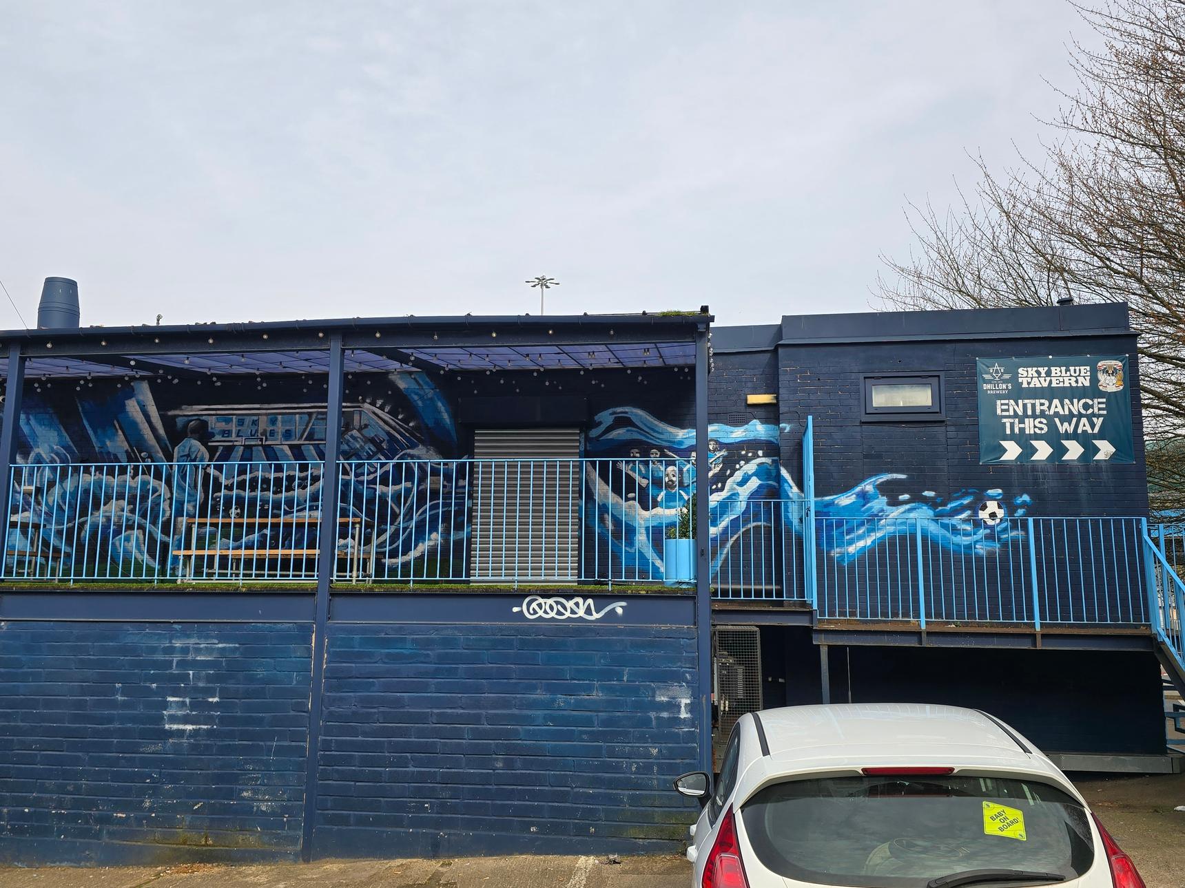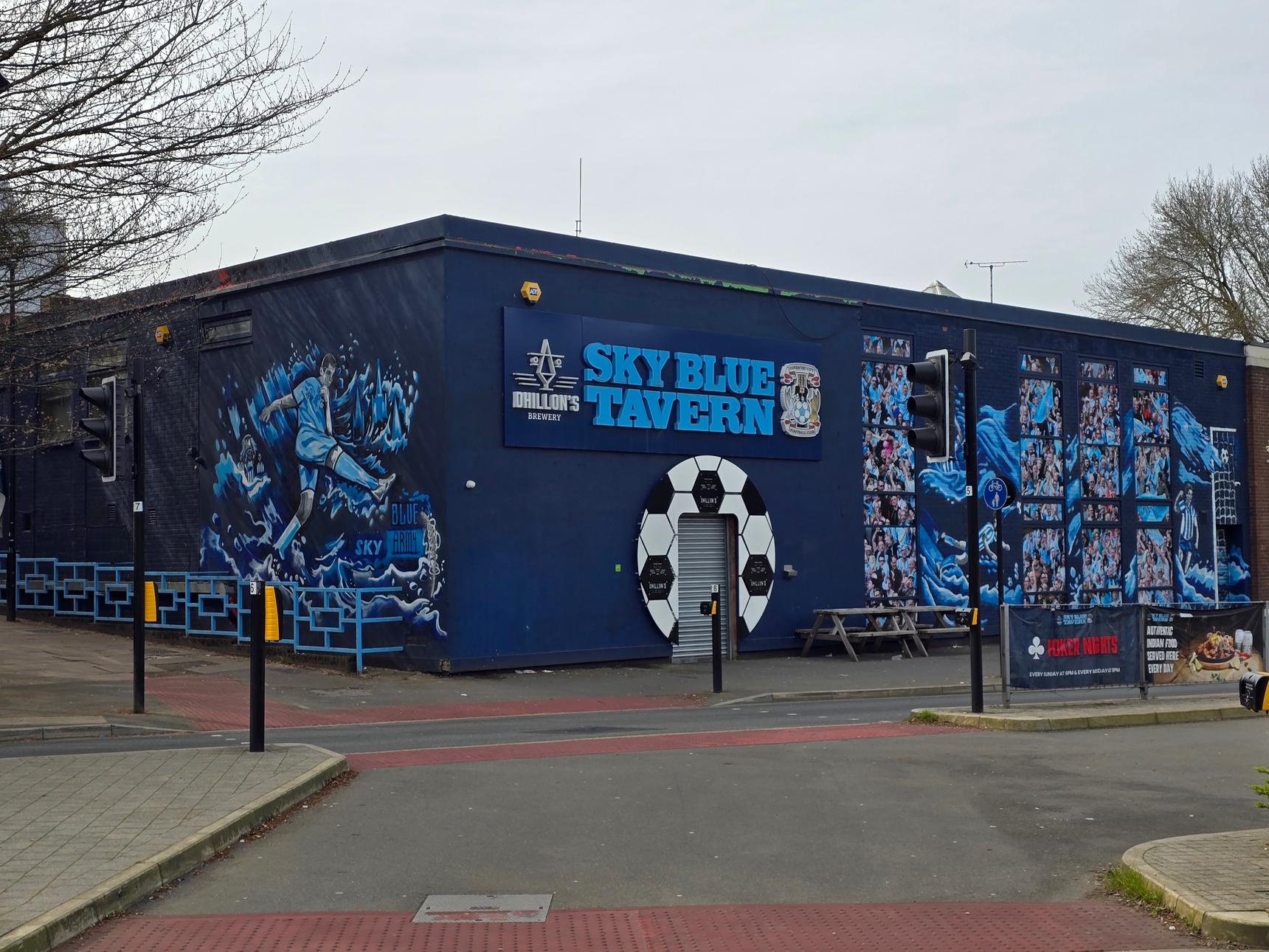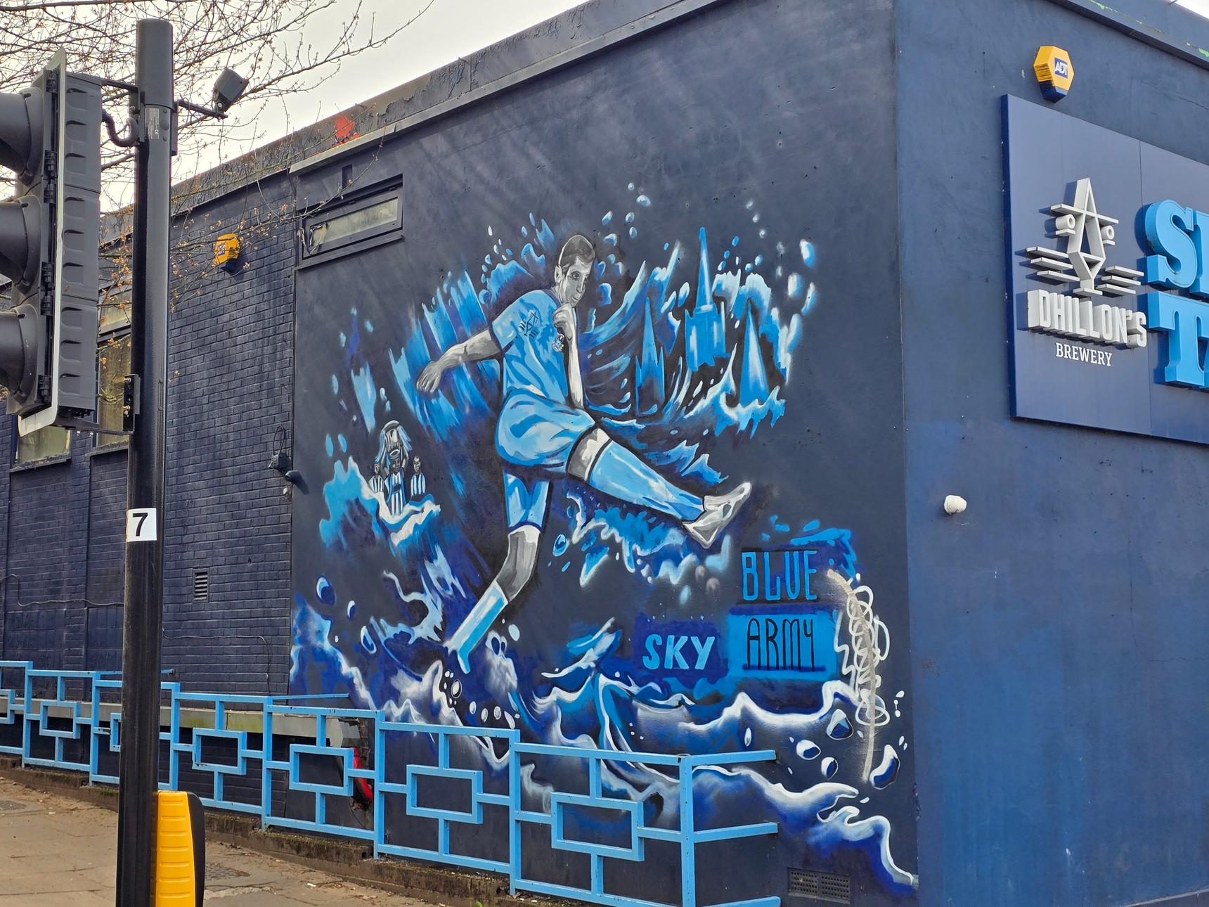 Mural on three sides of a sports tavern, celebrating Coventry's football team, the Sky Blues.