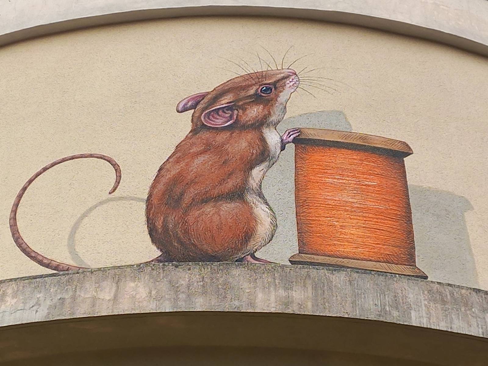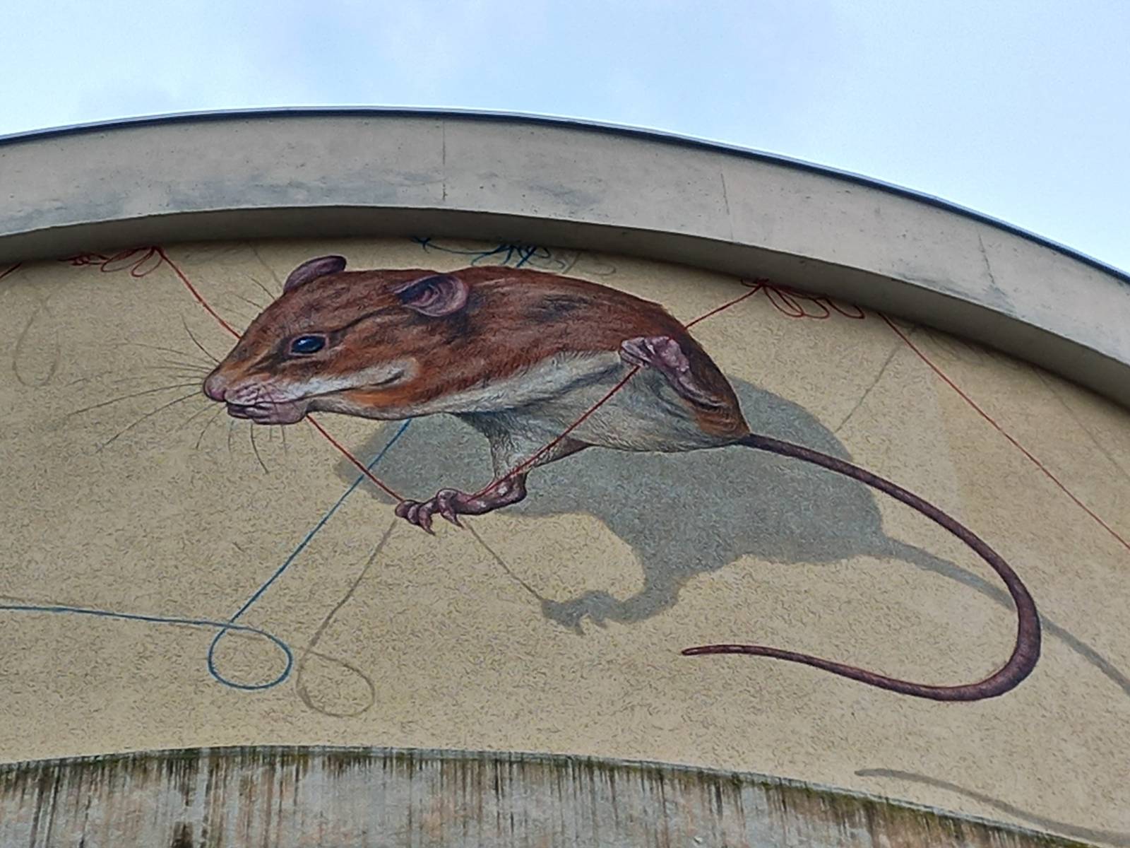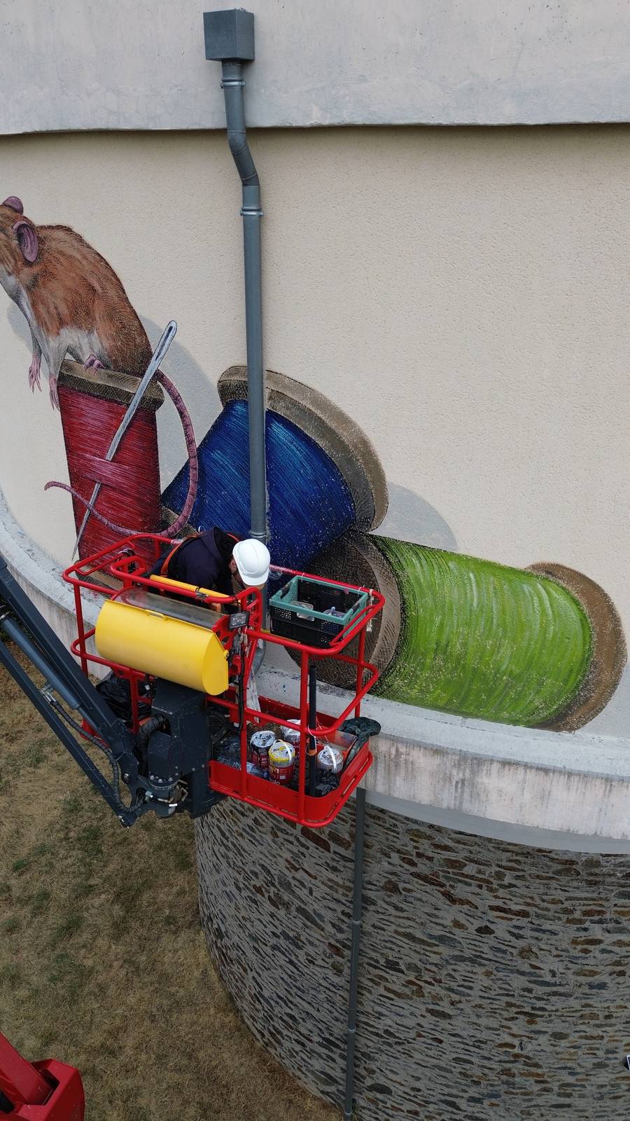 In Livinhac-le-Haut, the water tower has been transformed into a monumental canvas thanks to the talent of artist Steeven Salvat. Created entirely with a brush and acrylic paint, this mural depicts playful and mischievous harvest rats playing with large spools of coloured thread. The work, both poetic and realistic, is part of the artist’s unique universe, in which he likes to blend naturalistic precision with narrative imagination.