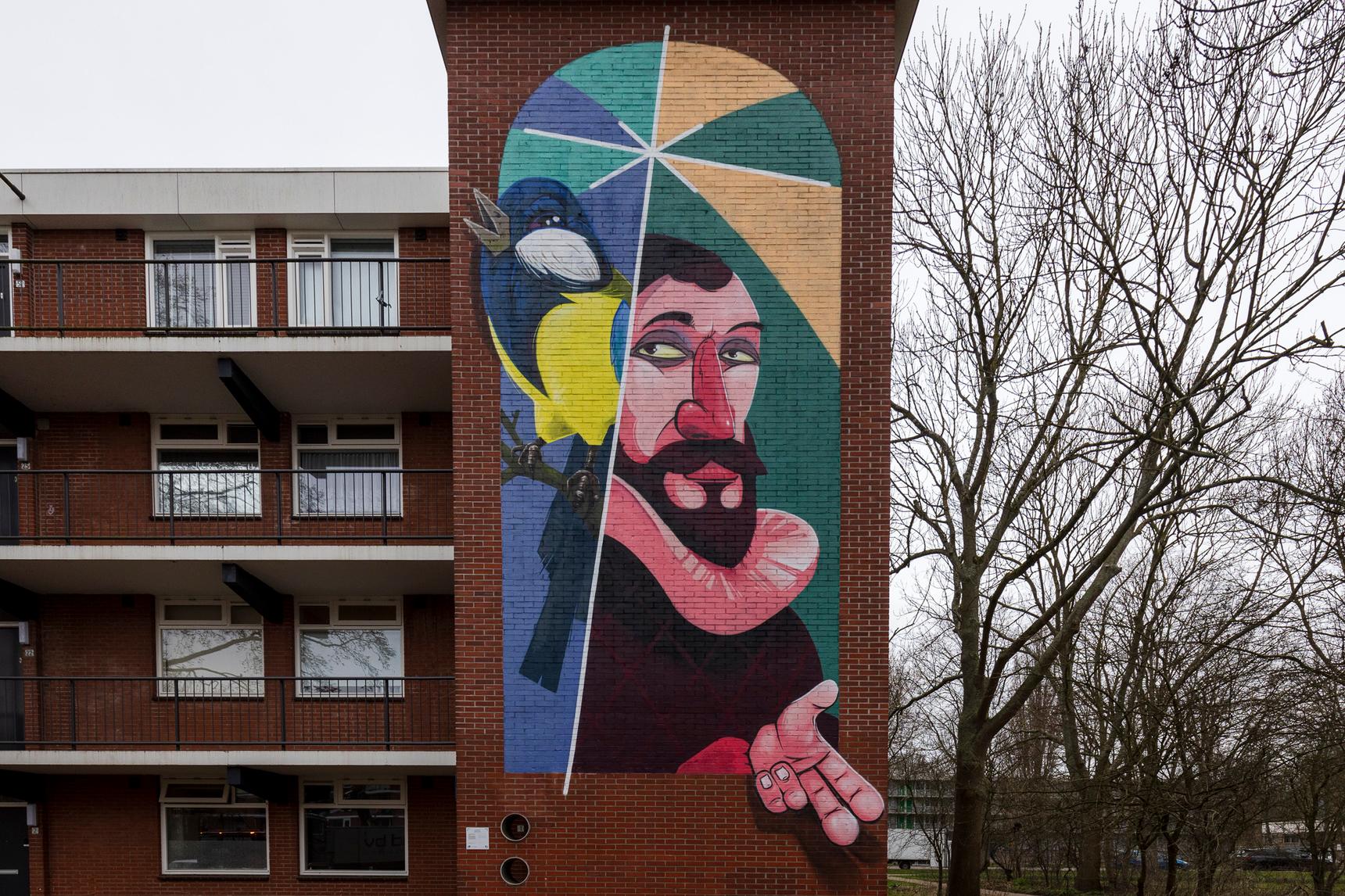 The red color is reminiscent of the old 25 guilder bill, that showed the portrait of Sweelinck. The bird is a tomtit, this songbird symbolises the importance of music in the life of Sweelinck.
