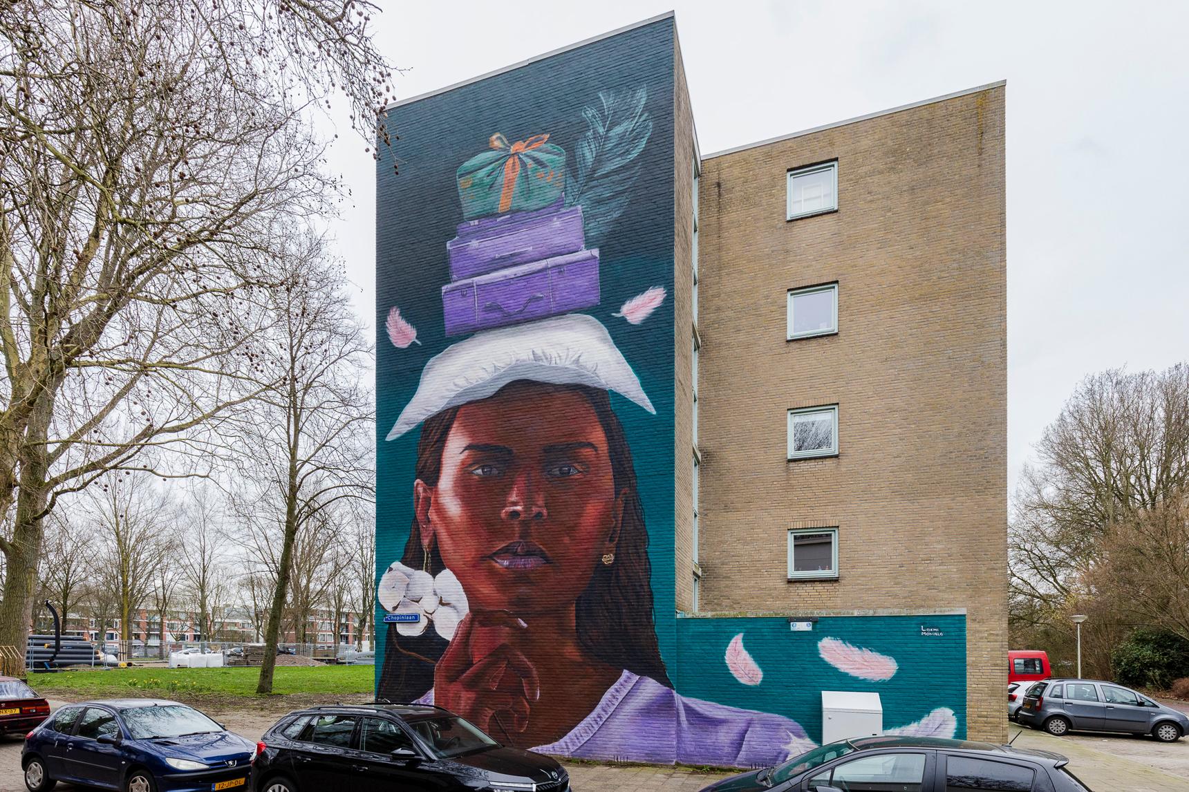 "Dit schilderij gaat over de kracht van vrouwen. Ik werd geïnspireerd door de verhalen van bewoners van Buitenhof, door de portretfoto's van Jacobus Anthonie Meessen in Nederlands-Indië (nu onderdeel van de collectie van Museum Prinsenhof Delft) en door de geschiedenis van de VOC. Die geschiedenis wordt vaak verteld vanuit het perspectief van handel en macht, maar ik wilde de andere kant laten zien: de vrouwen die deze geschiedenis in stilte op hun schouders droegen. De vrouw in mijn schilderij symboliseert veerkracht en verbondenheid. De elementen in dit schilderij tonen hoe vrouwen zowel het verleden als de toekomst generatie op generatie met zich meedragen.