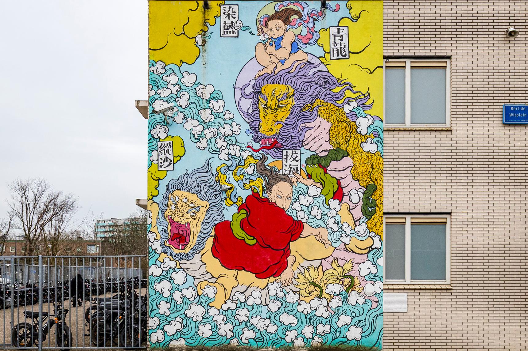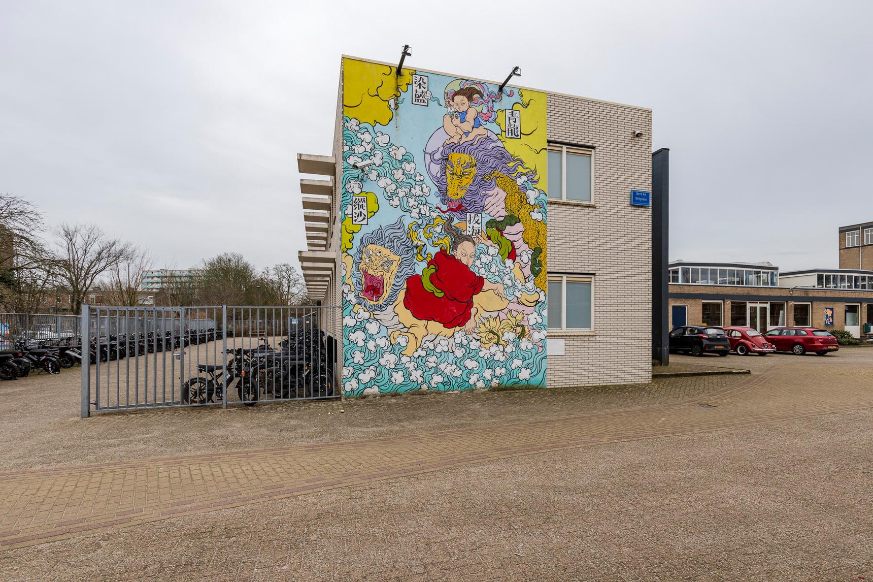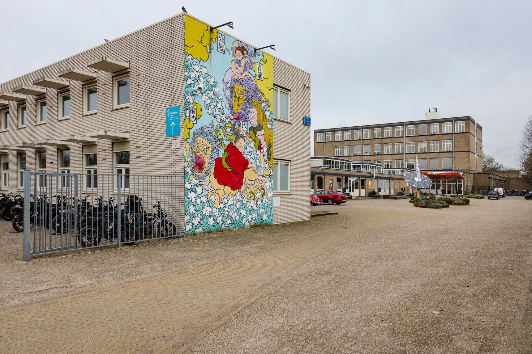 The artist worked together with students and neighbours of the school to create this mural. The scene comes from her fantasy and shows how she sees the town of Delft: