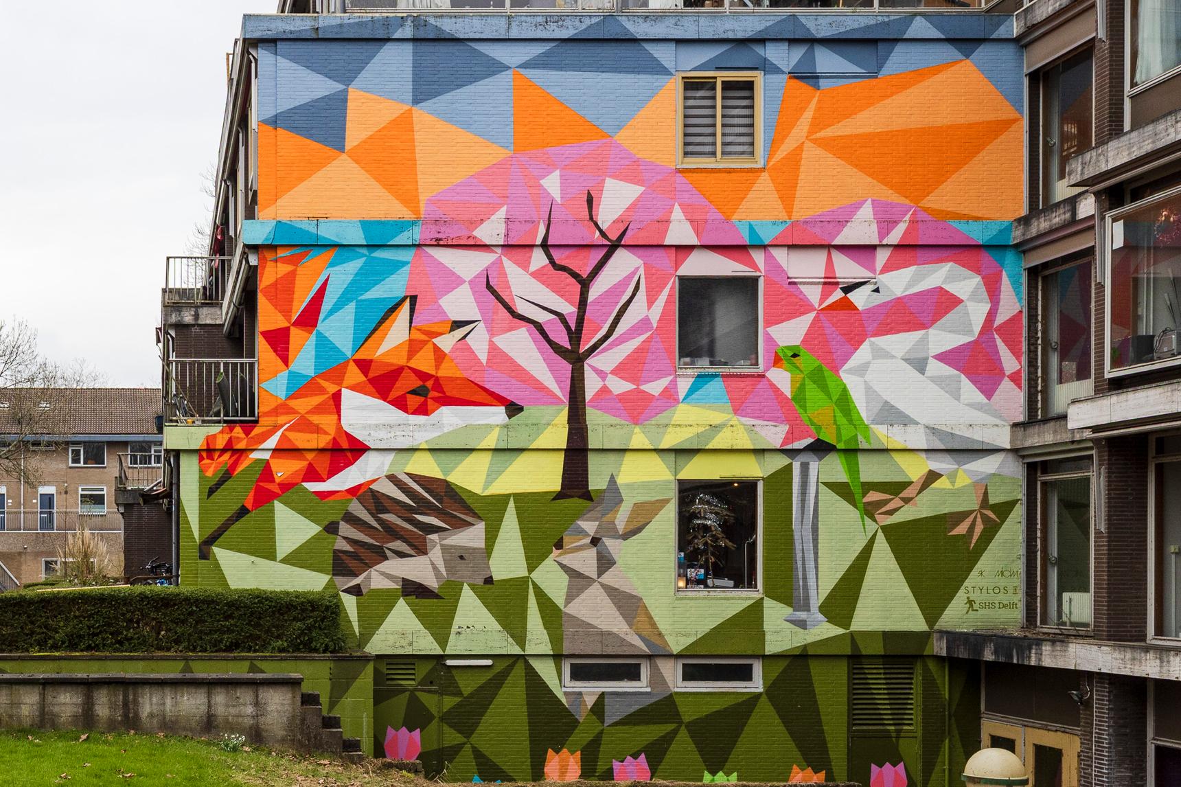 A contest was thrown to decide who could paint the wall of this mixed housing complex called "Abtswoude Bloeit!". The winner was Stijn Kuijsters and he got to paint his design, with the help of established local artist Micha de Bie.