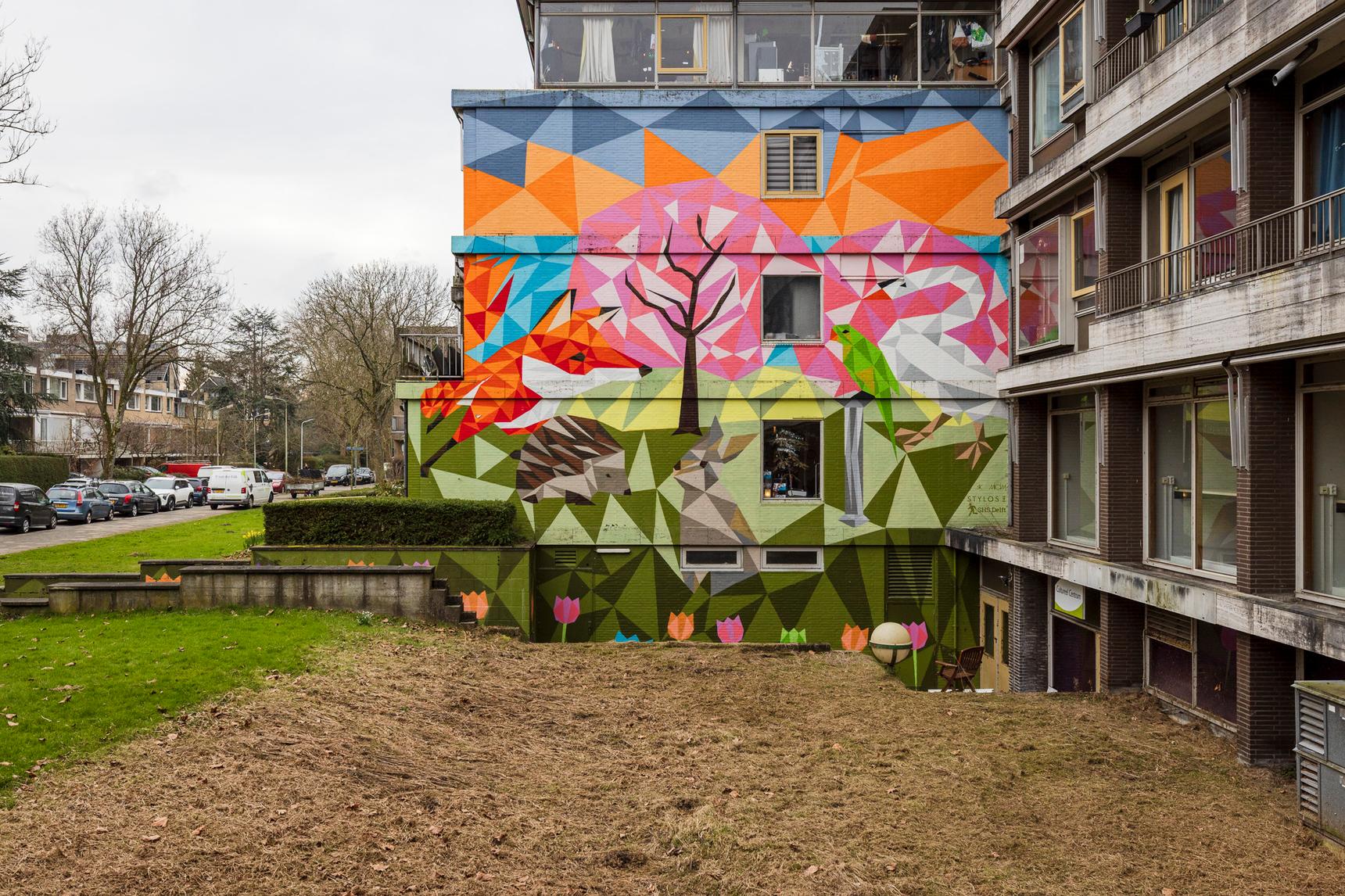 Er werd een wedstrijd uitgeschreven om te bepalen wie de muur van dit gemengde wooncomplex, genaamd "Abtswoude Bloeit!", mocht beschilderen. De winnaar was Stijn Kuijsters, die zijn ontwerp mocht realiseren met de hulp van de bekende lokale kunstenaar Micha de Bie.