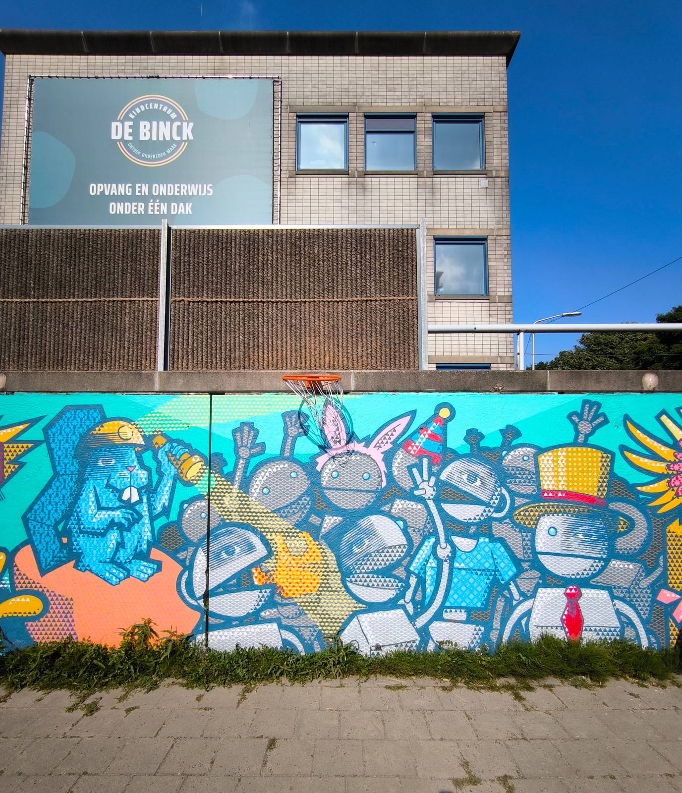 KC De Binck is a new daycare with integrated education and childcare in the Binckhorst, district The Hague for children from 0 to 13 years old. Their current building is a temporarily repurposed building in the neighborhood. To brighten up the play area for the school, KC De Binck invited SOGOshow. They gave SOGOshow complete creative control, not even wanting to see a design because KC De Binck loved being surprised every day that SOGOshow had worked. Of course the only request was to make something suitable for a children's playground.