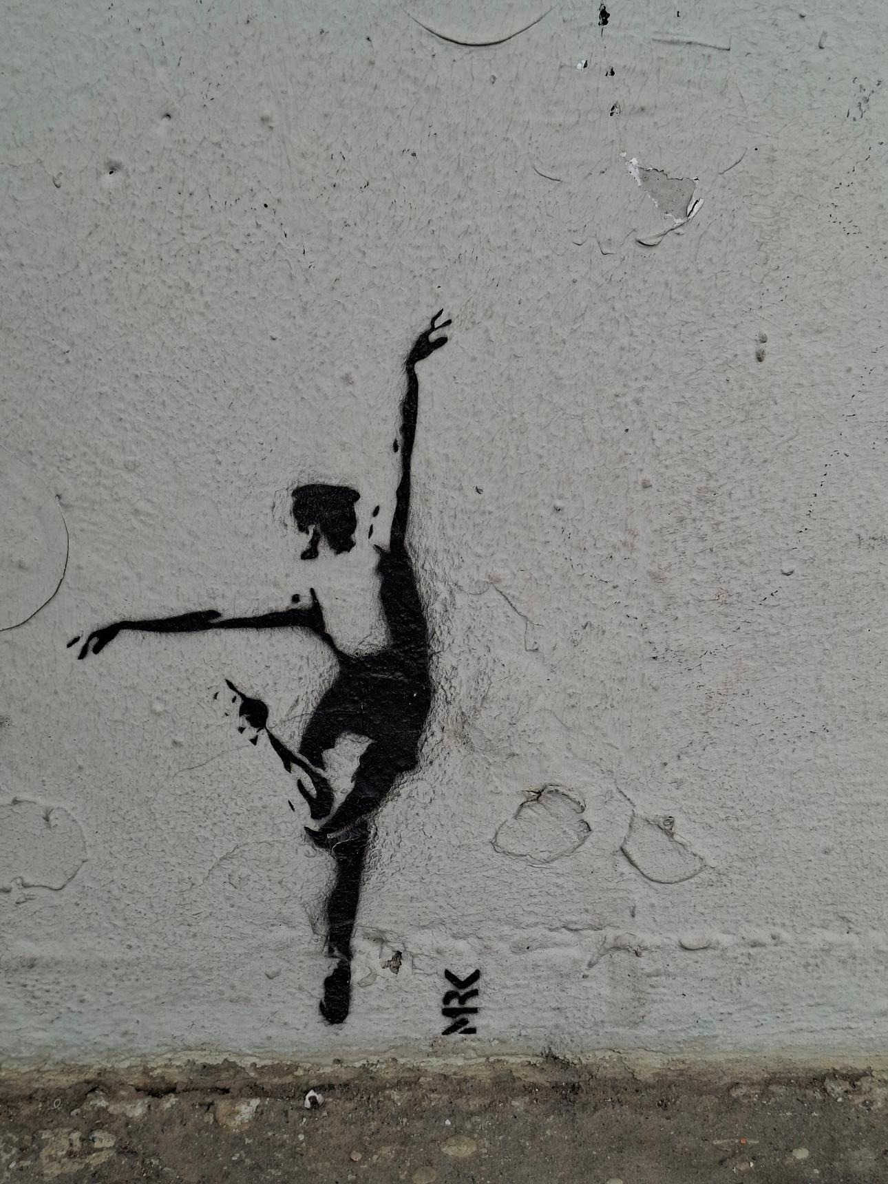 A sprayed dancer on the wall. On of many art pieces in this place.