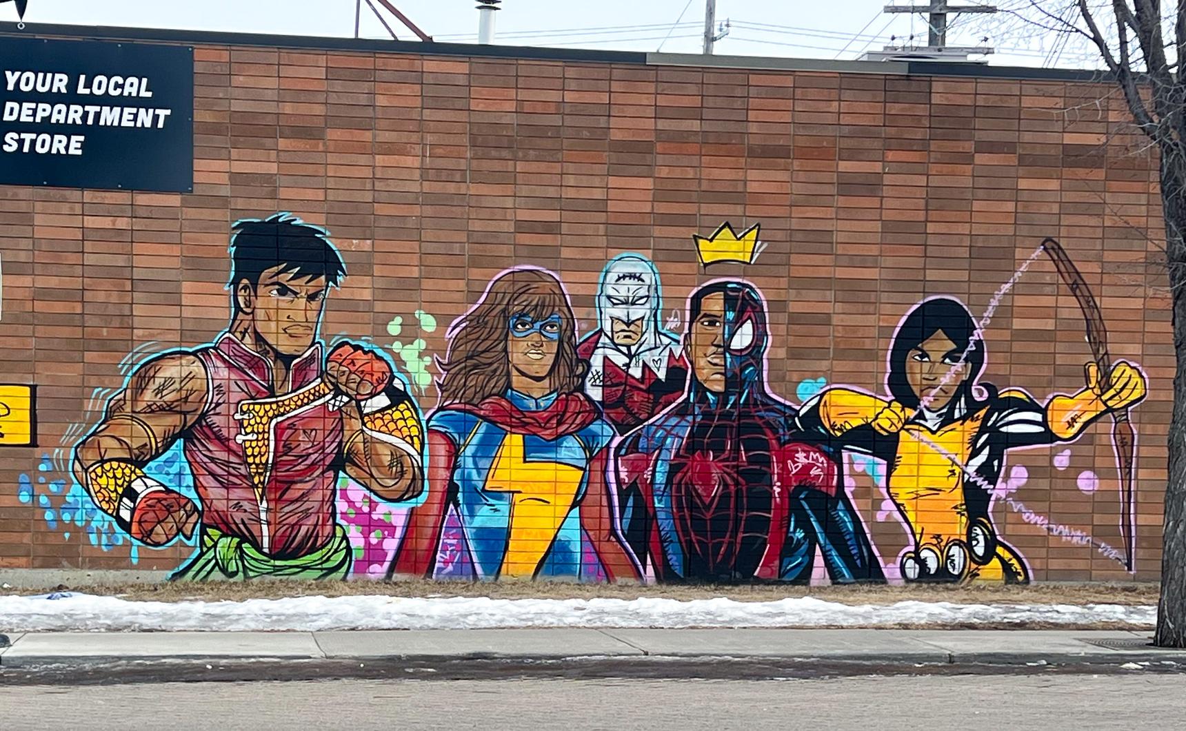 Mural created on the side of a dollar store celebrating some of the diversity seen both in Edmonton and through comic book characters.