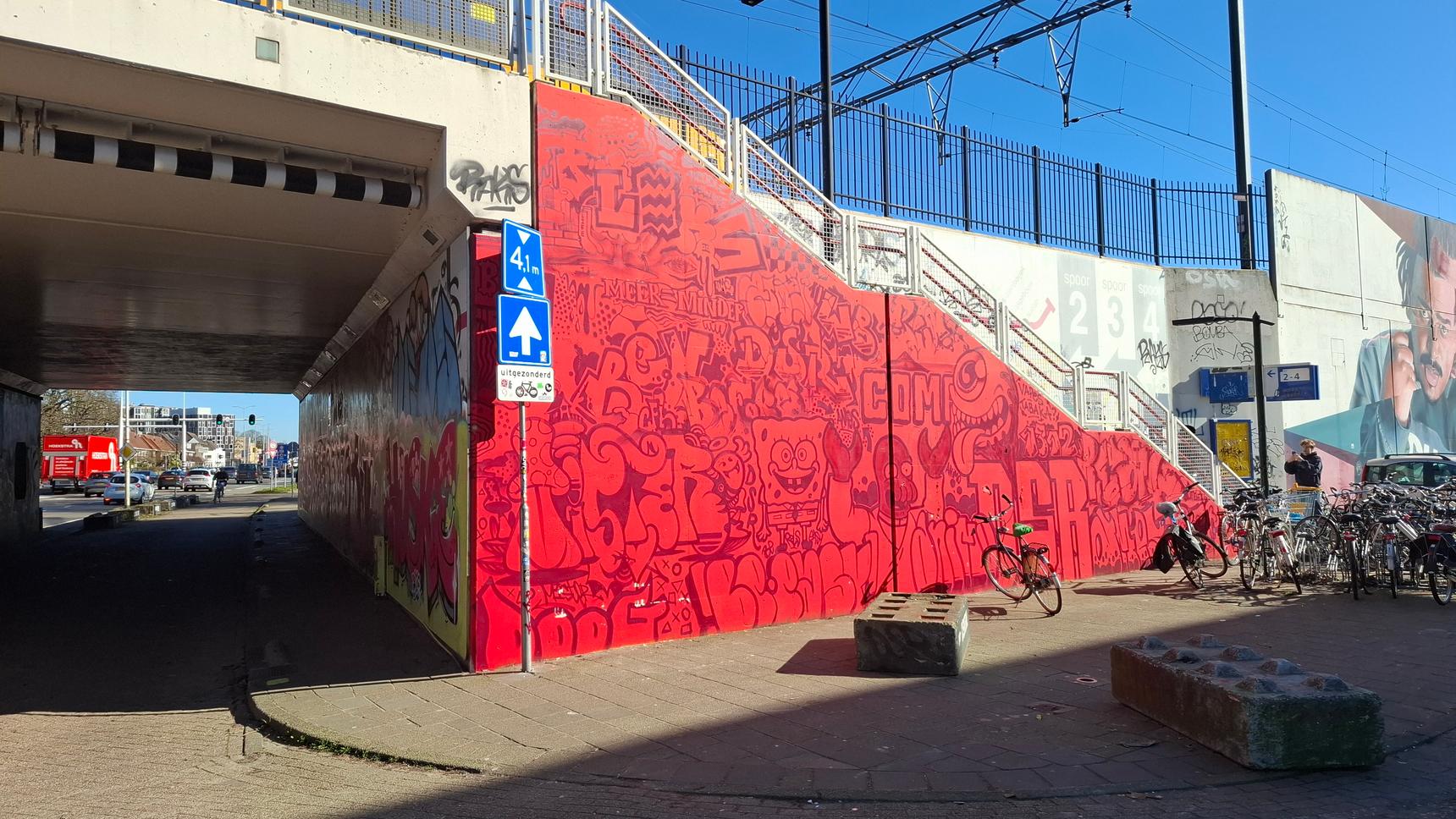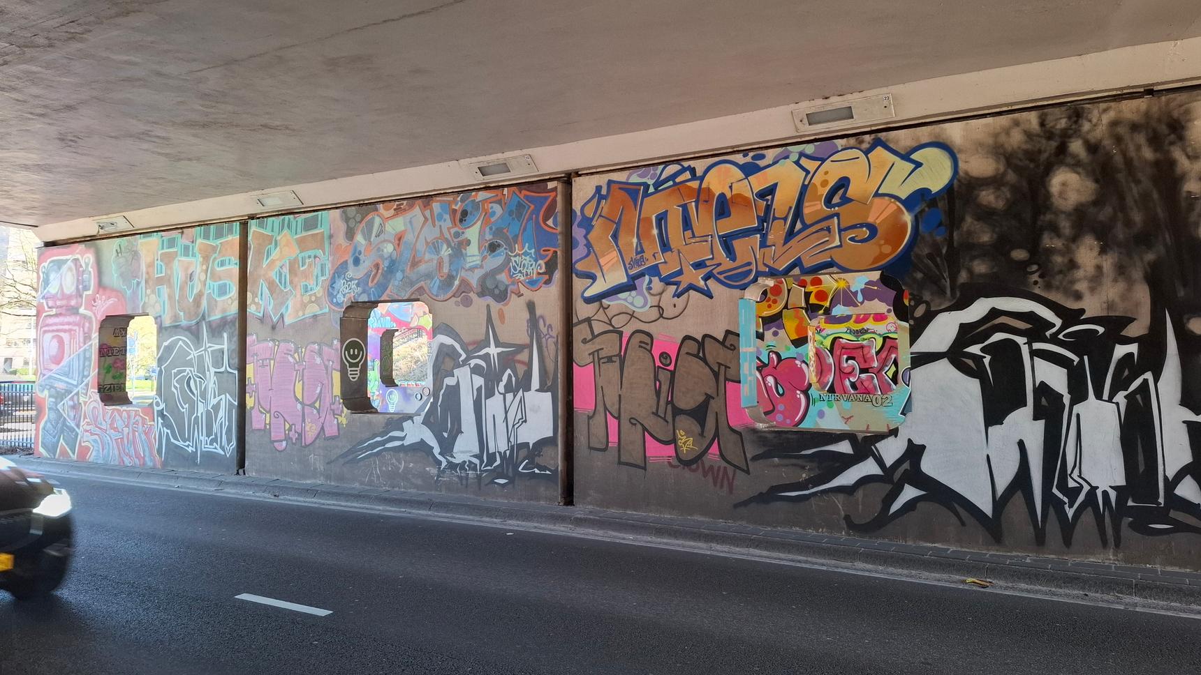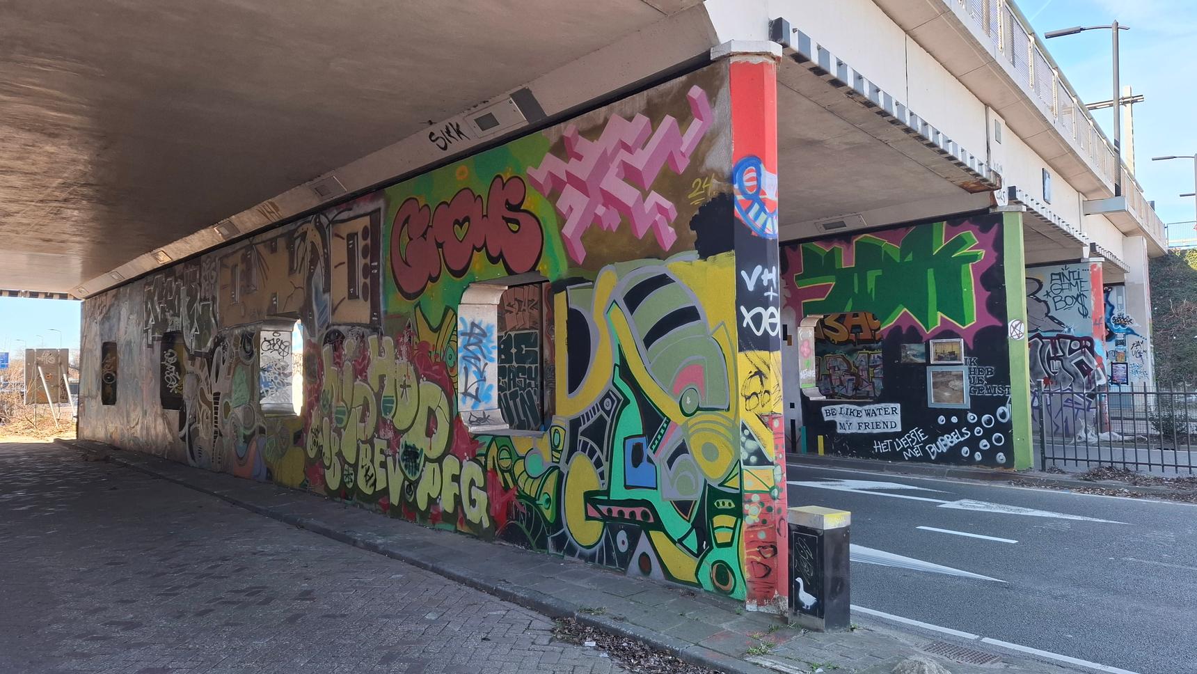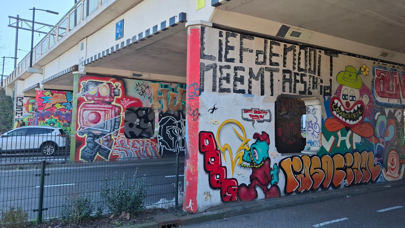 A colorful compilation of various artists on a busy Eindhoven train overpass.