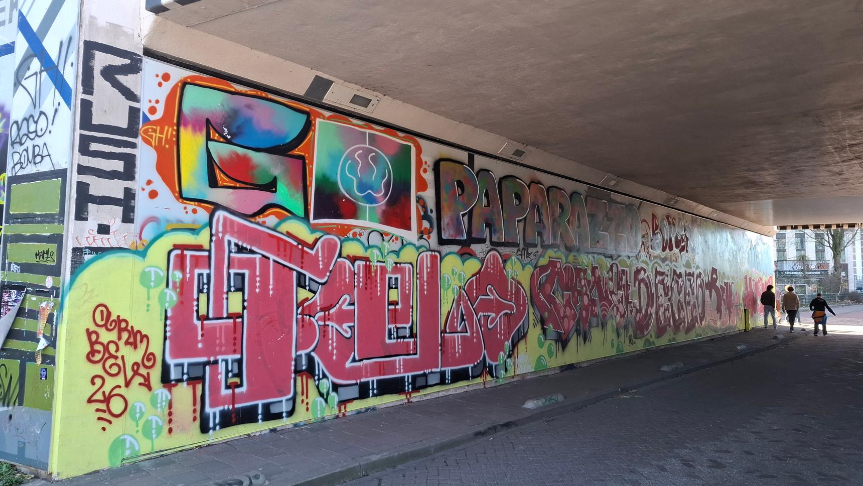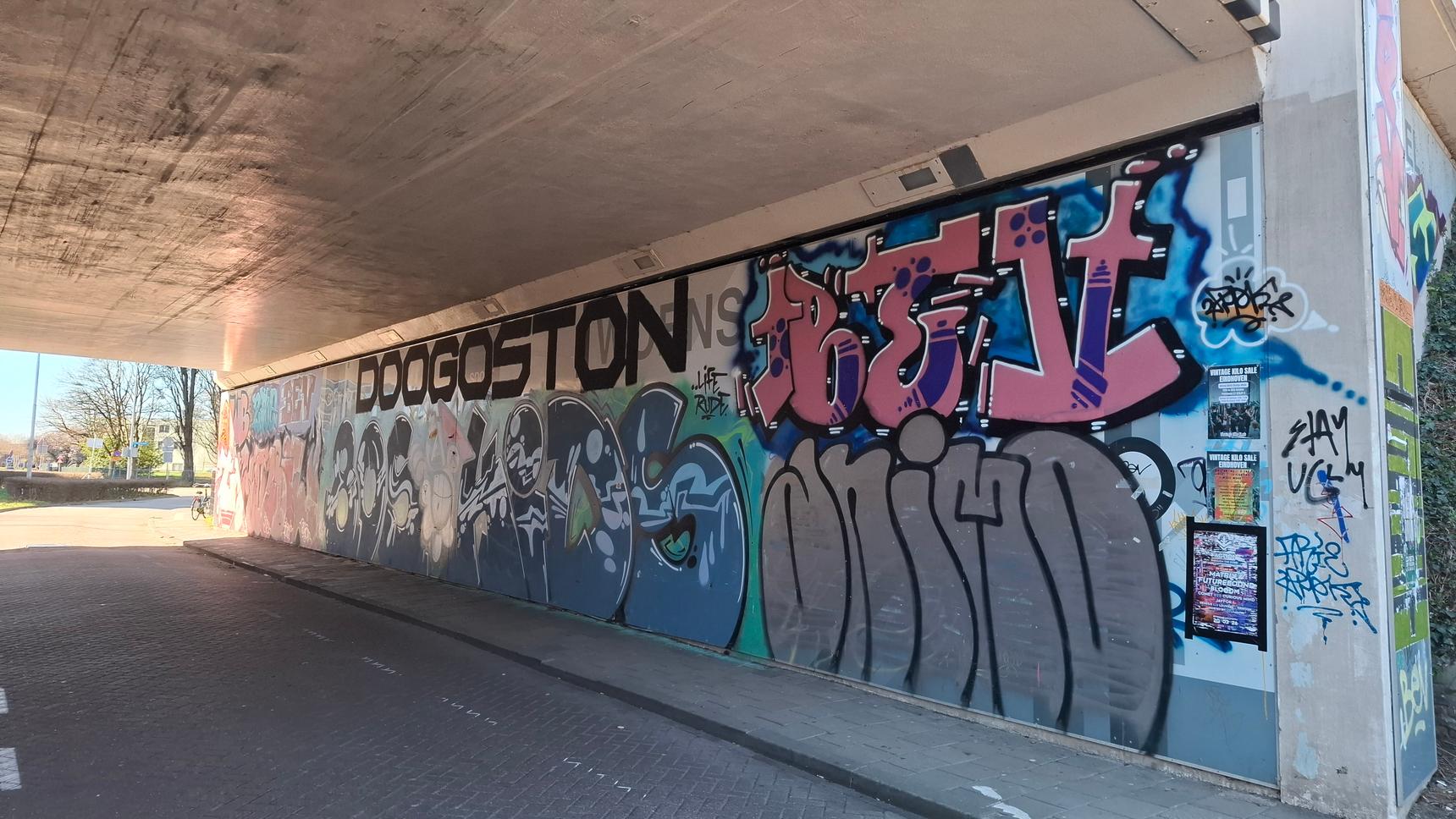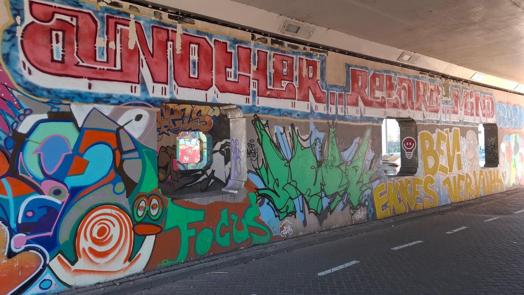 A colorful compilation of various artists on a busy Eindhoven train overpass.