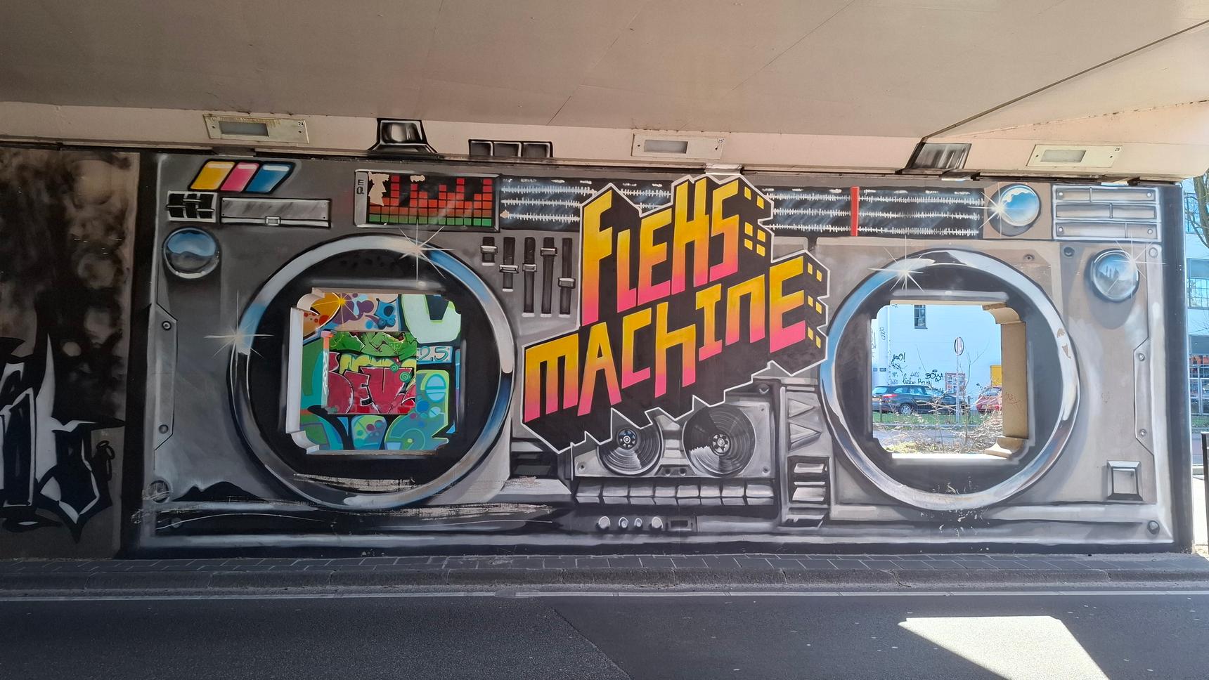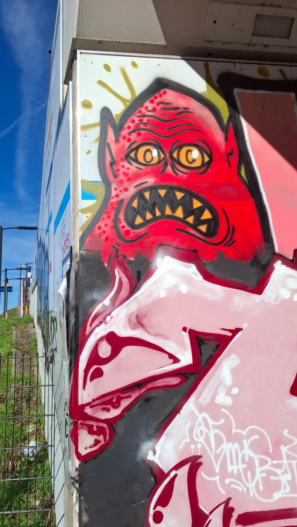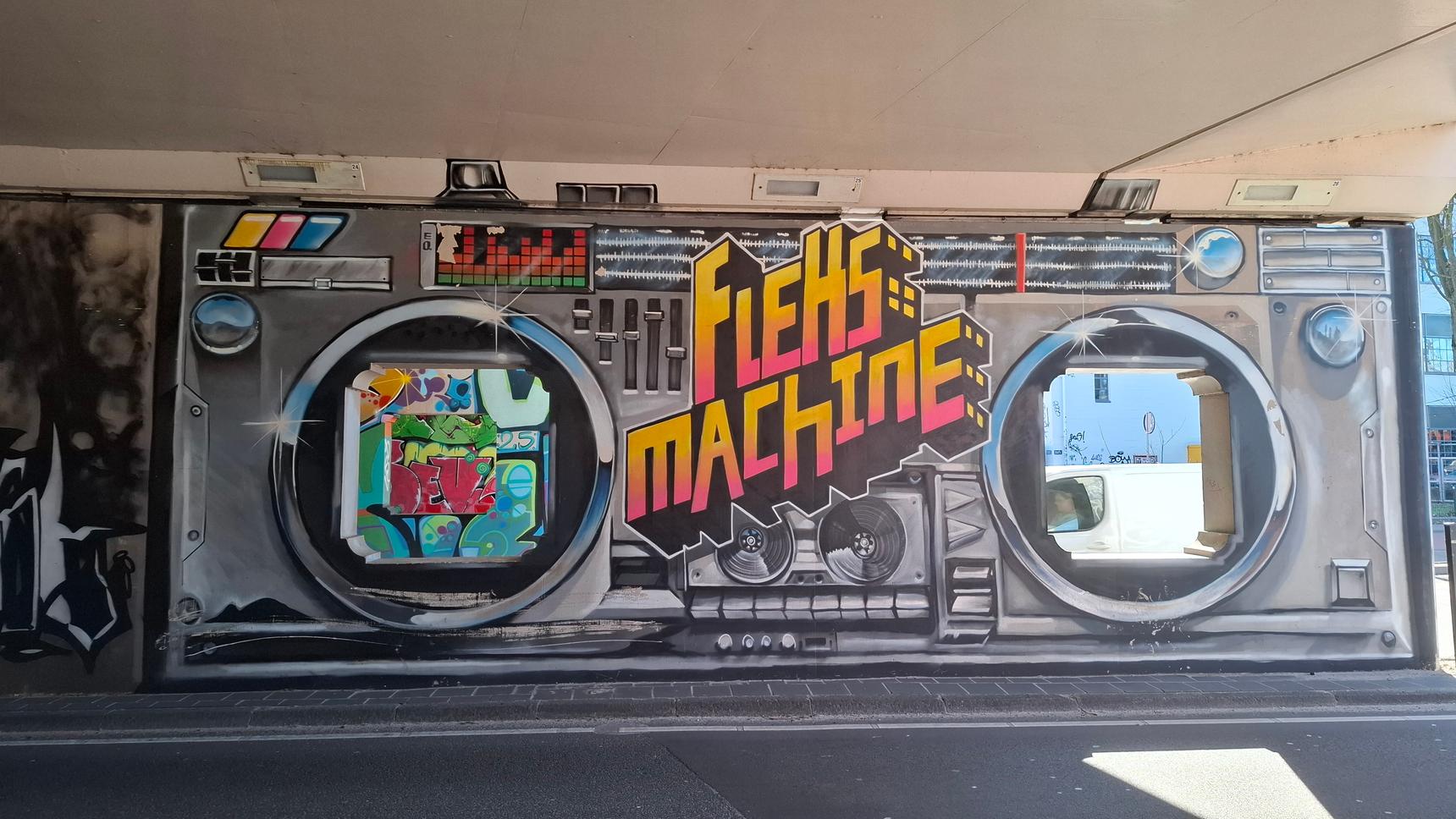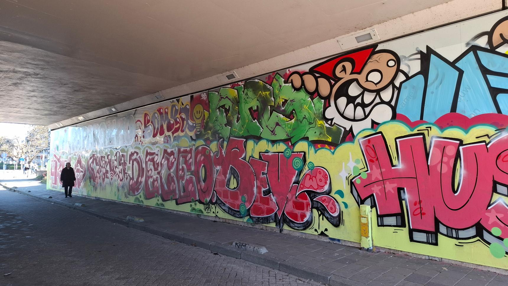 A colorful compilation of various artists on a busy Eindhoven train overpass.