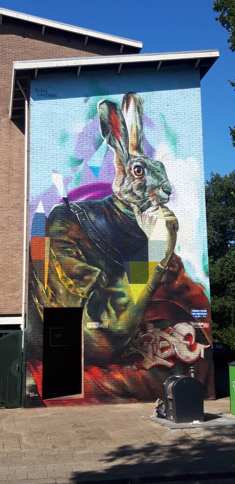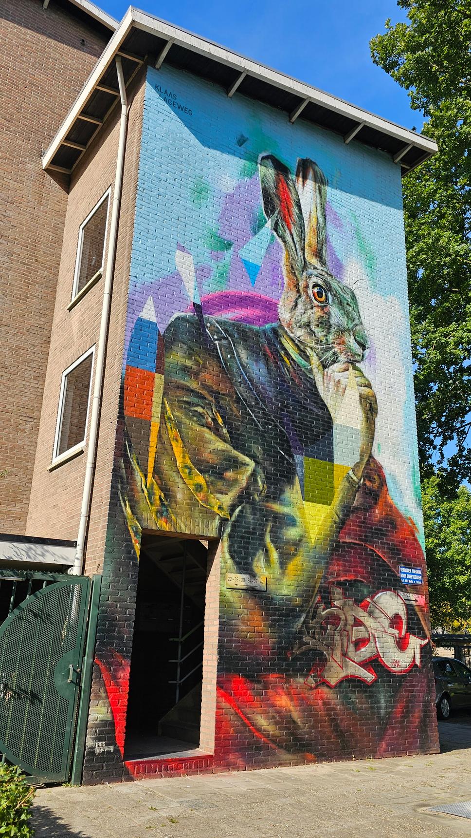 The artwork is a self-portrait of Ferdinand Bol, but with a hare’s head, because Ferdinand himself often painted hares in his works. The posture and clothing reference the self-portrait. The hare is a nod to the still lifes featuring dead animals from his era. The artist turns that classic motif on its head. The animal looks at you as if it were alive. With this, artist Klaas Lageweg aims to emphasize the transience of life.