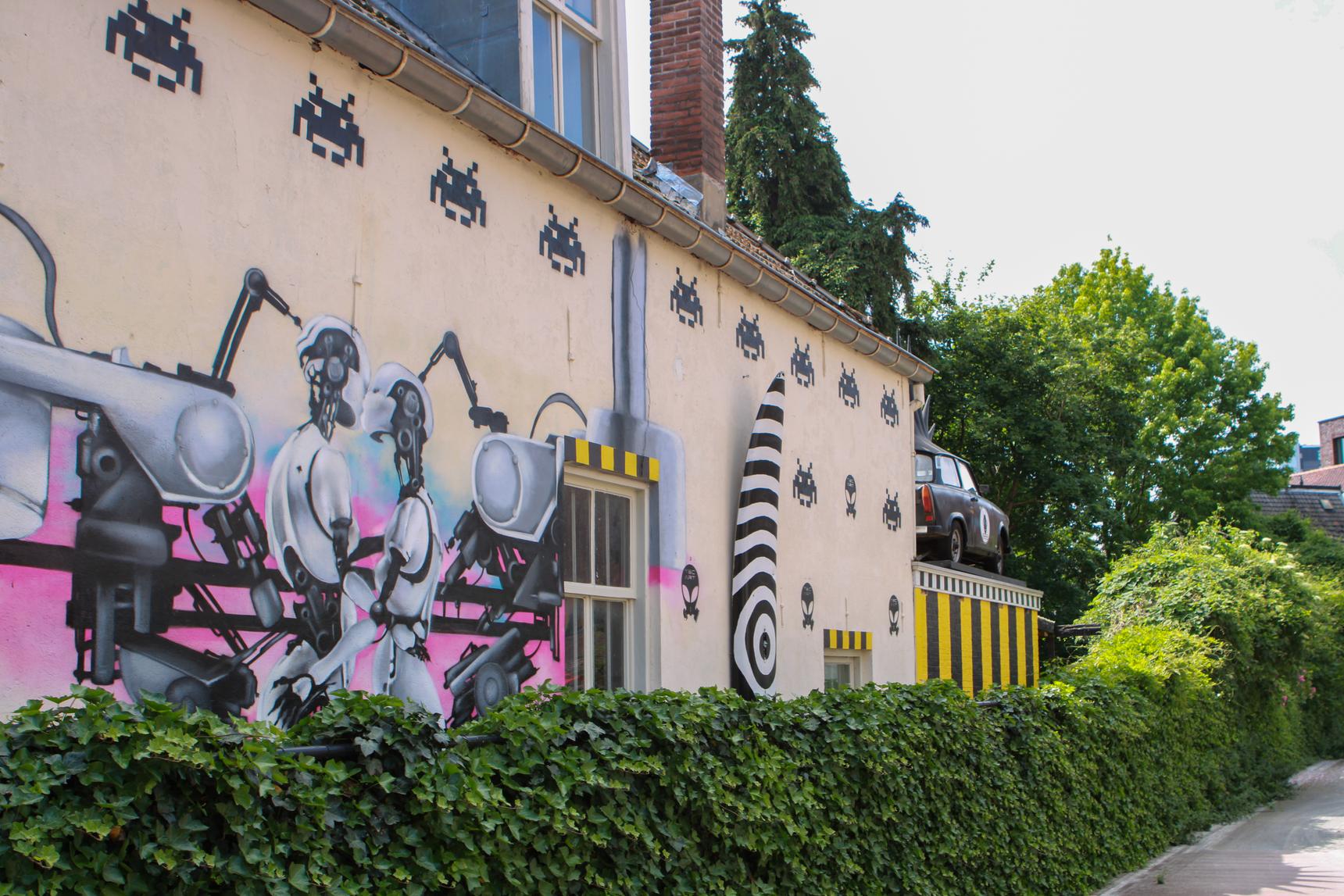 Young creatives can meet at the PLANETART Medialab building. PLANETART is a collective of artists active in technology, media, popular culture, music, experimentation, and activism. The organization is known for, among other things, the GOGBOT festival, The Spacebar, The Museum of the Future, and WARP Technopolis. After the renovation in 2019, regional artist Marco de Vries set to work on the wall of PLANETART. Commissioned for the project, Marco created a still image from Björk’s famous music video, “All Is Full of Love.” The music video was directed by Chris Cunningham and was quite impressive for the 1990s. On the wall of PLANETART, two robots can be seen passionately kissing each other, while the machine is assembling their backs.