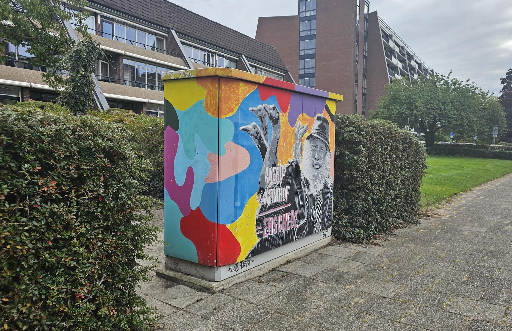 On various transformer boxes, you can see portraits of well-known Enschede residents. These boxes were painted by Huub Filart and Sandra van Wezel. They painted portraits of well-known Enschede residents to beautify the neighborhood. Not only was composer Harry Bannink immortalized, but vagrant Arend Kerkhof, poet Willem Wilmink, and comedian Henk Elsink were also given a spot.