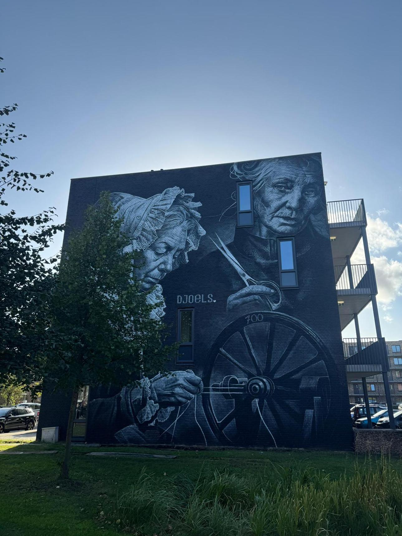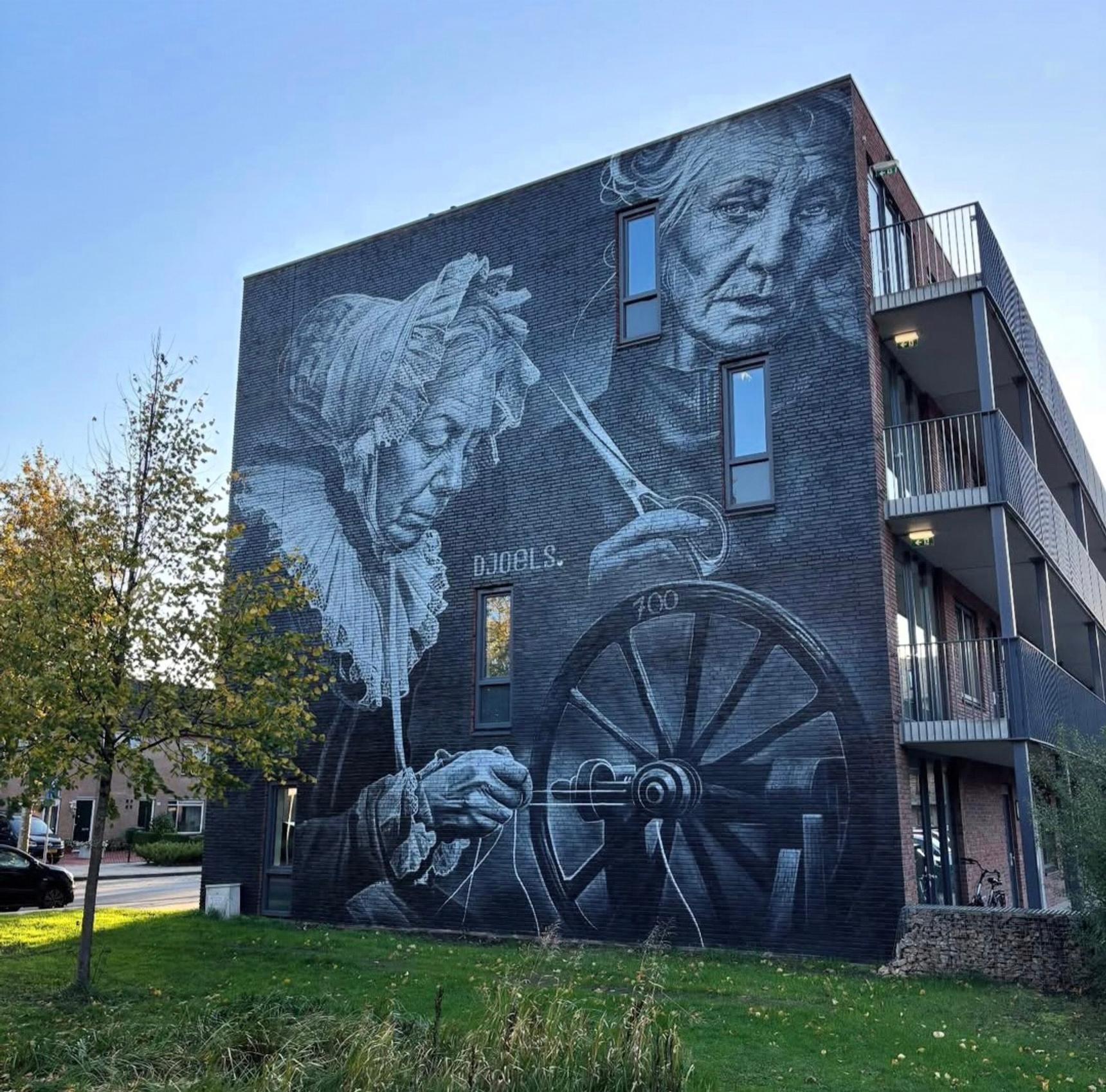 Aan deze gevel schittert een indrukwekkende muurschildering van de Belgische kunstenares Djoels. Twee krachtige vrouwen en een spinnewiel vertellen hier het verhaal van Enschede als textielstad. Op deze plek stond vroeger de Van Heek Textielfabriek. Bij het honderdjarig bestaan kreeg de fabriek van haar werknemers een reliëf cadeau, ‘de drie Schikgodinnen’, gemaakt door beeldhouwer Paul Grégoire. Dit reliëf sierde jarenlang de hoofdingang van de nieuwe weverij. Djoels liet zich inspireren door dit werk en vertaalde het erfgoed naar een eigentijds kunstwerk.
