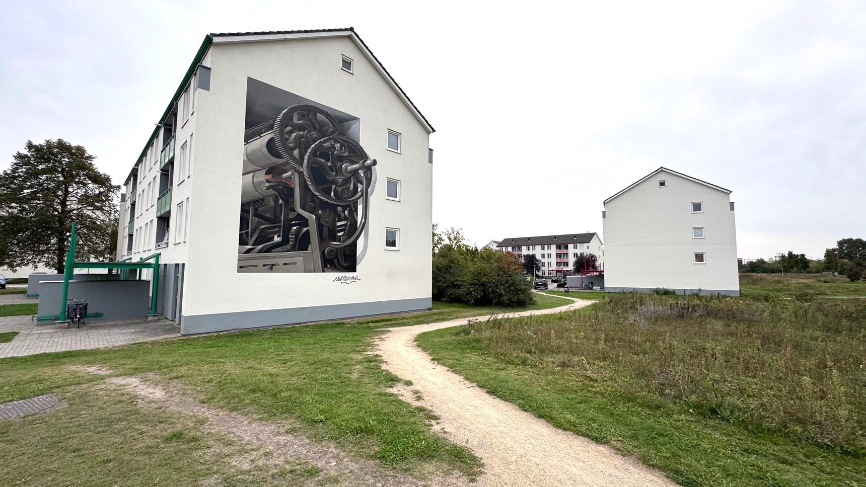 The mural on Bruggenmorsweg tells the story of the textile industry in Enschede. Artist Jan is de Man drew inspiration from De Museumfabriek, where he extensively studied and documented the old looms and machines. This impressive 3D design emerged from those images. The rapid growth of the textile industry heralded the urbanization of Twekkelerveld, just as it did elsewhere in Enschede. The Oosterveld Spinning Mill was one of the major driving forces behind this development. Fun fact: across from this amazing artwork, you’ll find another piece by Jan is de Man. Can you spot it?