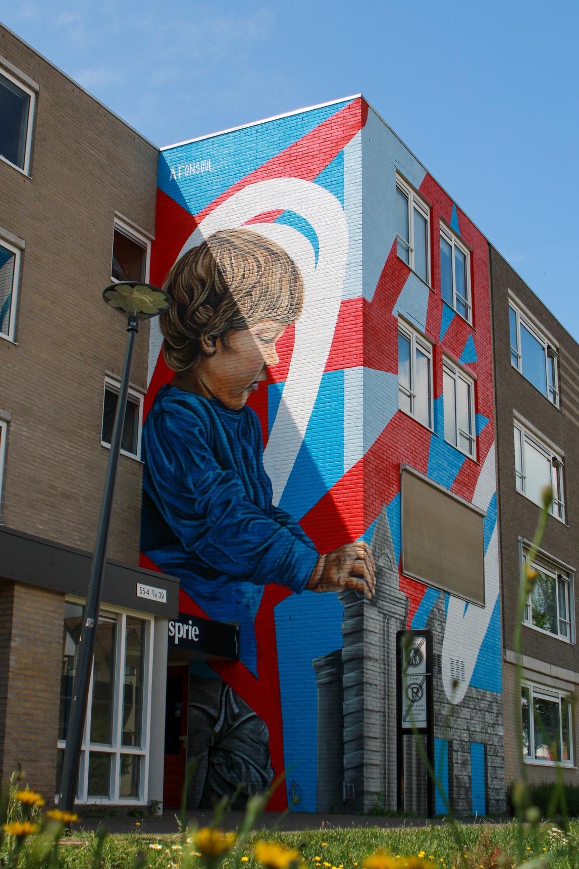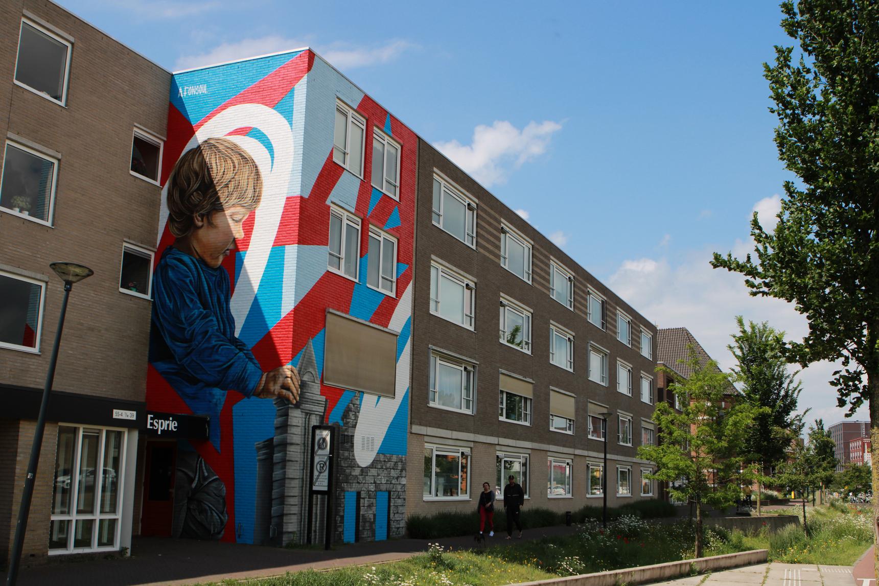 This artwork depicts the connection between the past and the future. It was created in 2024 by Afonsoul from Portugal. He was inspired by the Eschpoort, the historic city gate that once stood here. The artist used this gate as a starting point to explore both the city’s rich history and its promising future. The child appears to be building the city gate, symbolizing that children are the future of the city. If you look closely, you can see the coat of arms of Enschede. Additionally, the colors red, white, and blue are used—both the red of Enschede and the colors of the Dutch flag.