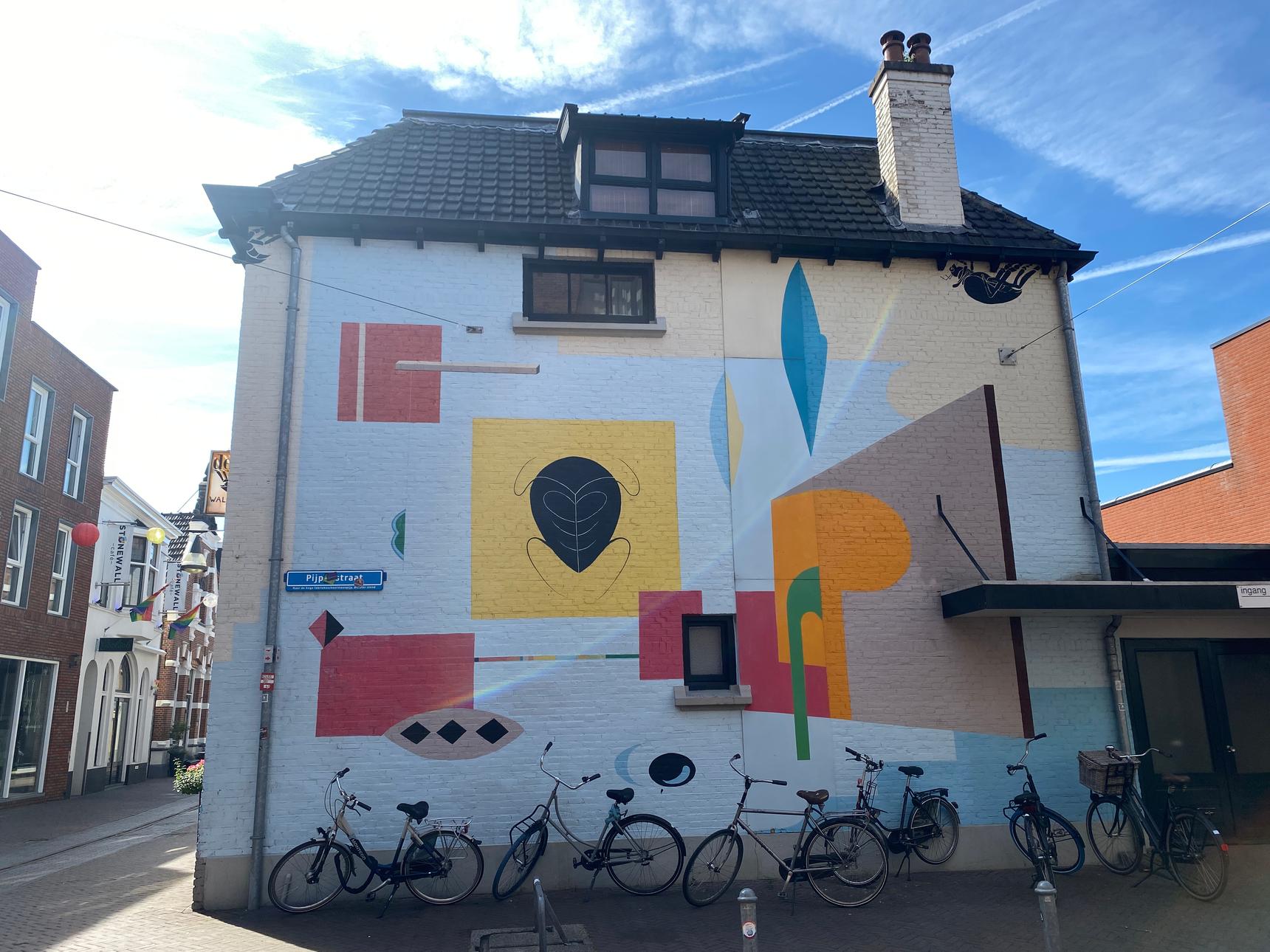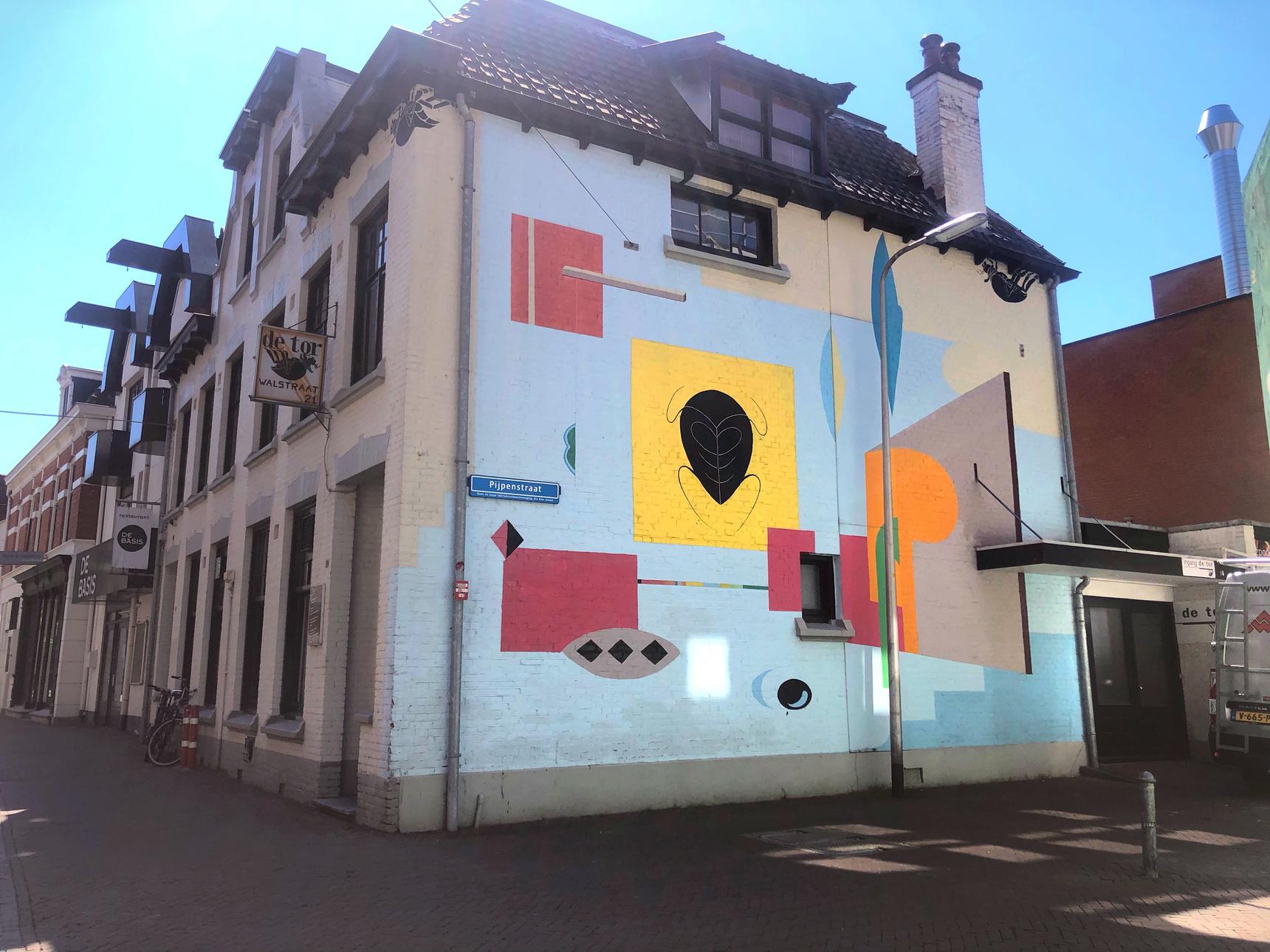 Jazzpodium de Tor, founded in 1970, is one of the oldest jazz clubs in the Netherlands. Many great names have performed there: Dizzy Gillespie, Dexter Gordon, Chet Baker. One of the regular guest artists is Jasper van ’t Hof, who is particularly well-known abroad. The Enschede-born pianist and composer received the Netherlands’ most prestigious jazz award, the Boy Edgar Prize, in 2018 at the age of 71. The distinctive building of Jazzpodium de Tor features an eye-catching mural by Dirk Oeghoede. At the initiative of the Walstraat Working Group, the artist created a connection in 2005 between the city’s slogan, the unique character of the De Tor building, and the freedom and creativity of jazz music. In the center of the colorful scene is an abstracted tower within a yellow field. The jazz venue’s logo is visible in the upper right corner.