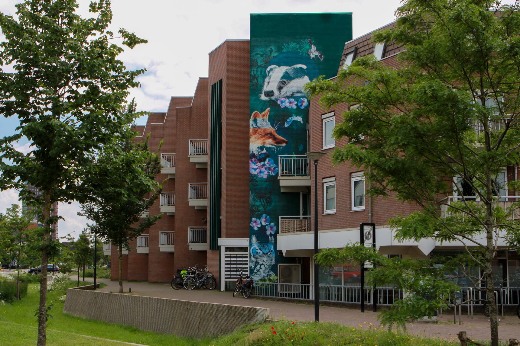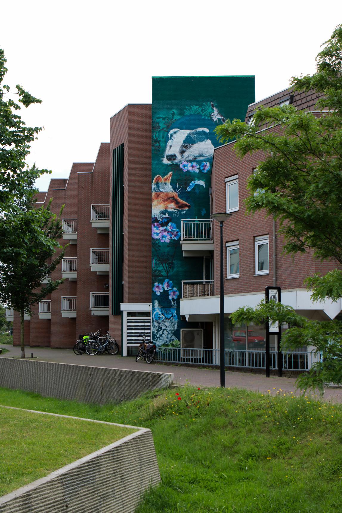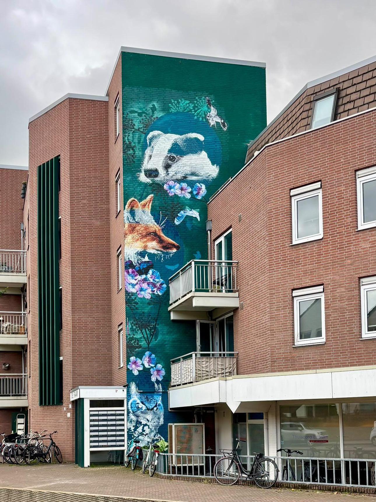 In 2023, Oldenzaalsestraat welcomed a unique piece of art—literally from a different perspective. Created by Nina Paintina from Enschede, her green mural adds not only color but also meaning. The artwork blends seamlessly into Enschede’s green surroundings, a place where people and animals coexist. If you look closely, you’ll also see a flax flower, a nod to the city’s textile history. And then there’s a playful twist. Across from the artwork is a Polaroid, and that connection isn’t a coincidence. The artwork was created as a “positive” image. But as soon as you switch your phone to negative mode, the artwork changes completely. Give it a try!