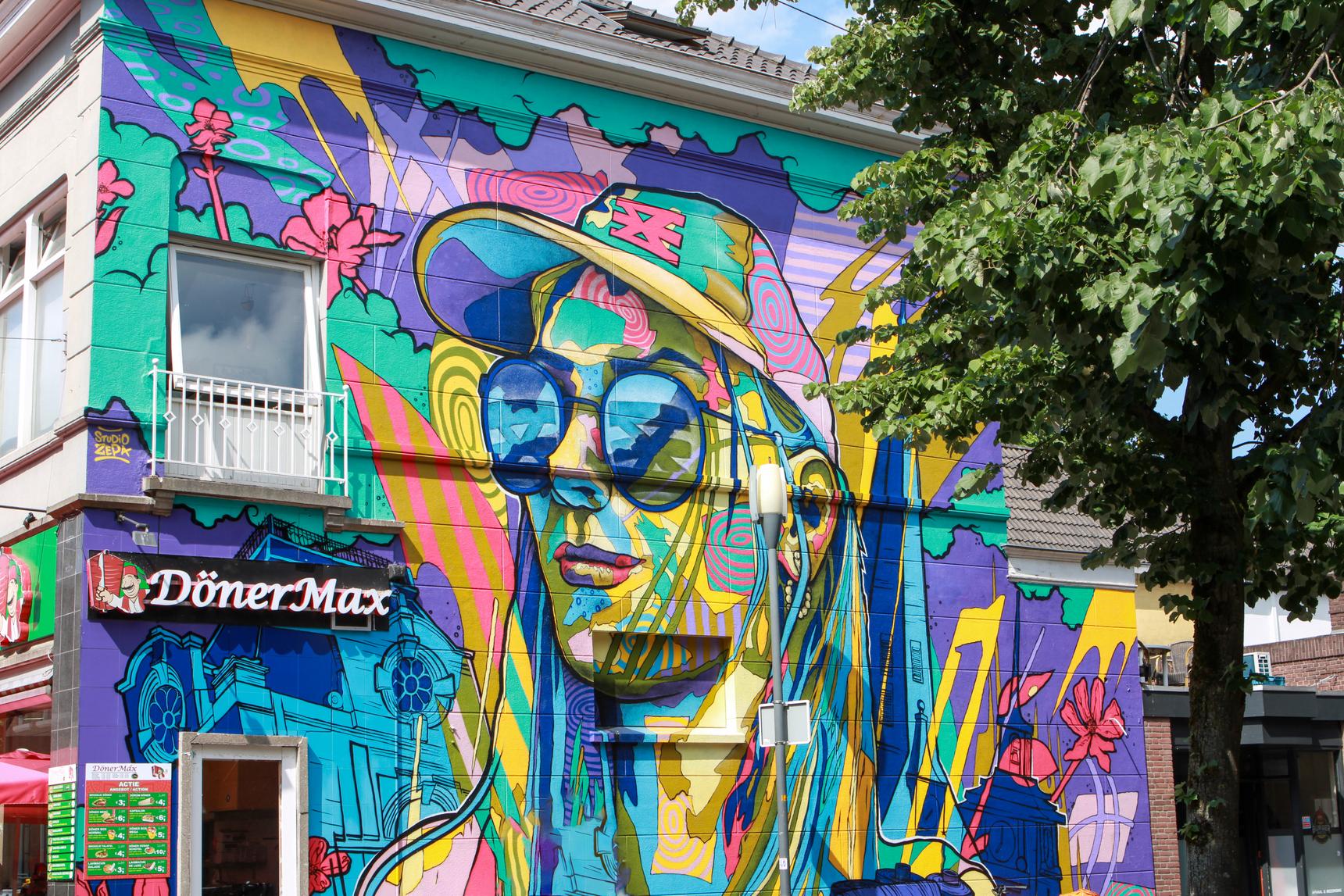 The colorful mural on the building reflects the feeling you get when you visit Enschede. At the same time, you can see elements that make up the DNA of Enschede. The character is a confident, young woman with a touch of adventure, a spirit of sportsmanship, and a thirst for discovery. A work of art full of positive energy. The design features several important architectural landmarks. You can see the Jannink Factory Complex, the tower of the Grote Kerk on the left, and the Lasonderkerk on the right. This brings Enschede’s history to life and allows you to discover the city in a colorful way. Enschede’s coat of arms is depicted in the reflection of the glasses, suggesting a bright future. The rolls of cotton thread refer to Enschede’s textile history. The entire design is “sewn” together with colors and patterns inspired by textile fabrics. The artwork was installed in 2023 by Studio ZEPA, an artist duo from South Africa.