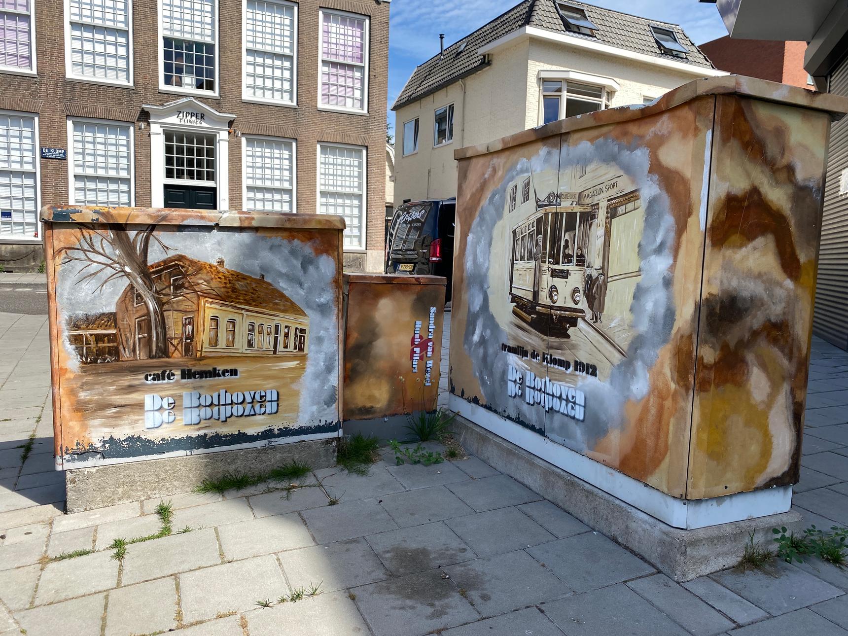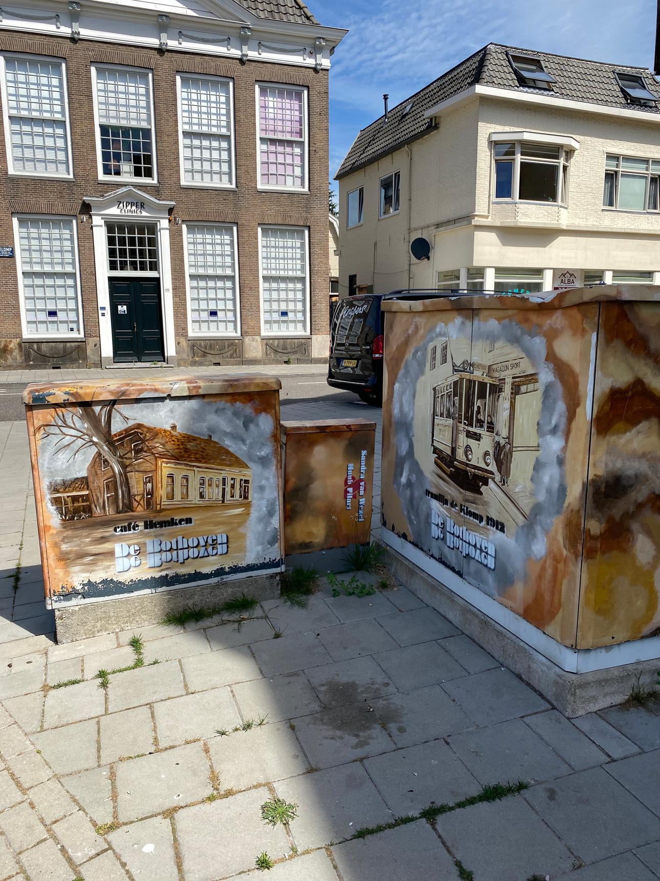 Earlier in this route, we introduced you to the initiative by the De Bothoven neighborhood council: the painted transformer boxes. Since then, many more of these boxes have been transformed into mini-works of art. In this way, a collective of young artists is bringing the story of Enschede to life, right in the heart of the neighborhood. The boxes you see here were created by Sandra van Wezel and Huub Filart. They depict the history of De Bothoven.