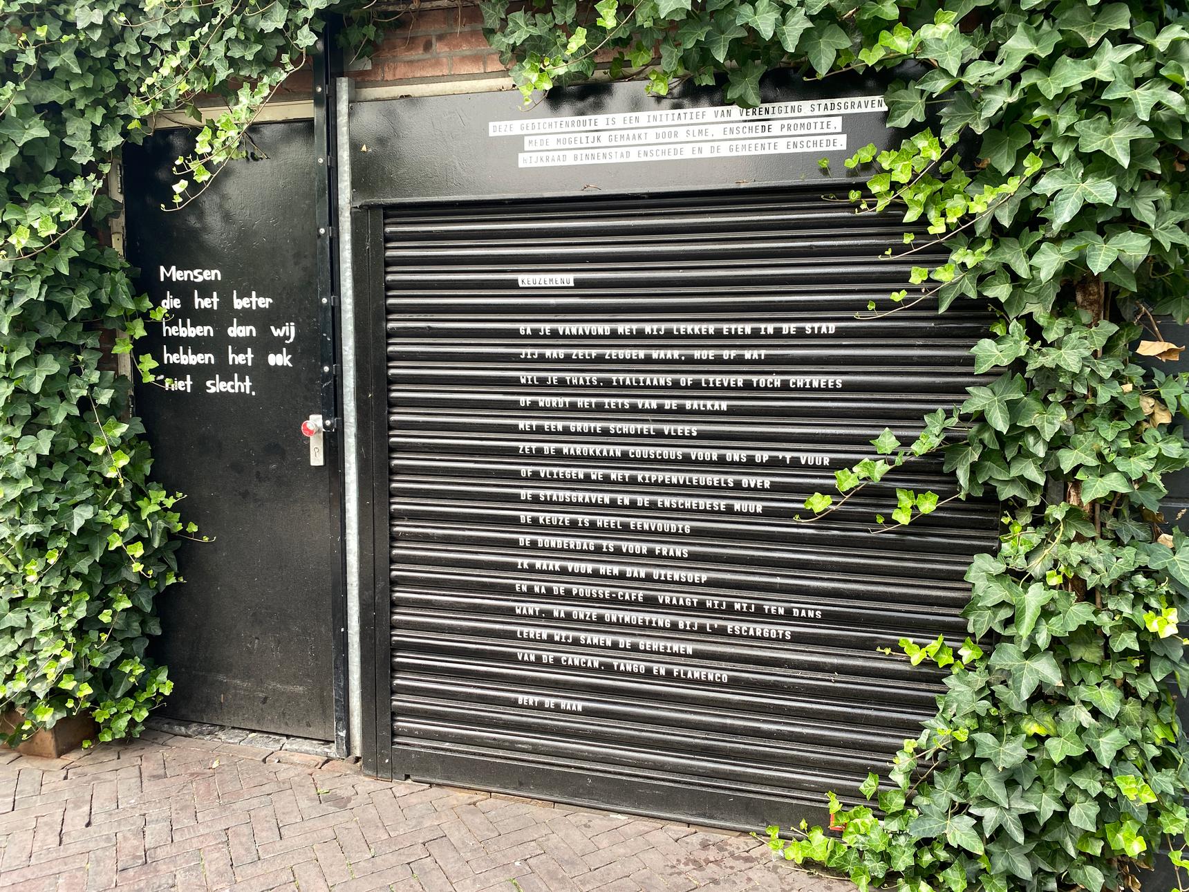 In 2021, poems were painted on various walls, doors, gates, and facades along Stadsgravenstraat. The ten poems were created specifically for the street by DIE, Poets in Enschede. The initiative aims to make and keep the street welcoming, safe, and attractive. In addition to the poems, you’ll also find other murals along Stadsgravenstraat.