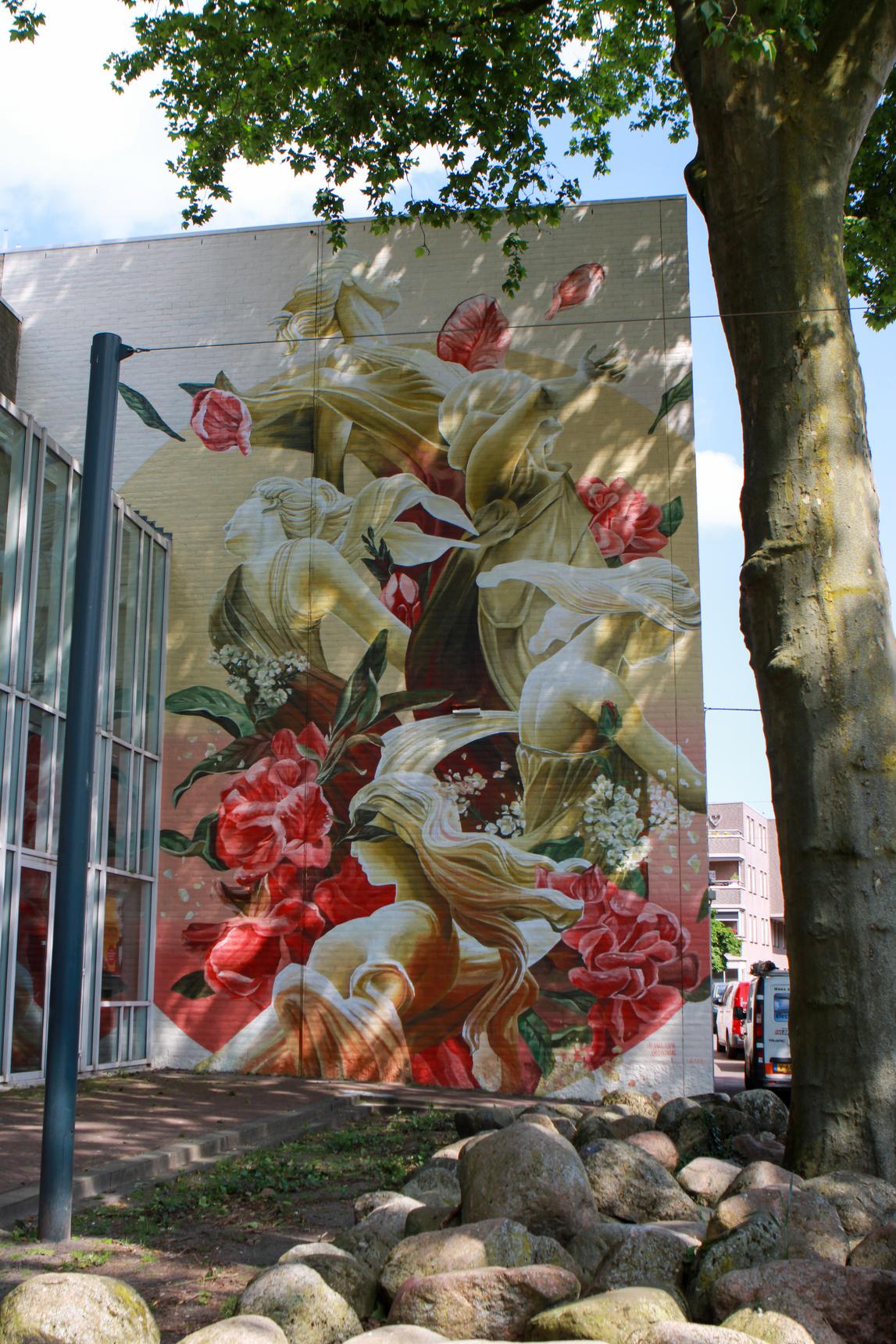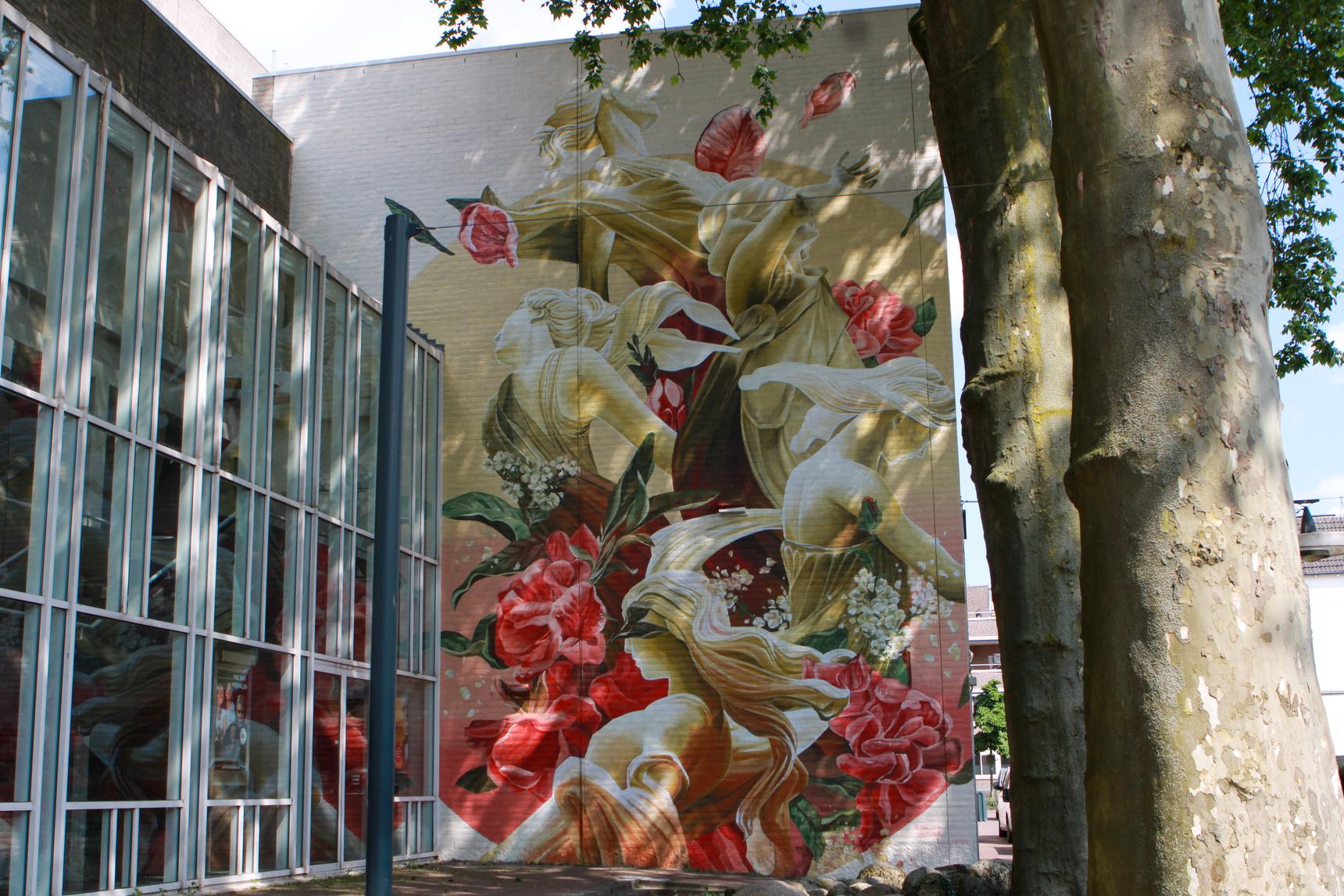 This wall is located exactly between the Enschede Music Center and the ArtEZ Conservatory. This artwork by Spanish artist Jabier Landa was completed in 2024 and is inspired by the muses of Pan, the god of music, who sits on the roof of the conservatory just around the corner. There is a muse of music and a muse of theater. The muses are surrounded by flowers. These flowers symbolize the artists who blossom here and have the space to flourish in Enschede. Finally, there is a little secret hidden in the artwork. Can you find it?