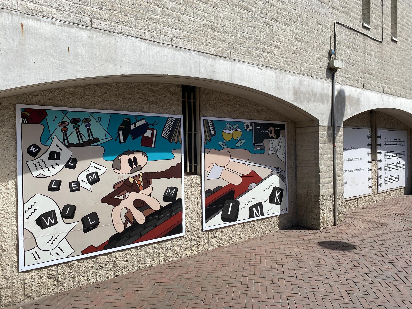 De Enschedese cartoonist en grafisch designer LUVANE heeft op de muur van het ArtEZ Conservatorium de samenwerking van het uiterst productieve duo Willem Wilmink en Harry Bannink in beeld gebracht. Willem achter de schrijfmachine, hij wilde niet aan een computer, en Bannink achter de piano. Terwijl Willem’s tekst nog nat is en Harry de toon nauwelijks heeft gezet, staan de zangers al klaar om te zingen.