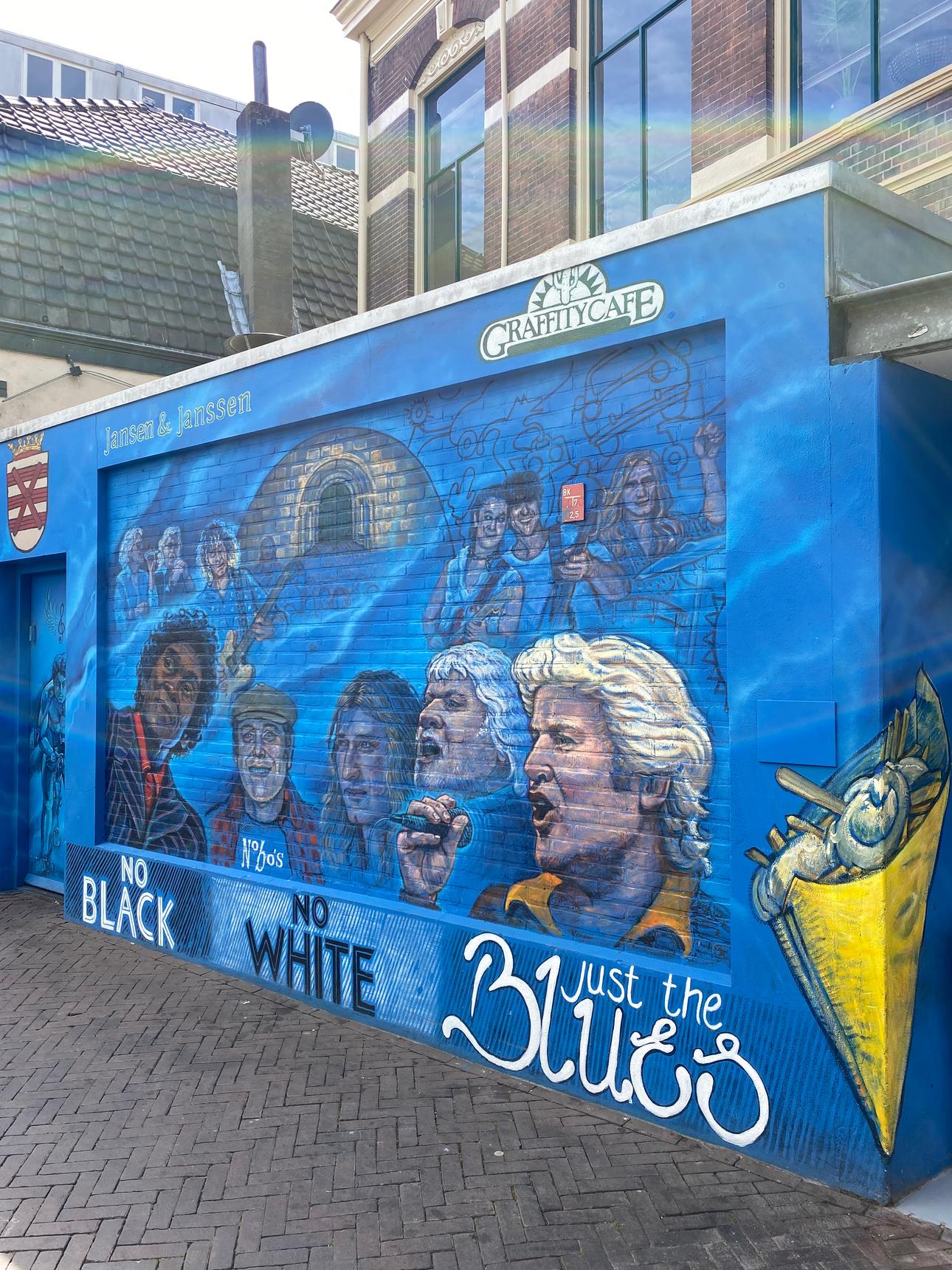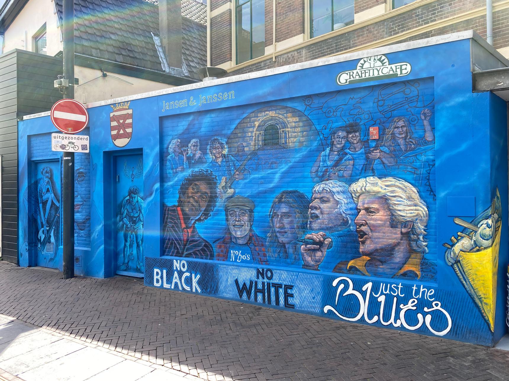 Enschede-based artist Sonna Krom has brought Enschede’s musical history to life through a mural on Stadsgravenstraat. Enschede has always been a vibrant city. In the 1980s and 1990s, for example, there was plenty of live music. In this artwork, you can see the Nobo’s Blues Band, a band that has been around for over 40 years. Here you can see Robert Pillage and, to his right, the three Timmer brothers. The one on the far right, Cor Timmer, even received a royal honor for his active commitment to blues music in Enschede. The man on the far left is Robert “Bilbo” Walker Jr., a renowned American blues musician who has performed at Enschede’s “Memphis Heart ‘n Soul Festival.” Thanks to the Industrial Revolution, a unique bond developed between Enschede and the city of Memphis, something that is reflected in the painting. Enschede was a major textile city, and Memphis was an important supplier of cotton. Just after the war, the mayor of Memphis even sent food packages and financial aid to Enschede. A true Enschede story: textile beats, blues, cotton, and music.
