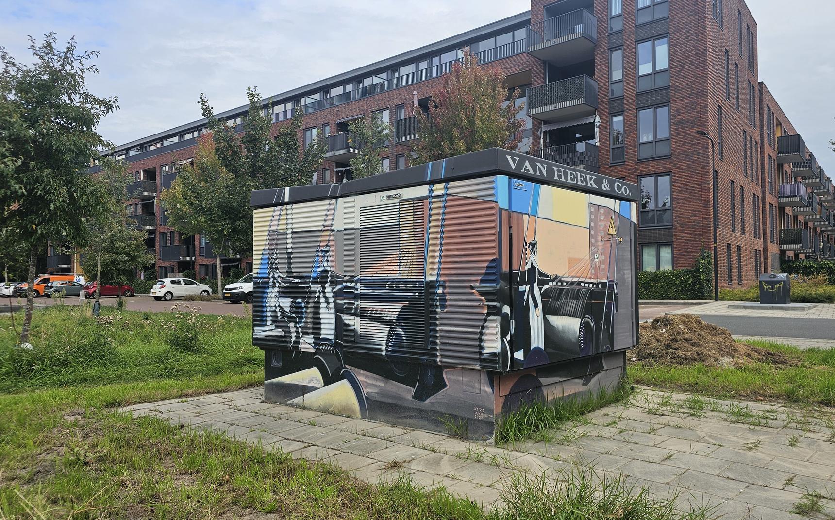 Long ago, the machines of Van Heek & Co.—one of Enschede’s leading textile families—clattered away here. Their factories and looms put the city on the world map. This painted transformer house brings that rich history to life. With intricate details of looms and workers, the artwork tells the story of Enschede, the textile city.