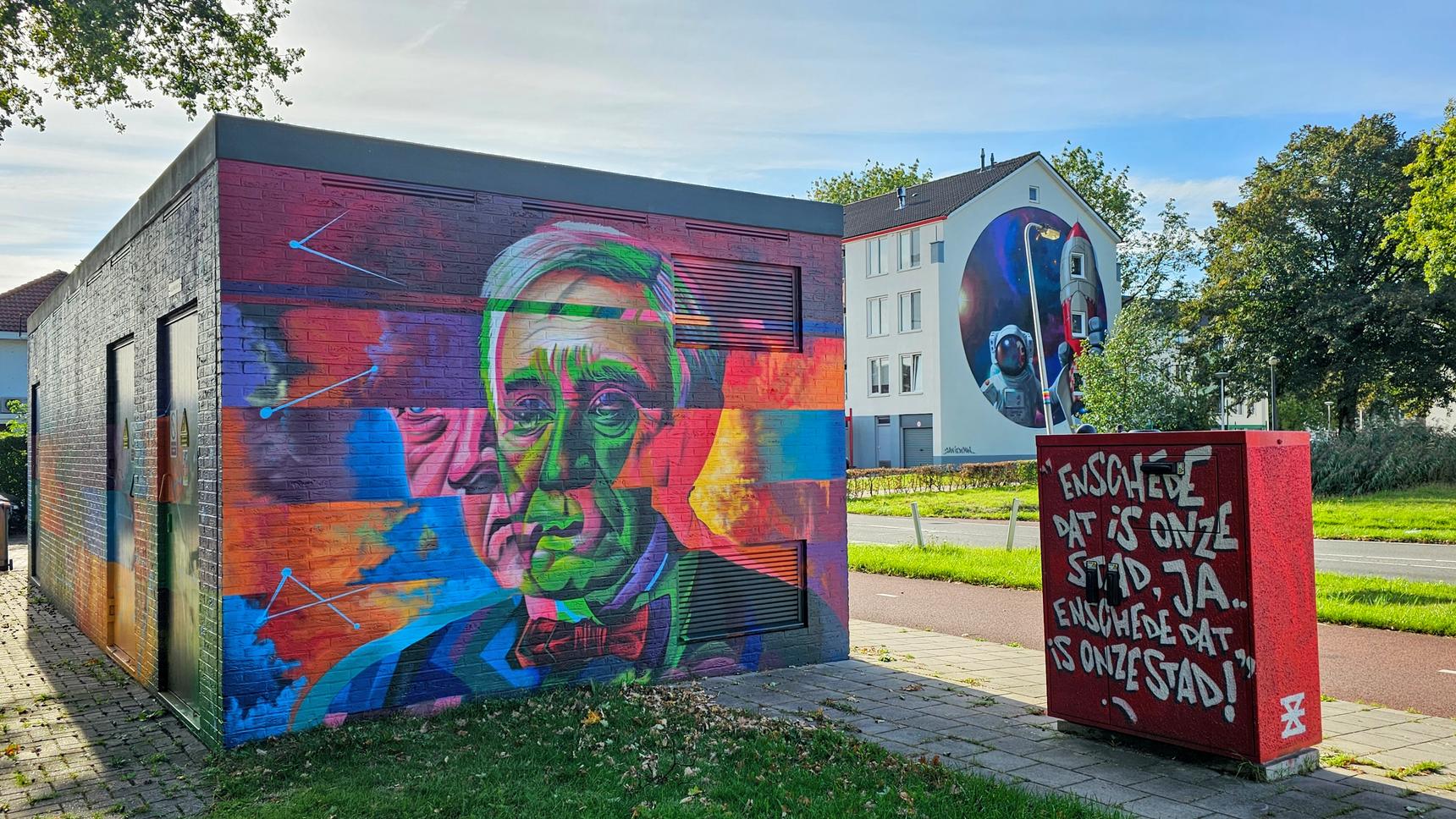 Aan de rand van het Twekkelerveld staat een kleurrijk beschilderde stroomkast die twee grootheden tot leven brengt: Albert Einstein en Thomas Edison. Einstein verschijnt, omringd door zijn beroemde formules, op de lange zijde. Edison prijkt zichtbaar vanaf de kruising op de korte kant. De lichtblauwe achtergrond laat formules en vormen subtiel doorlopen en legt de nadruk op de vernieuwers zelf. Het resultaat is een kunstwerk dat, net als de innovatiecampus, creativiteit, grootsheid en technologische ontwikkeling uitstraalt.