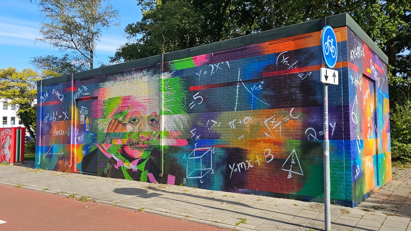 On the edge of Twekkelerveld stands a colorfully painted electrical box that brings two giants to life: Albert Einstein and Thomas Edison. Einstein appears, surrounded by his famous formulas, on the long side. Edison is prominently displayed on the short side, visible from the intersection. The light blue background subtly blends formulas and shapes, drawing attention to the innovators themselves. The result is a work of art that, just like the innovation campus, radiates creativity, greatness, and technological advancement.