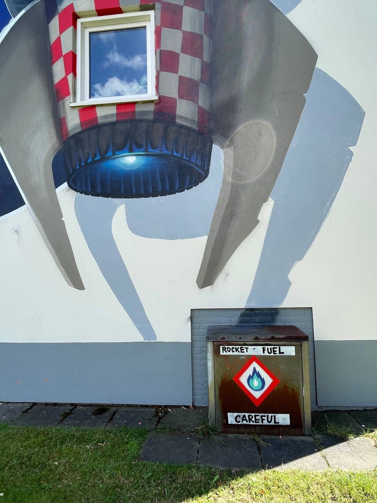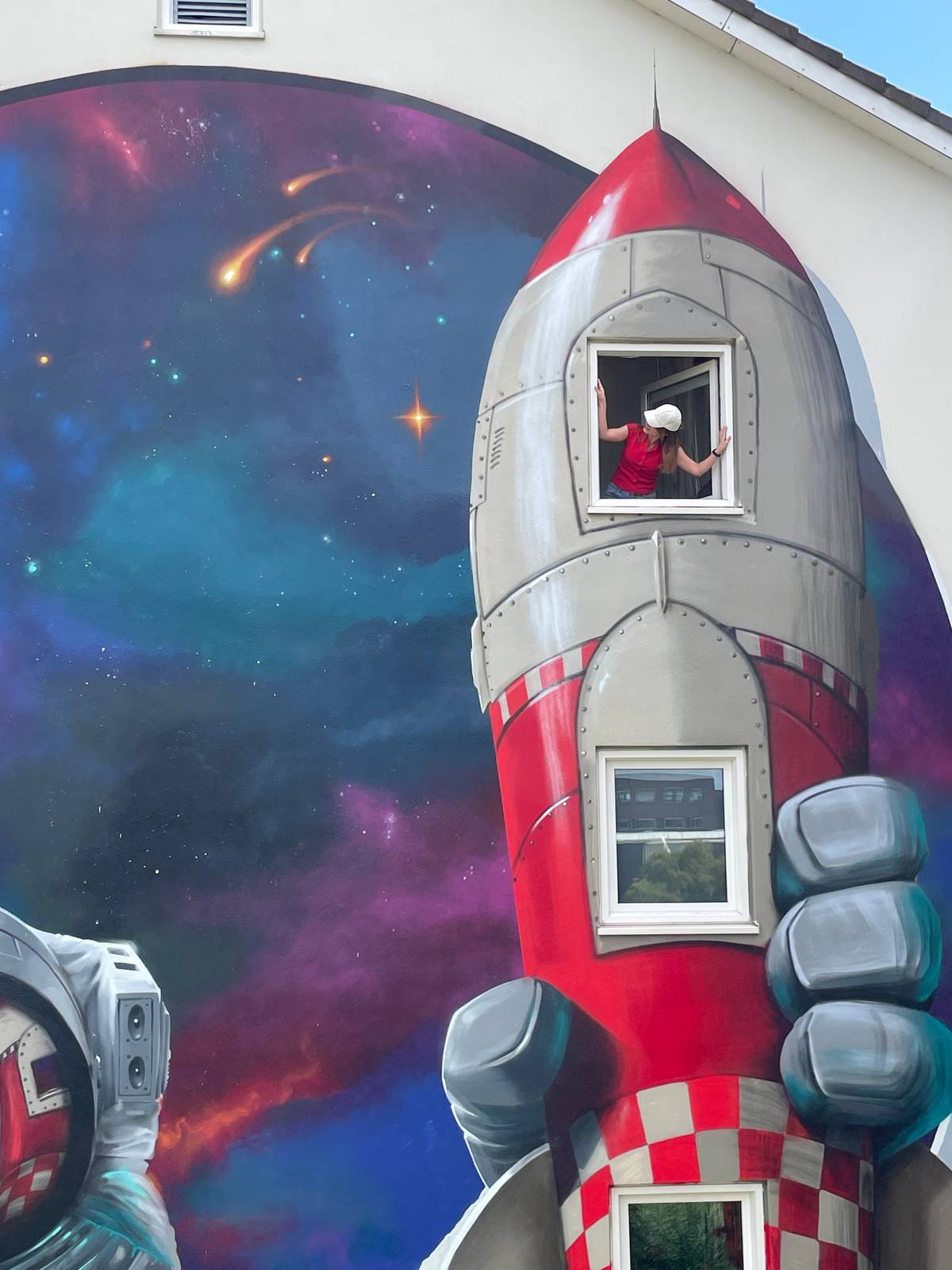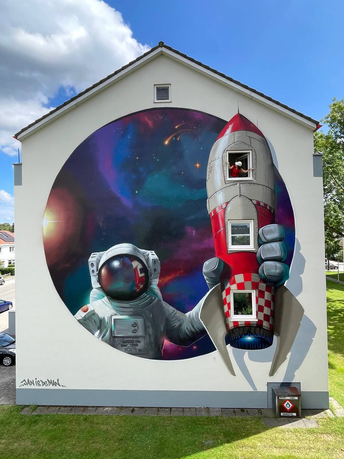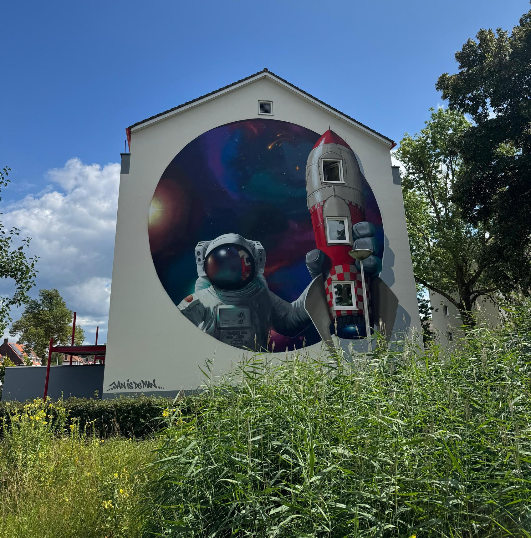 Op de kruising van de Jupiterstraat en Auke Vleerstraat vind je een opvallend kunstwerk van Jan is de Man. Met zijn eigenzinnige stijl van ‘doodles’ en een slim raster op zijn tablet bracht hij in slechts zeven dagen dit speelse ontwerp tot leven. Het resultaat? Een kleurrijke raket met astronaut en ruimte-elementen, een knipoog naar de straatnamen in de wijk.