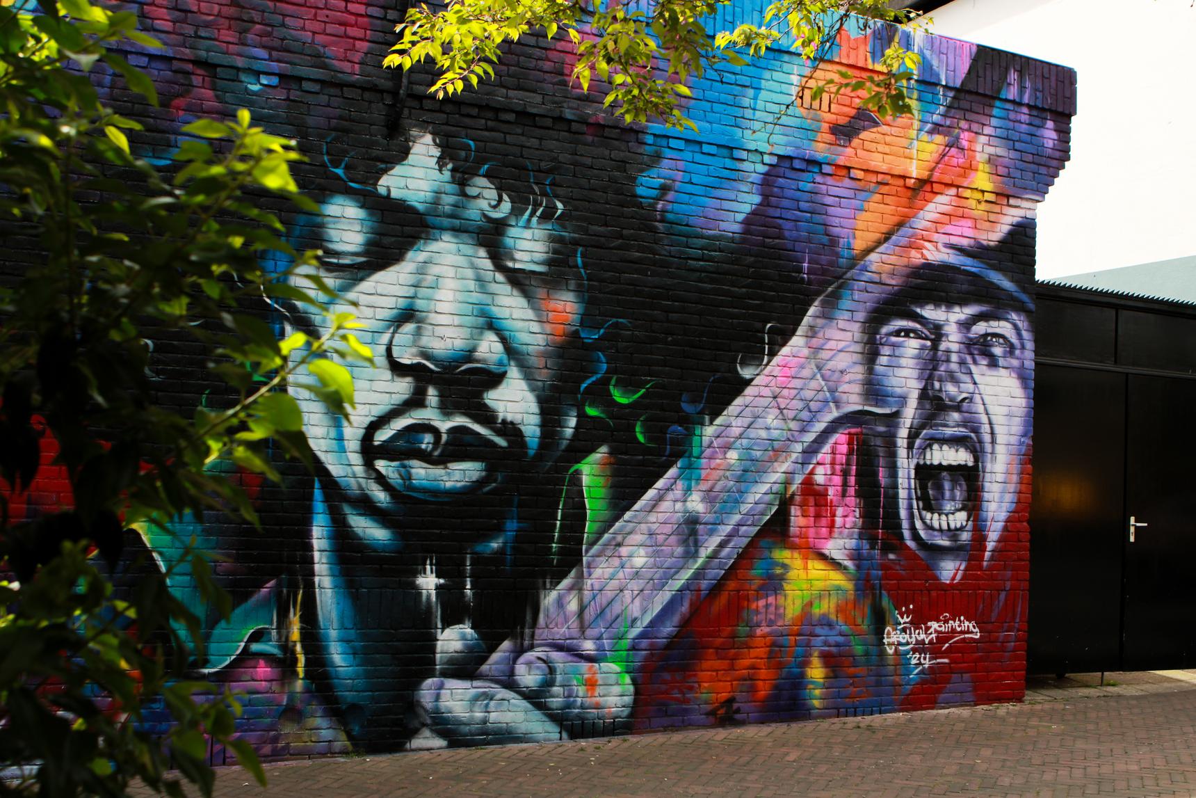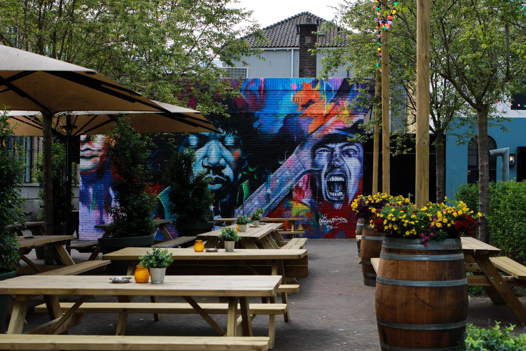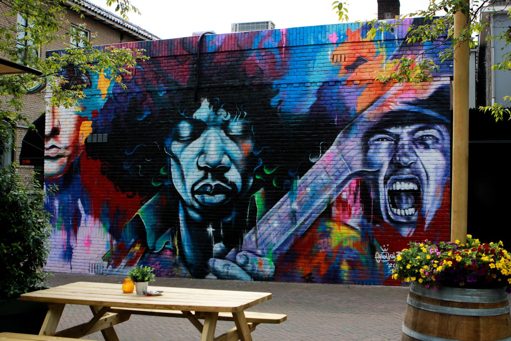Artist E. Royal has brought the theme of rock to life in his own unique way at Café Rocks. From left to right, you can see icons Jim Morrison, Jimi Hendrix, and Angus Young. If you look closely, you’ll see the coat of arms of Enschede depicted at the bottom of the artwork.