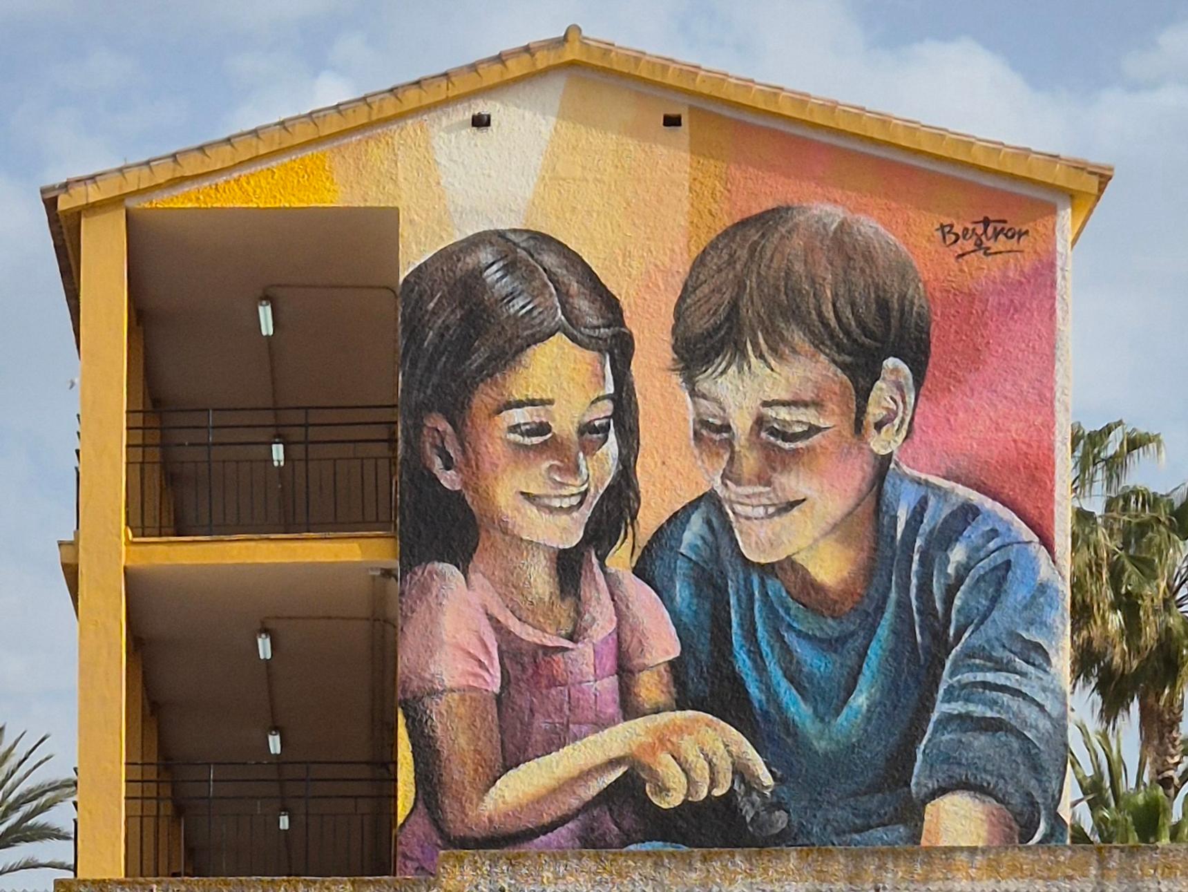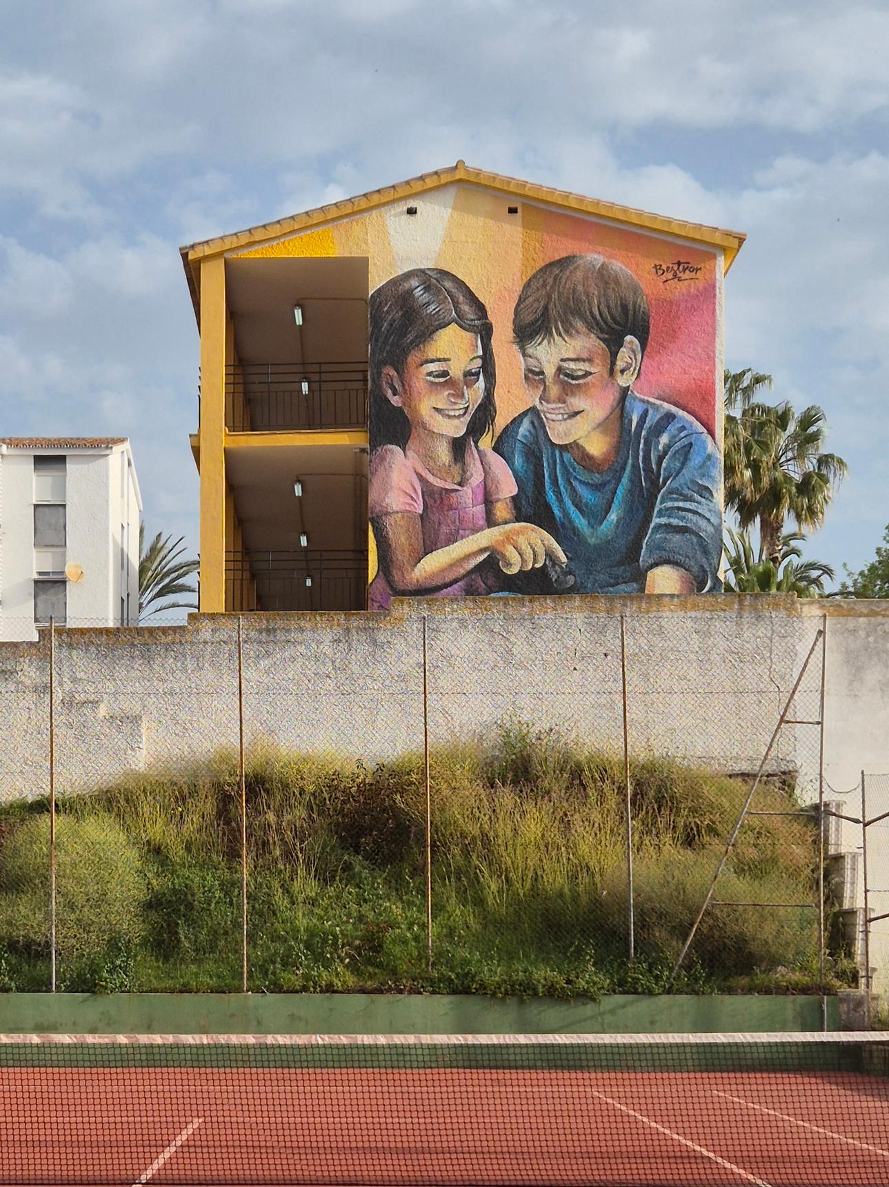 The artist about (T)his mural: "Playing with the Mind: The Chess of Childhood. This impressive mural, created at the Tomás de Aquino school in Estepona, captures the magic of childhood through a vibrant chess game between two children. The artwork is a testament to my dedication to my work, overcoming days of extreme sun, difficult angles, and a textured wall to bring this piece to life. This mural not only beautifies the school environment but also inspires the community to value art and creativity in our daily lives.