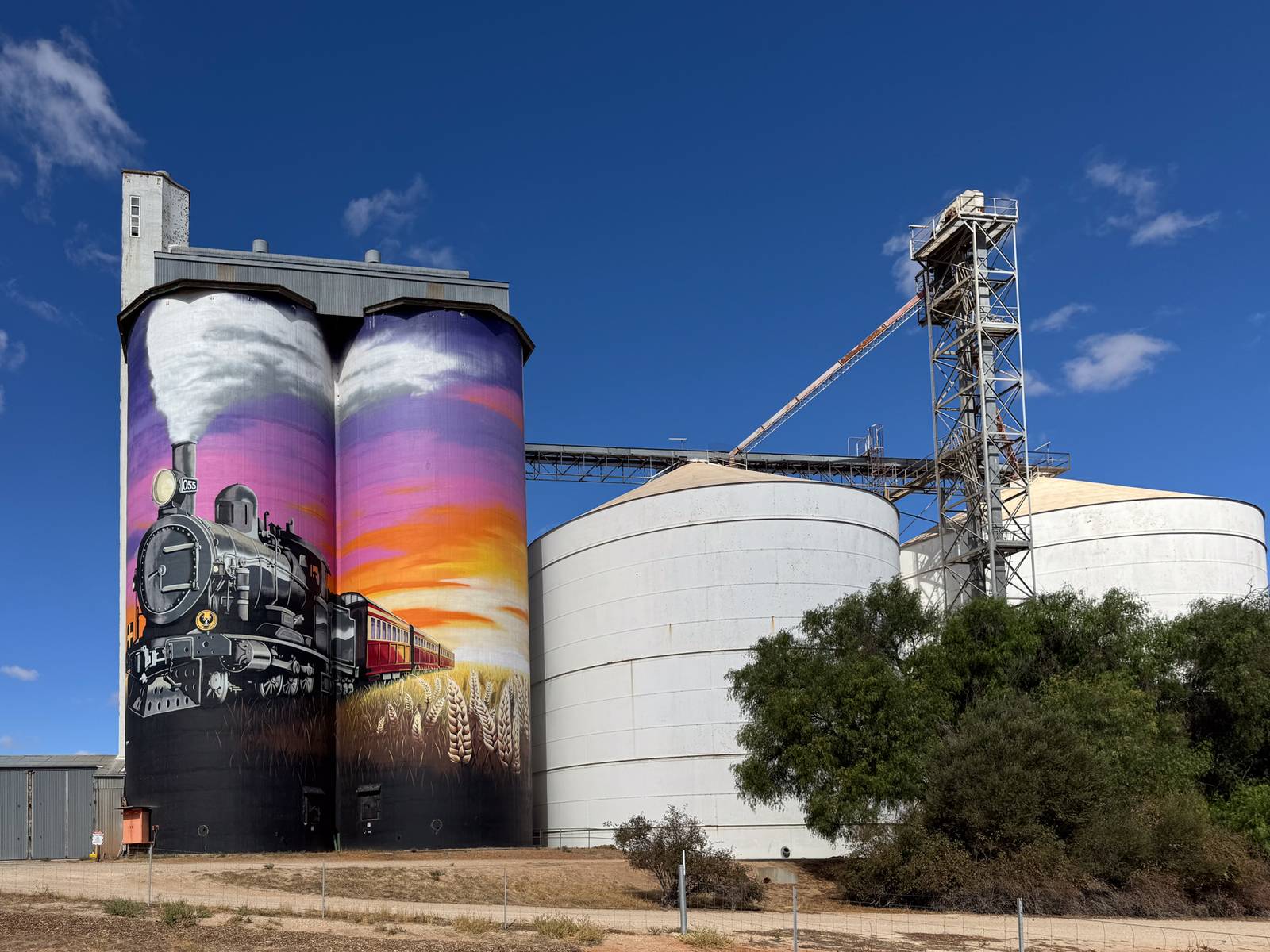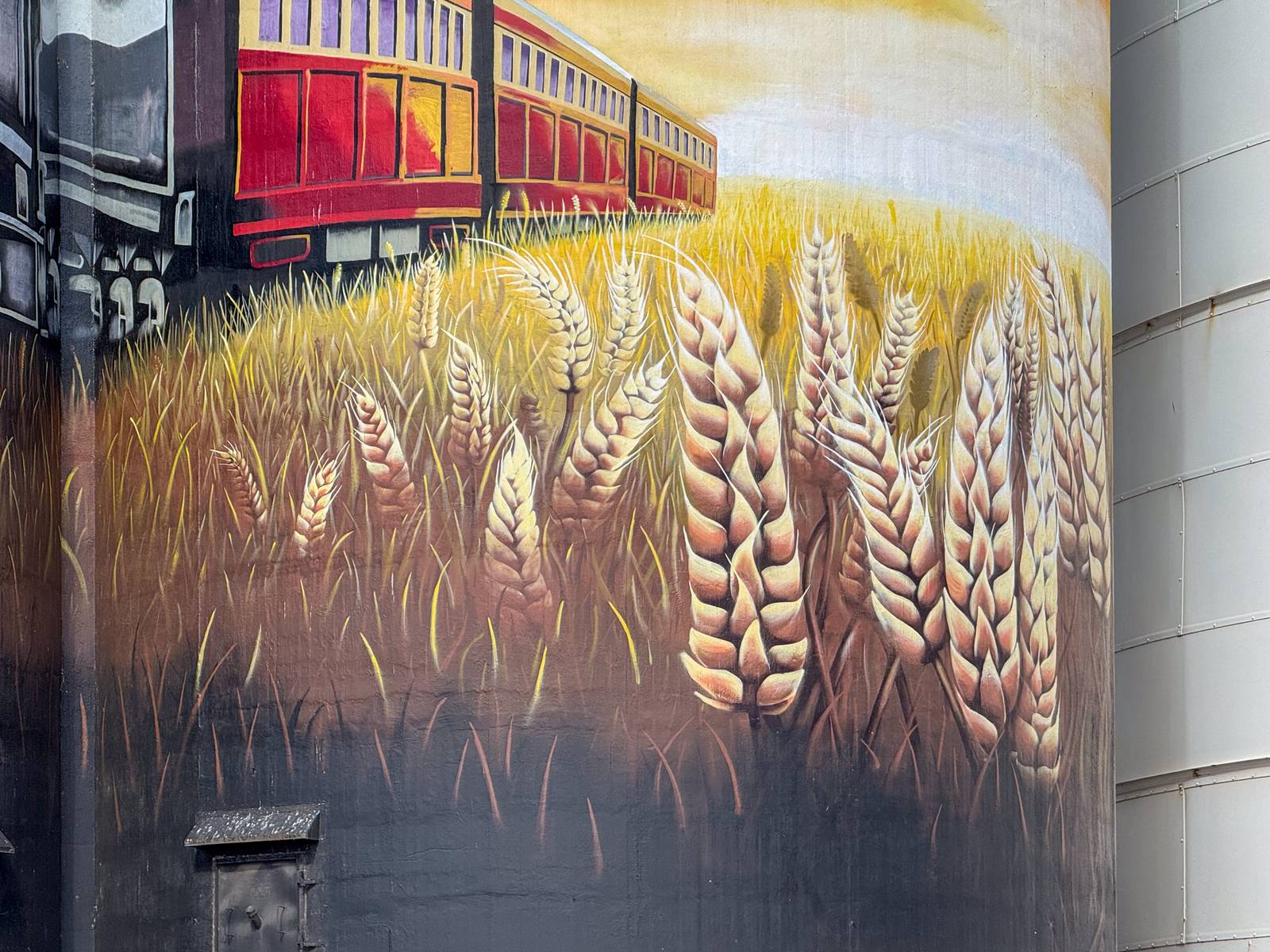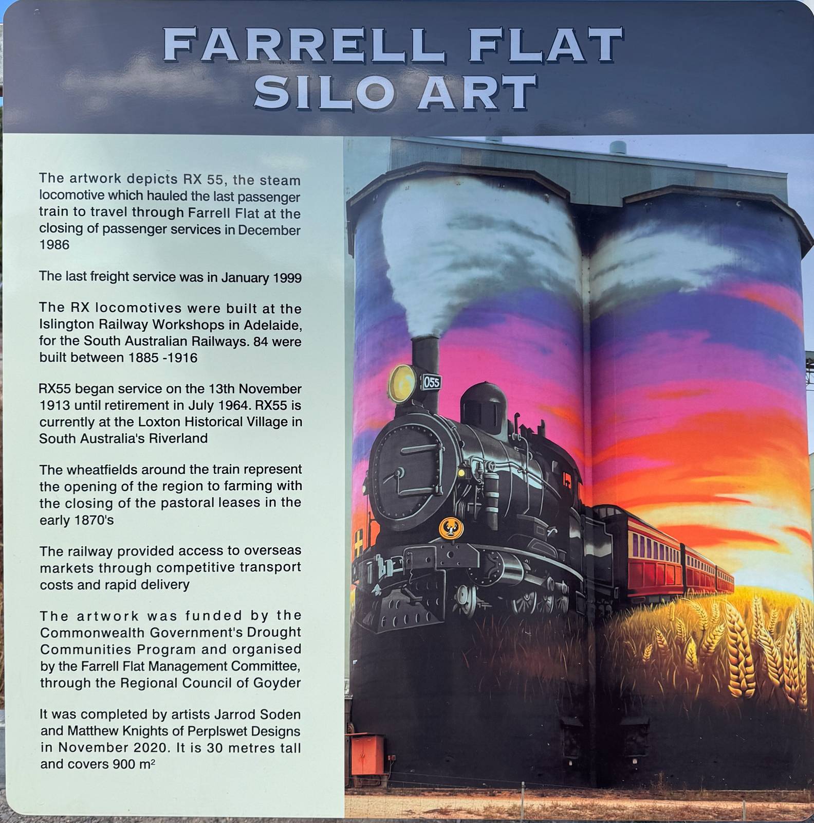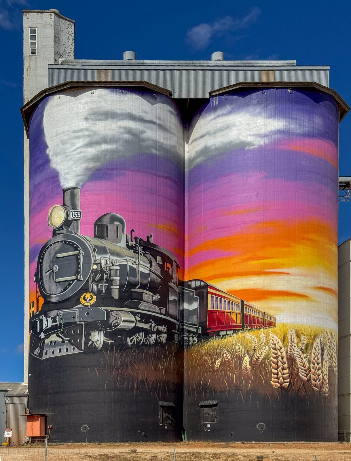 This incredible mural is a heartfelt tribute to Farrell Flat’s rich railway history, capturing a significant moment in time with extraordinary detail. At its core, the artwork depicts the town’s final train passing through, a symbolic farewell to an era when the railway played a crucial role in shaping the community. The scene is set against a magnificent backdrop featuring a breathtaking sunset that bathes the landscape in warm hues, while an endless stretch of golden wheat fields pays homage to the region’s deep agricultural heritage.