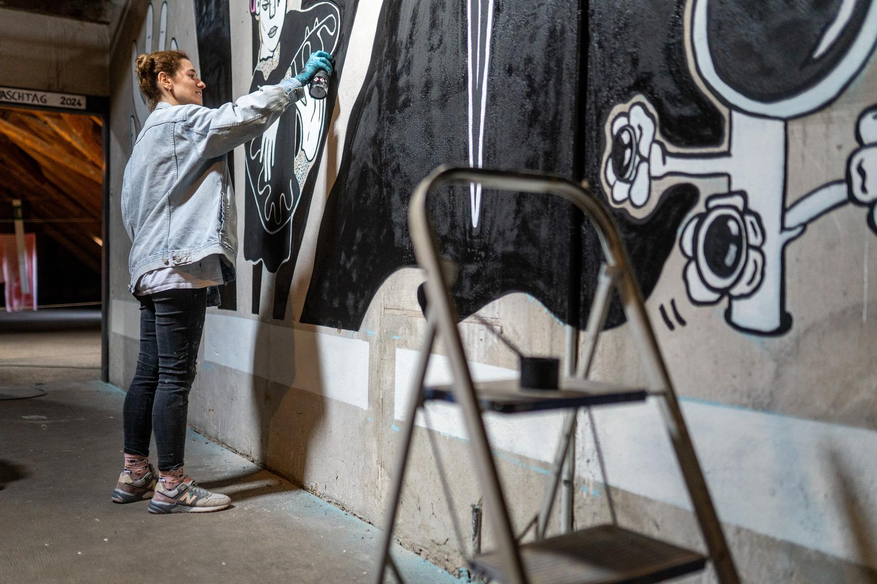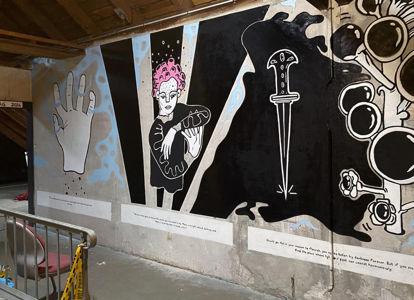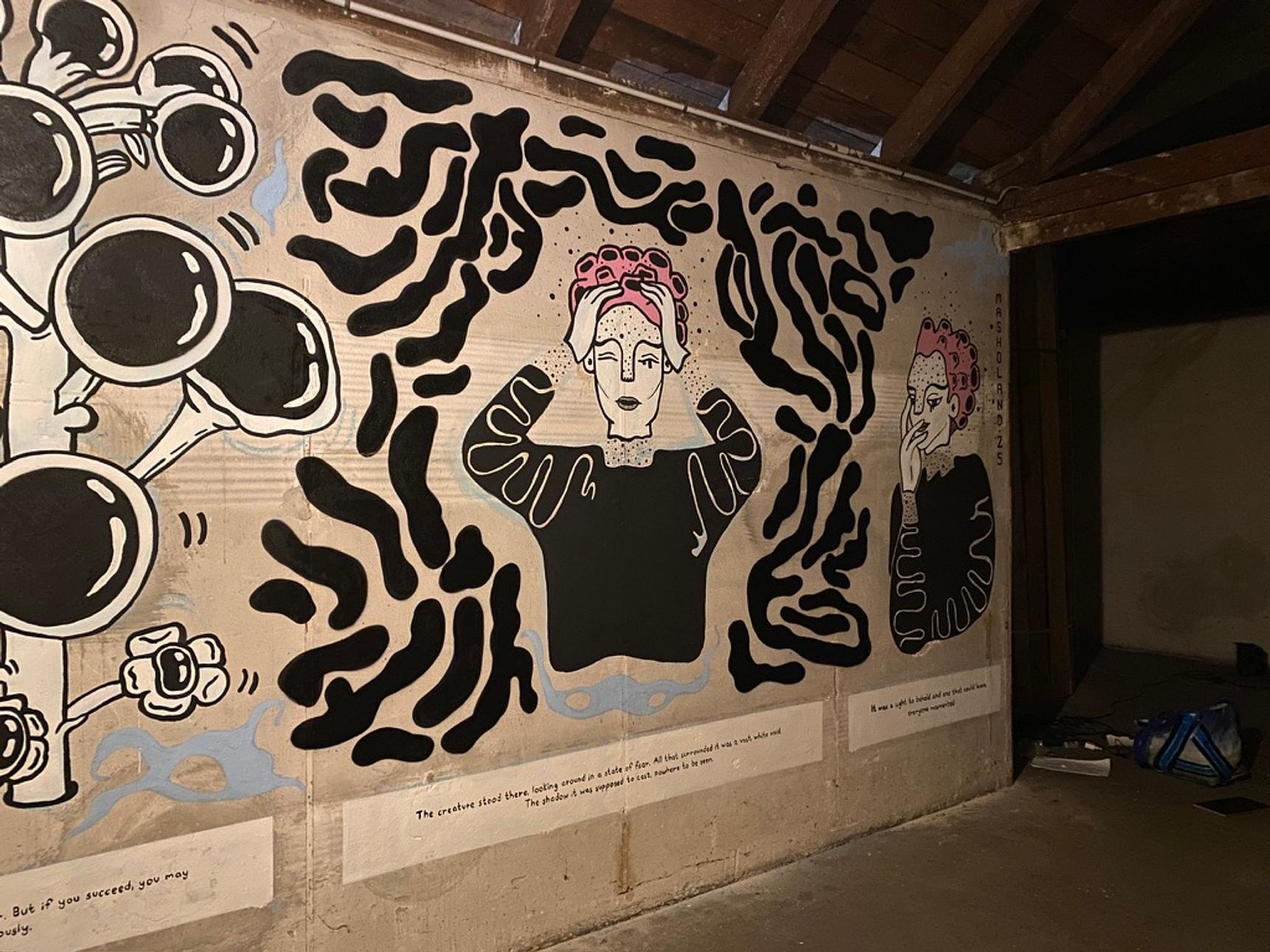 This unusual interior mural called "Threshold" was created during the UWE festival in Etzdorf, Germany. It explores the transformative journey from darkness to light through the power of creativity and inner work. Positioned among heavier, more somber works, it serves as a visual and thematic bridge, offering a sense of renewal, reflection, and hope