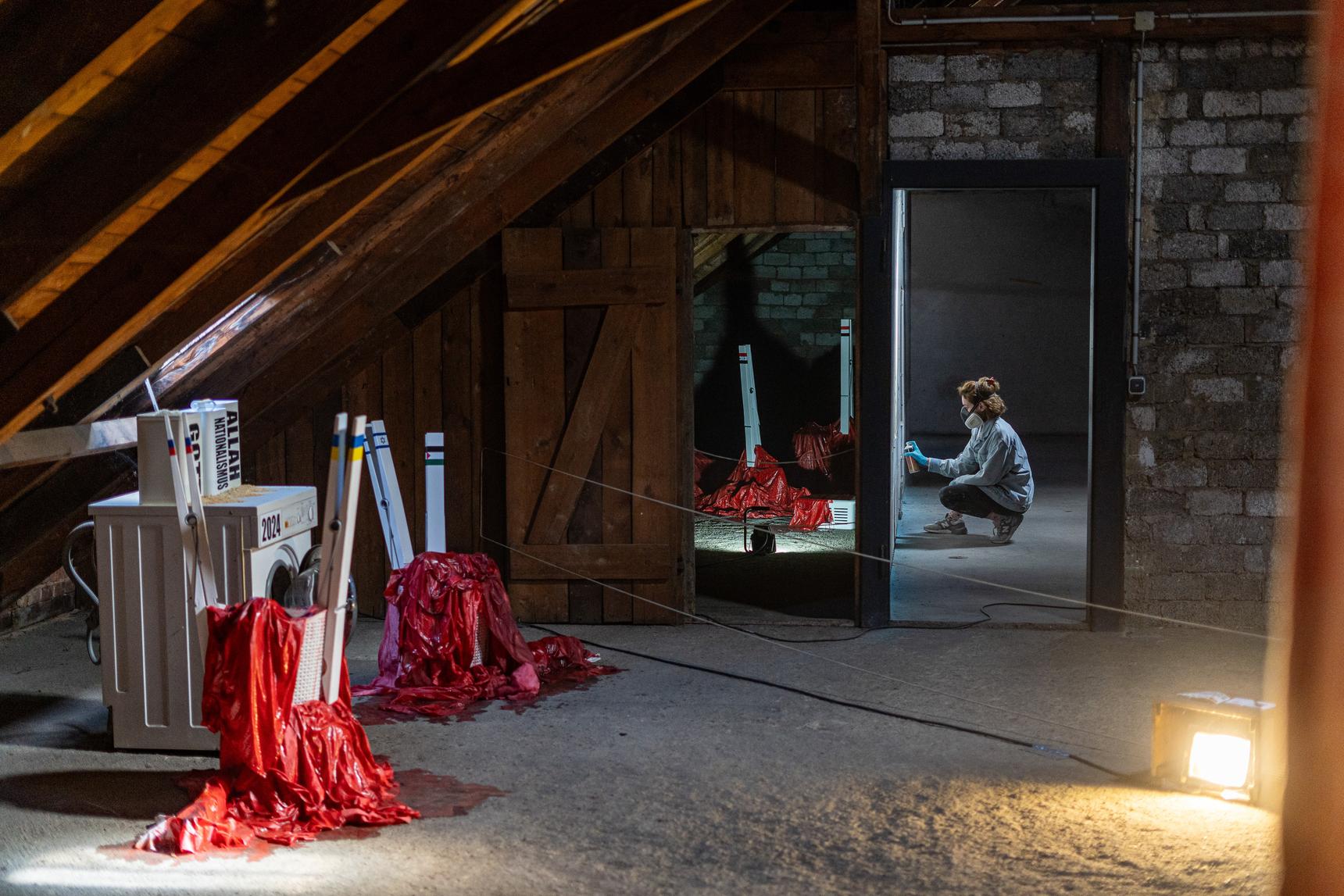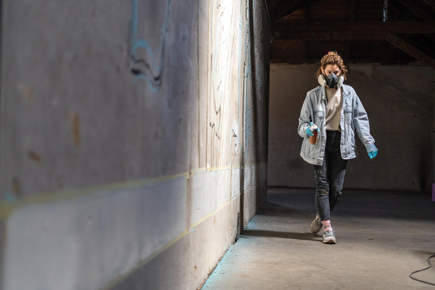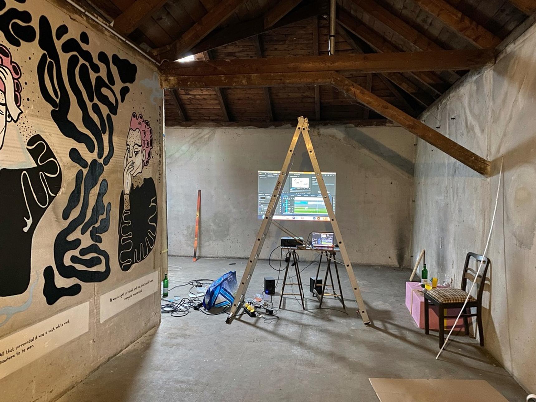 This unusual interior mural called "Threshold" was created during the UWE festival in Etzdorf, Germany. It explores the transformative journey from darkness to light through the power of creativity and inner work. Positioned among heavier, more somber works, it serves as a visual and thematic bridge, offering a sense of renewal, reflection, and hope