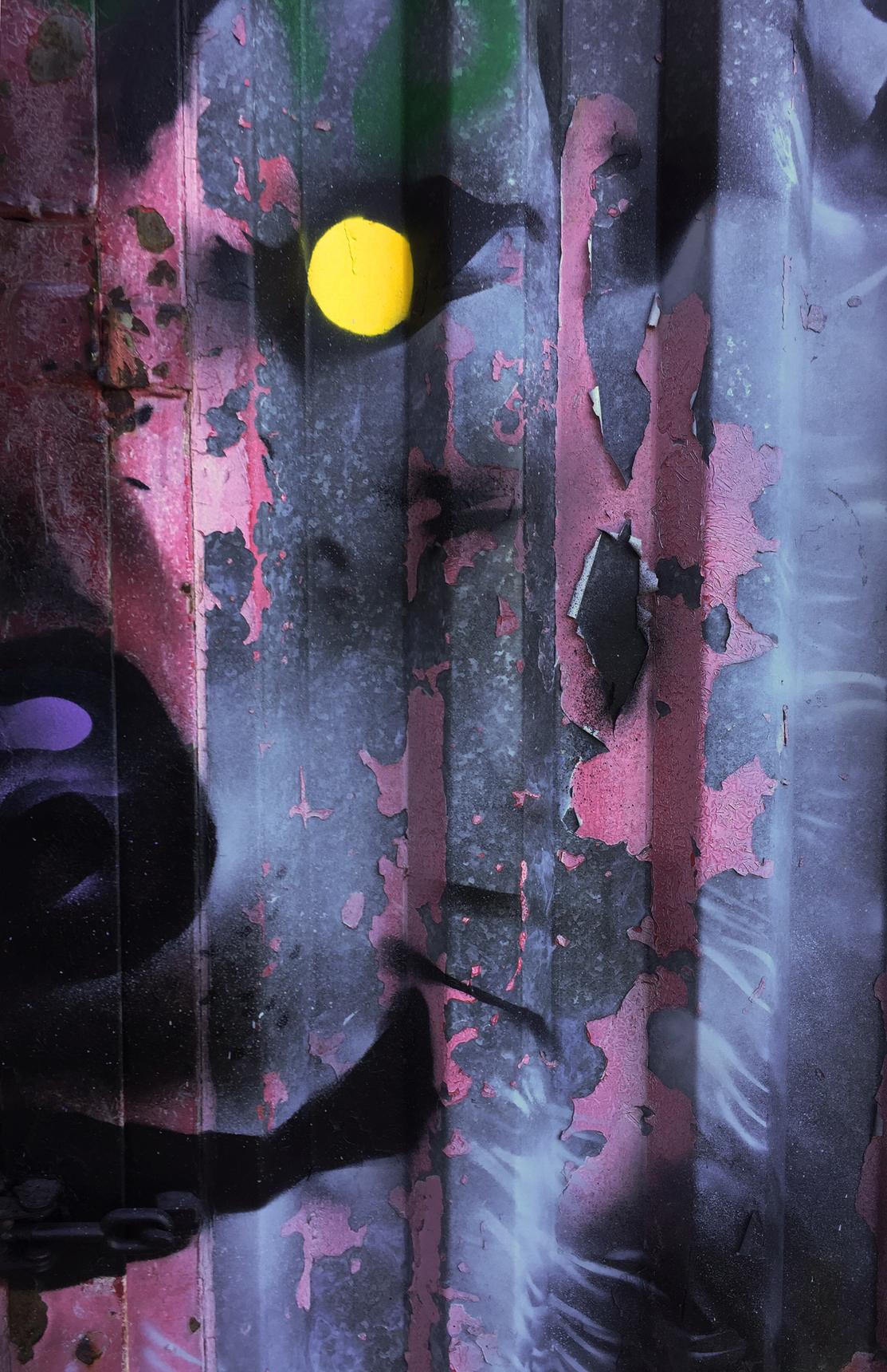 Its face is not covered in paint, but in the exposed, peeling metal itself, where fallen layers reveal scars of rust and time.