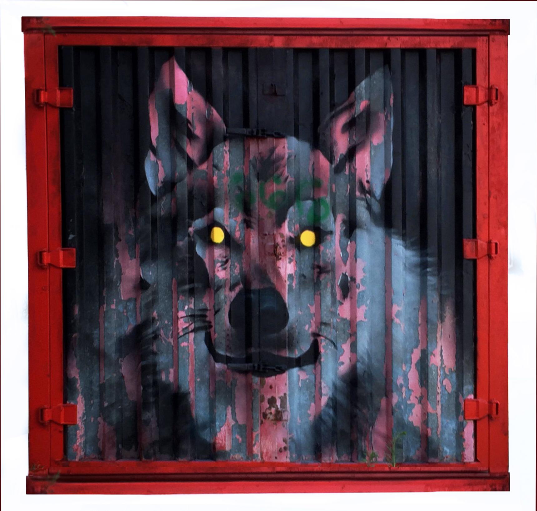 From the metal container emerges the figure of a wolf, watchful and silent.