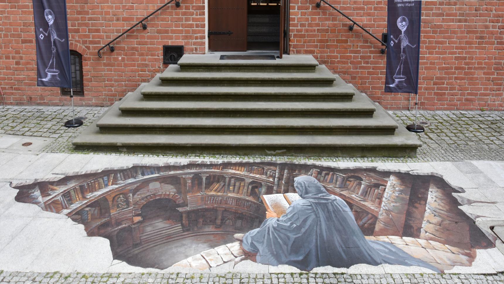 3d street art in front of library.