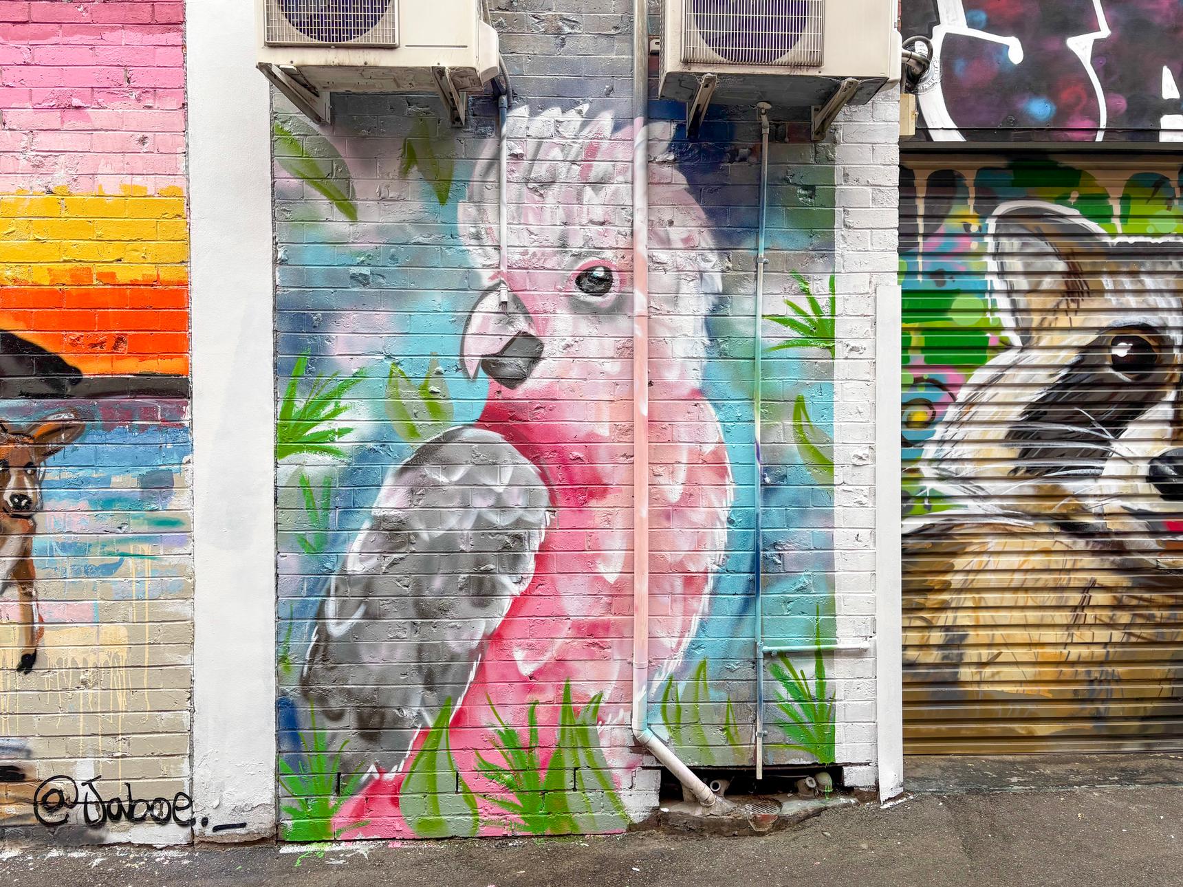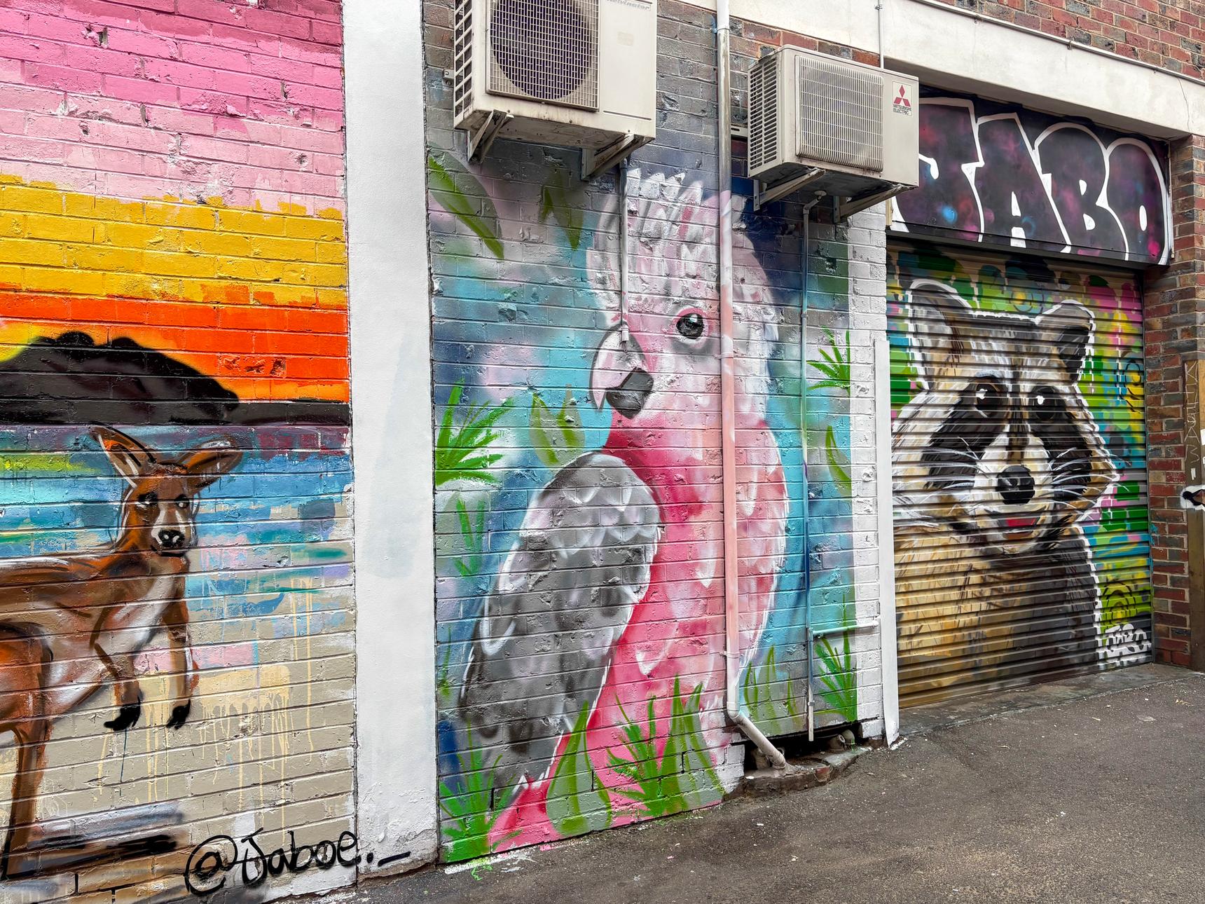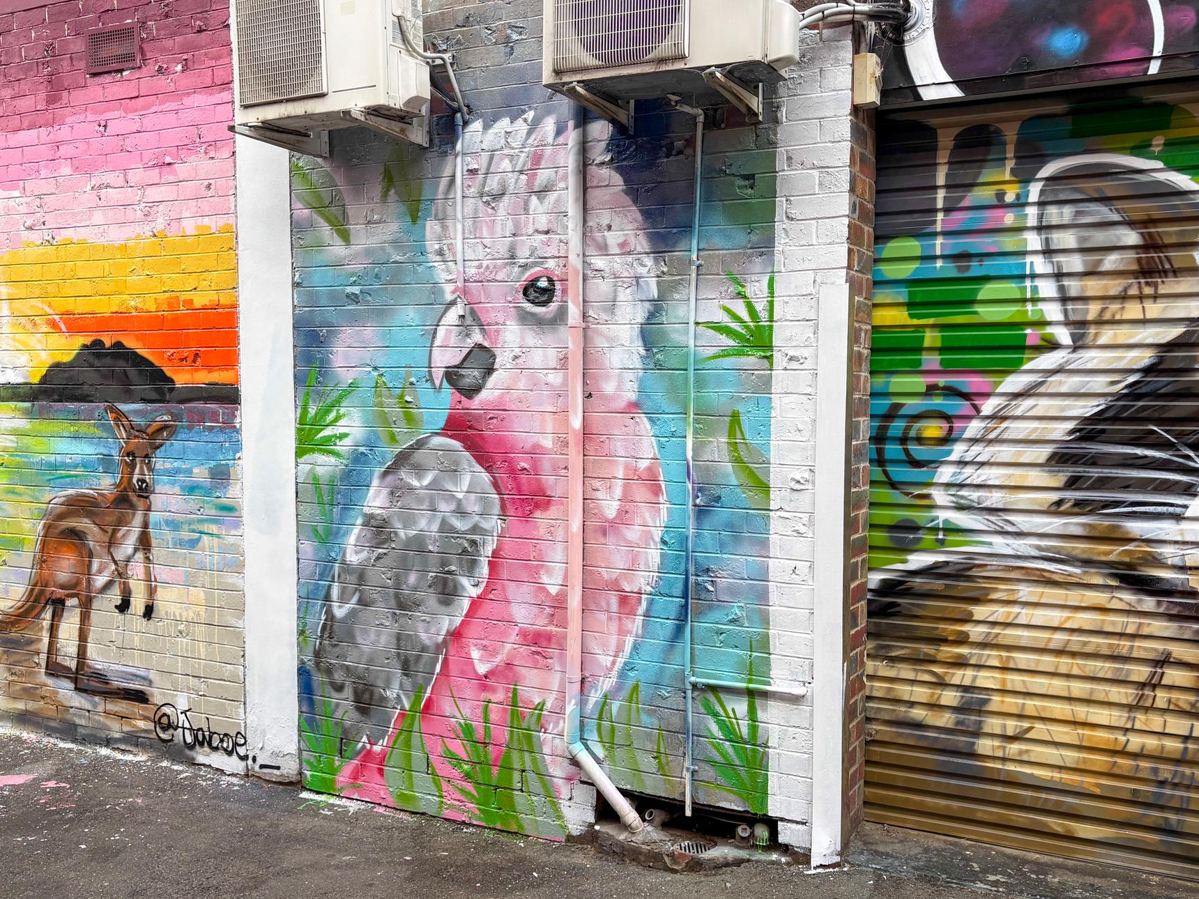 On the side of the building at 18 James Street. It can be seen a short walk into James Street, just behind the Kangaroo artwork.