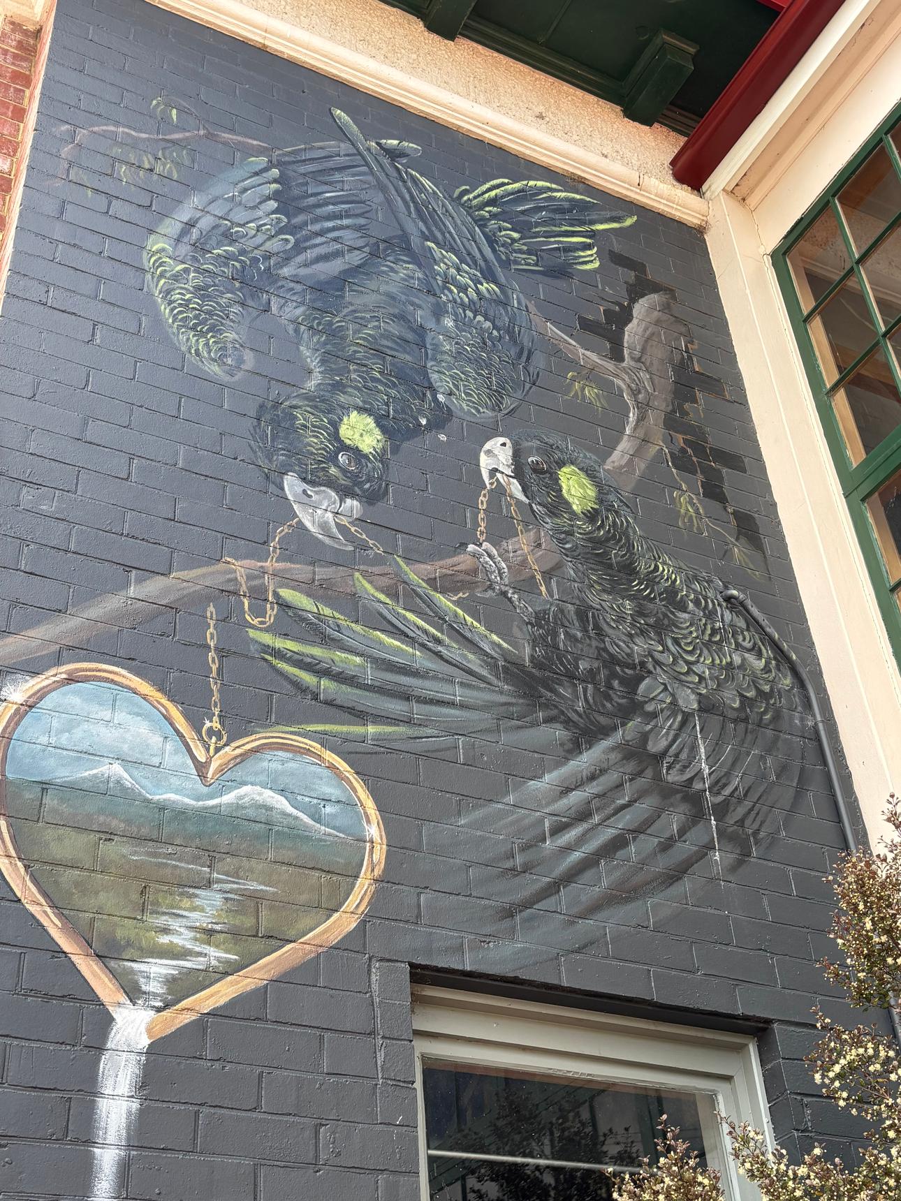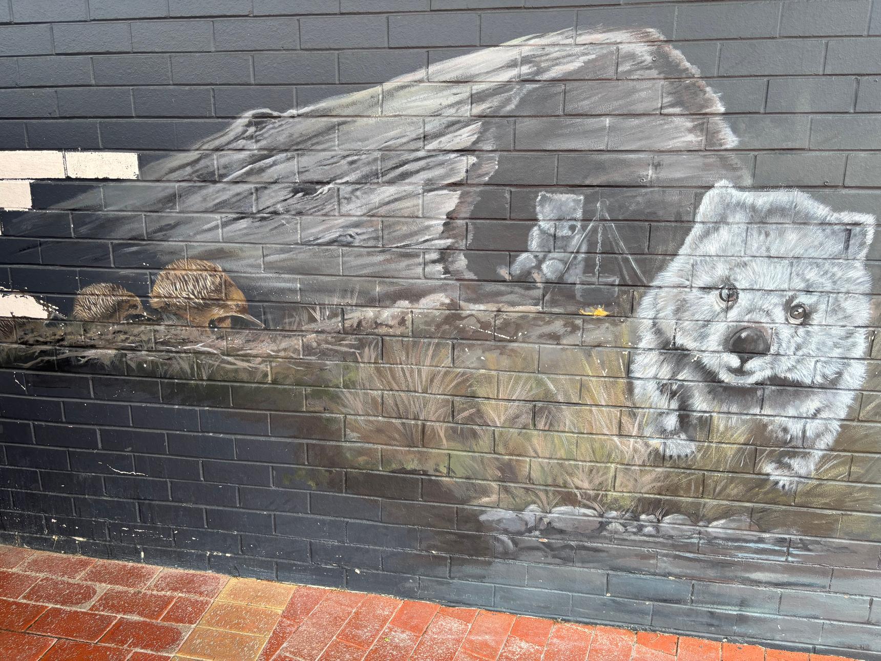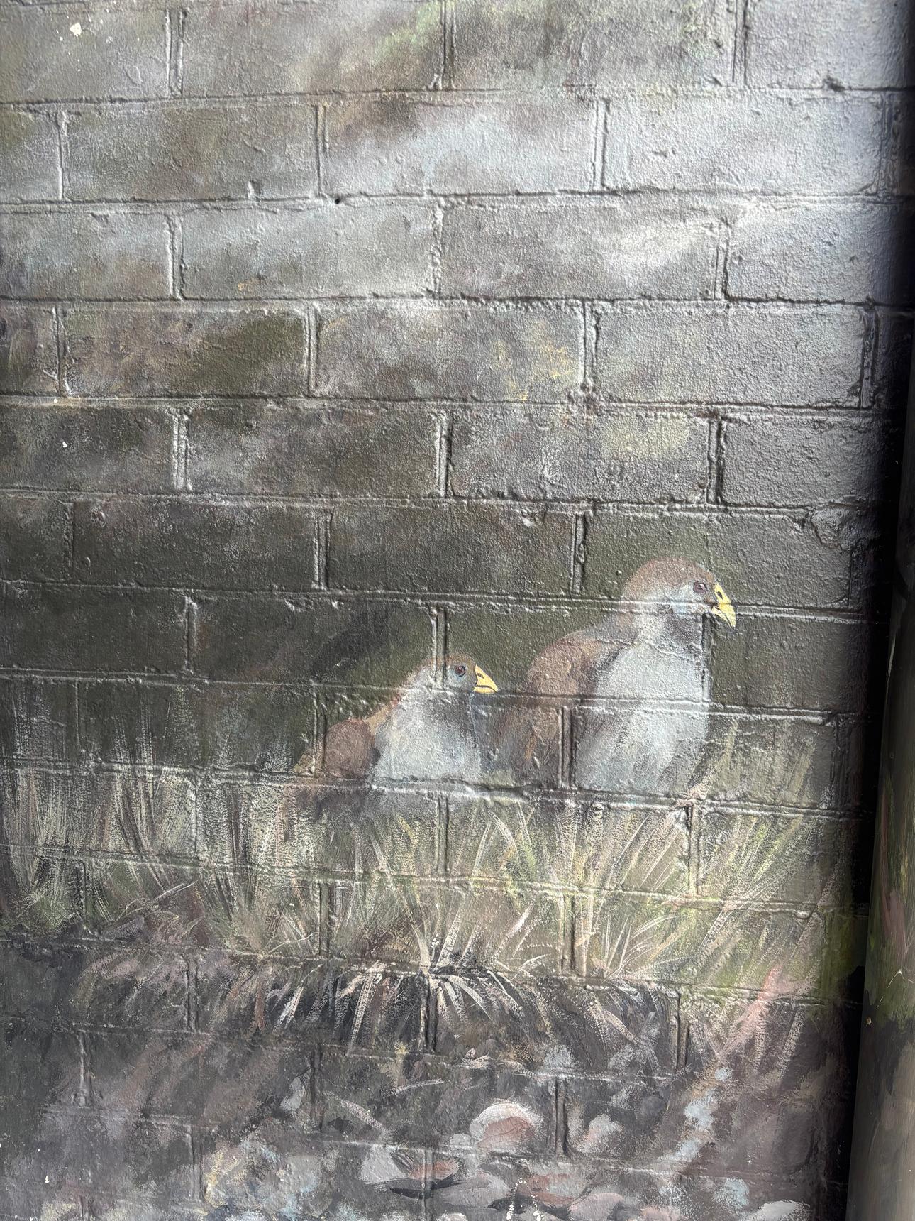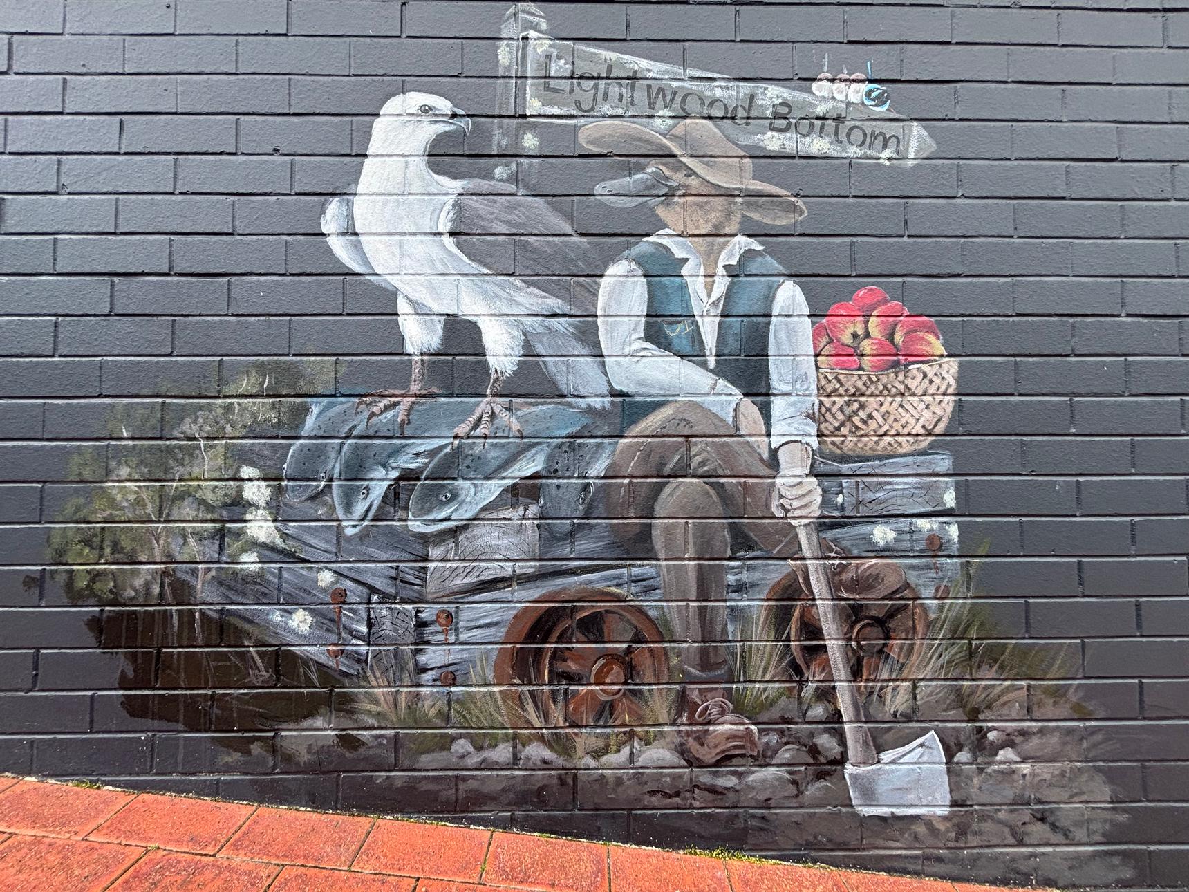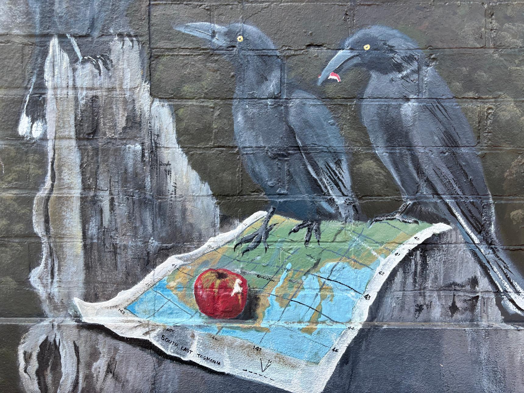 A detailed mural by Brian Looker weaving together wildlife, landscape, and local history. Painted in a muted, natural palette, the artwork features native animals, birds, and subtle symbolic scenes set within flowing waterways and rugged terrain. Look closely to discover layered details – maps, apples, tools, and quiet moments that reference place, labour, and connection to the land. Thoughtful and atmospheric, the mural invites slow viewing and rewards curiosity, revealing new elements with each pass.