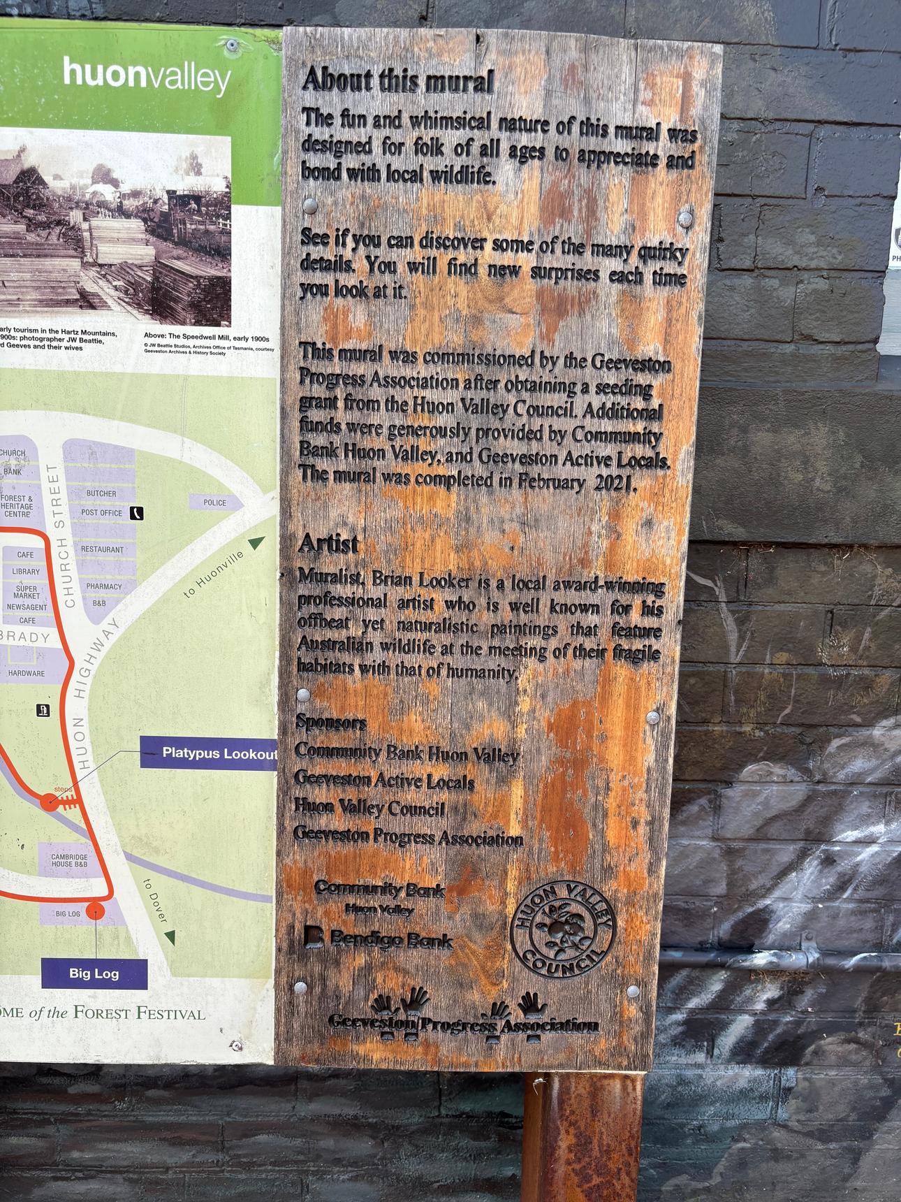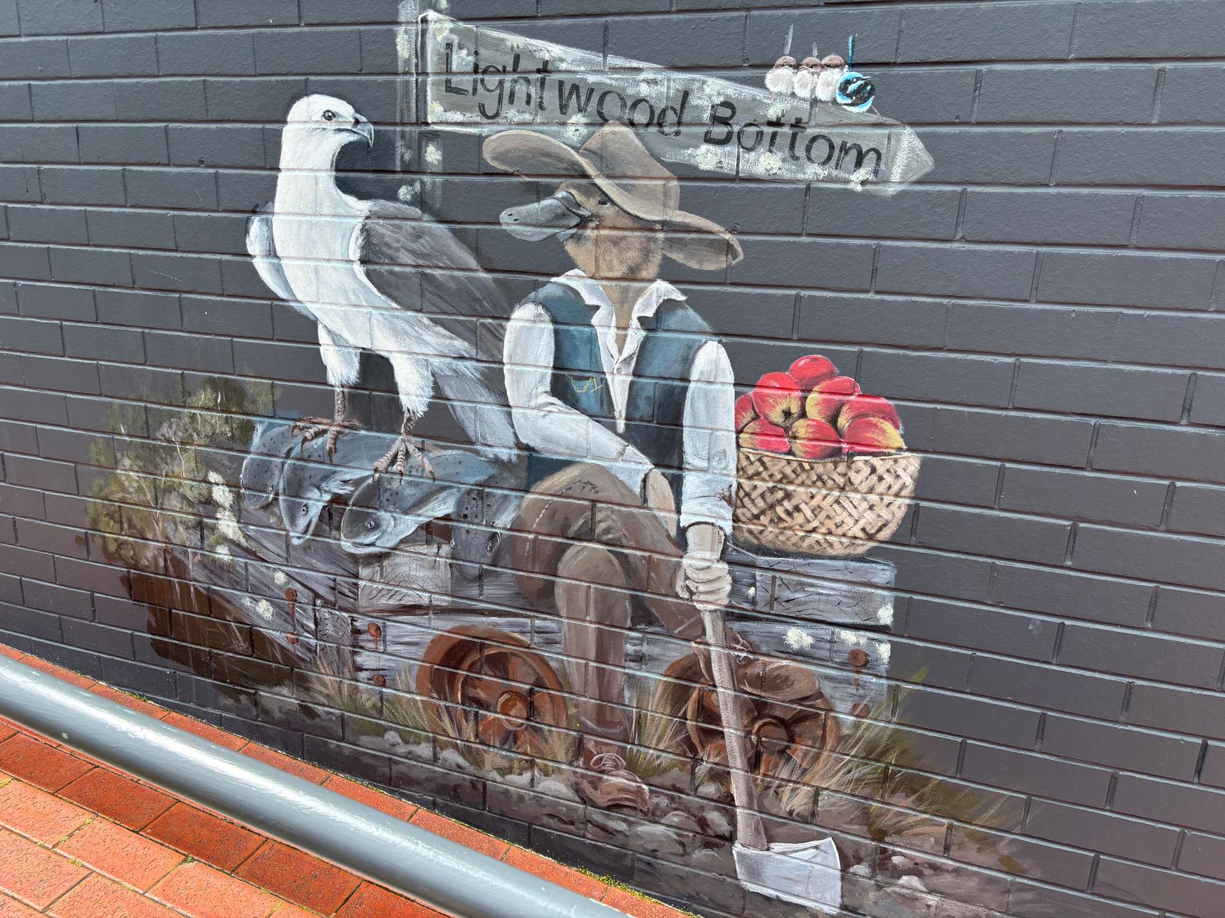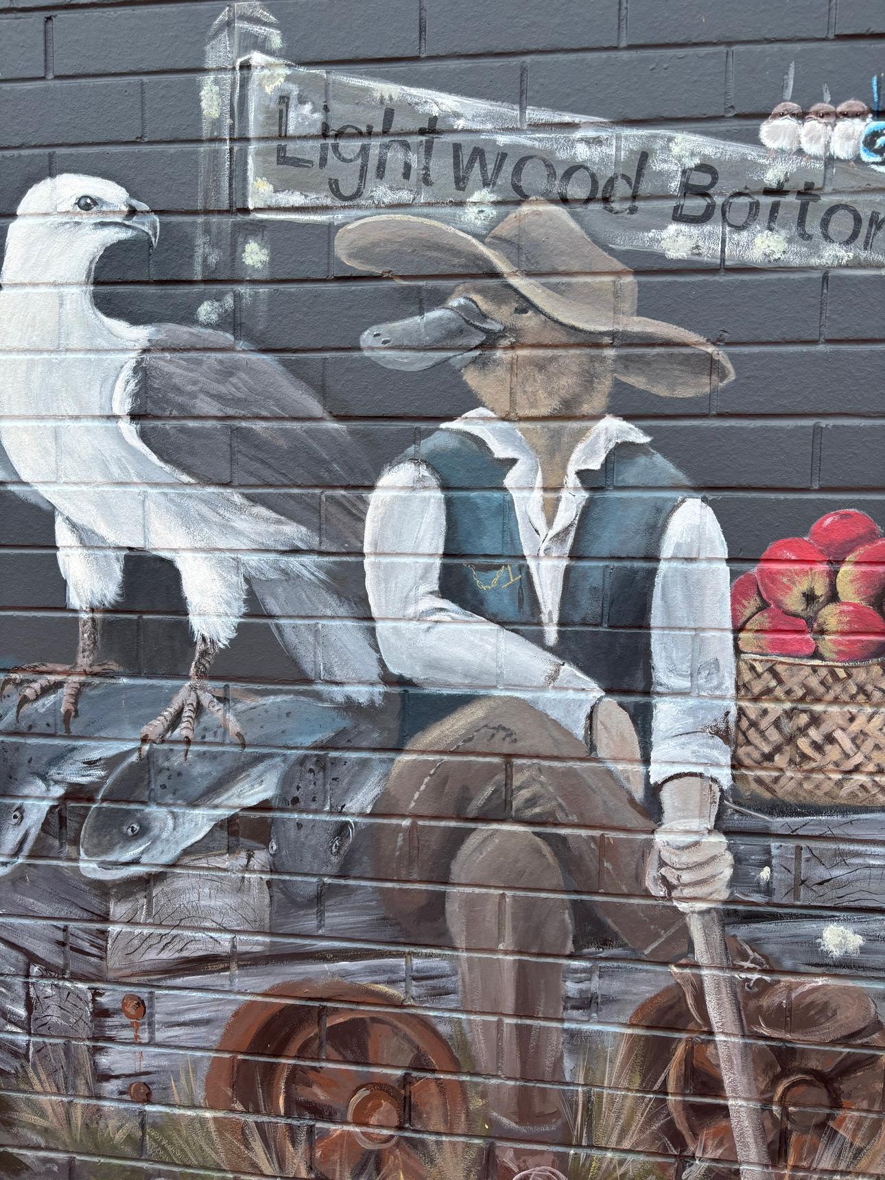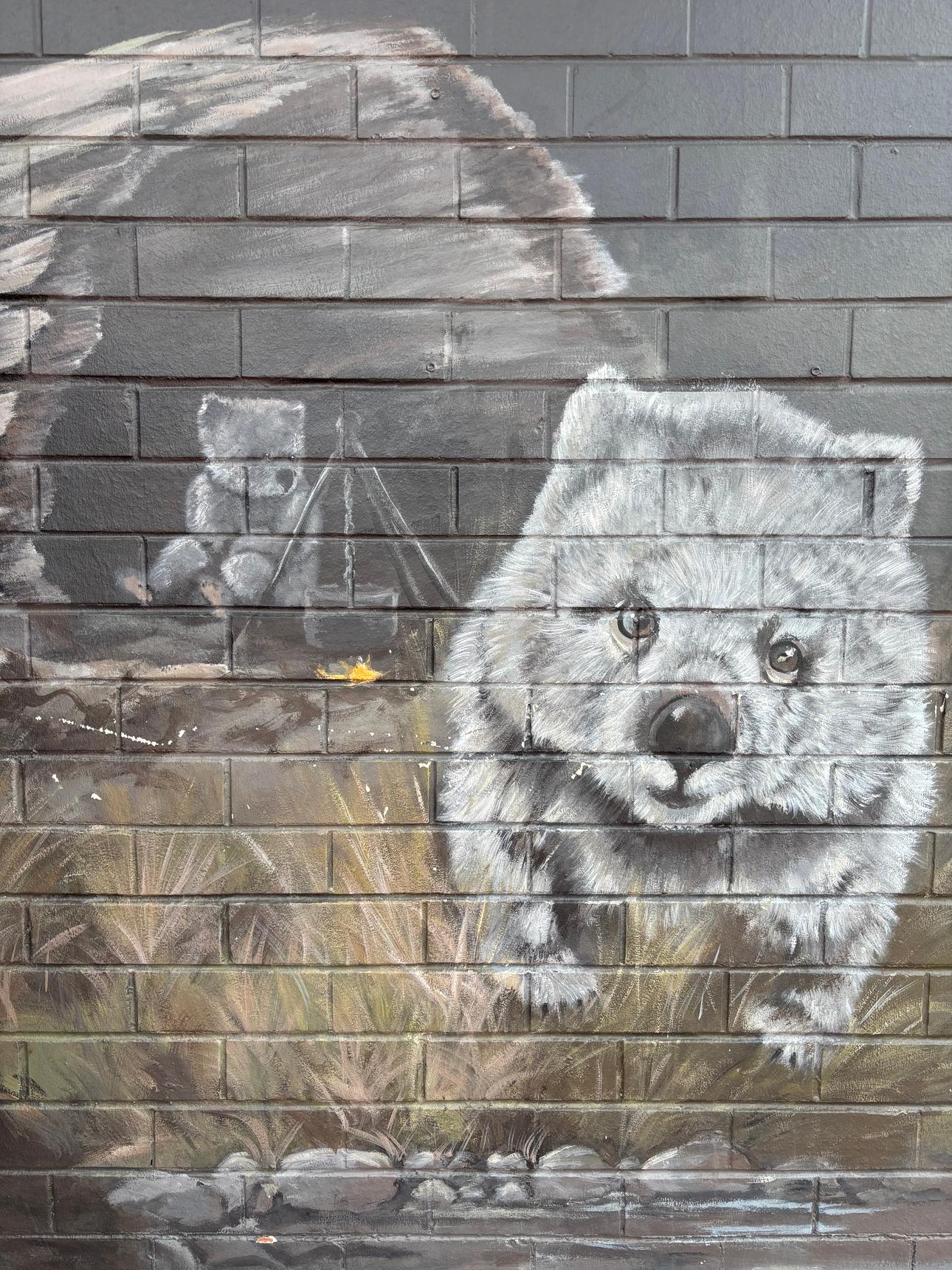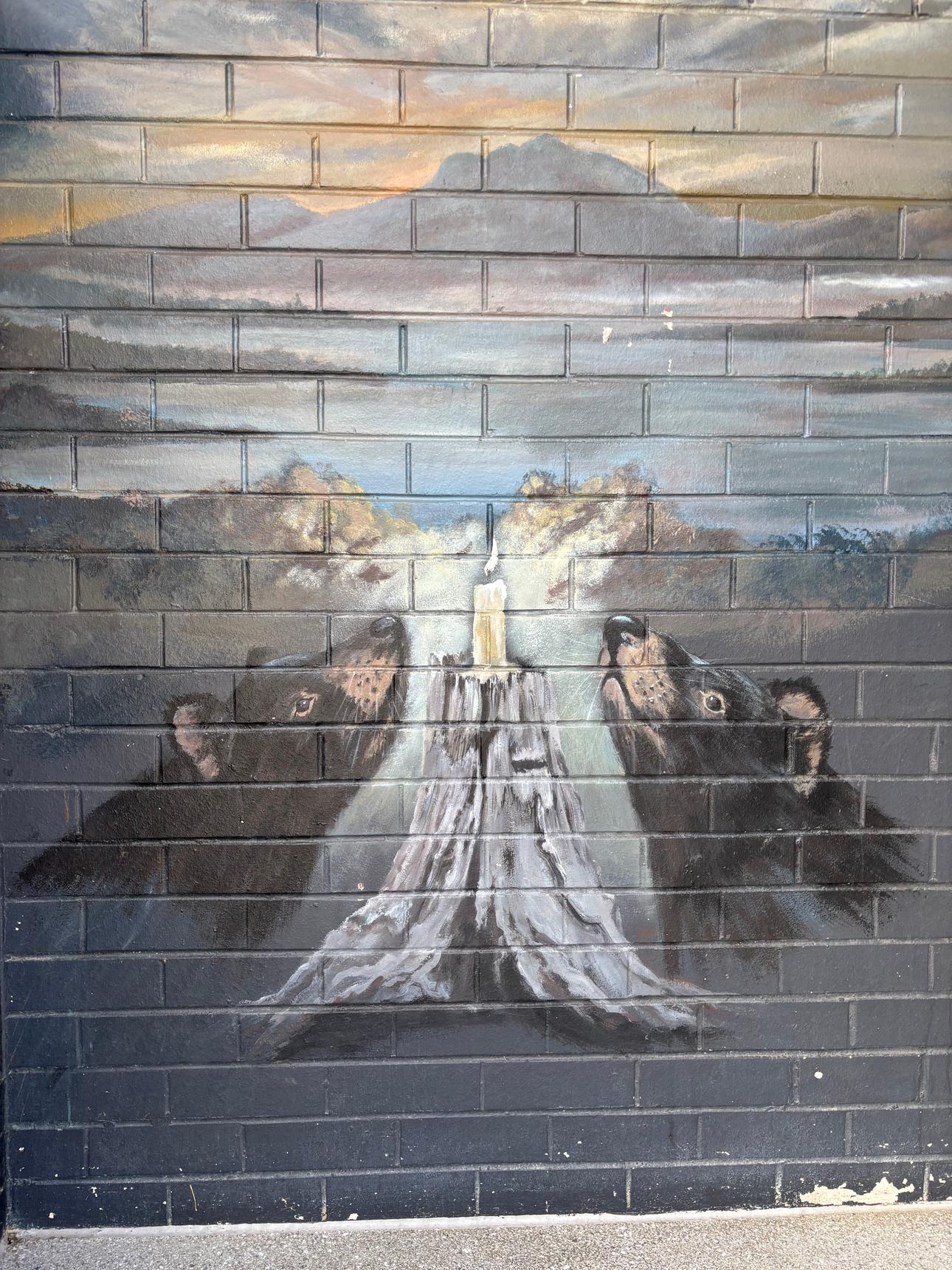 A detailed mural by Brian Looker weaving together wildlife, landscape, and local history. Painted in a muted, natural palette, the artwork features native animals, birds, and subtle symbolic scenes set within flowing waterways and rugged terrain. Look closely to discover layered details – maps, apples, tools, and quiet moments that reference place, labour, and connection to the land. Thoughtful and atmospheric, the mural invites slow viewing and rewards curiosity, revealing new elements with each pass.