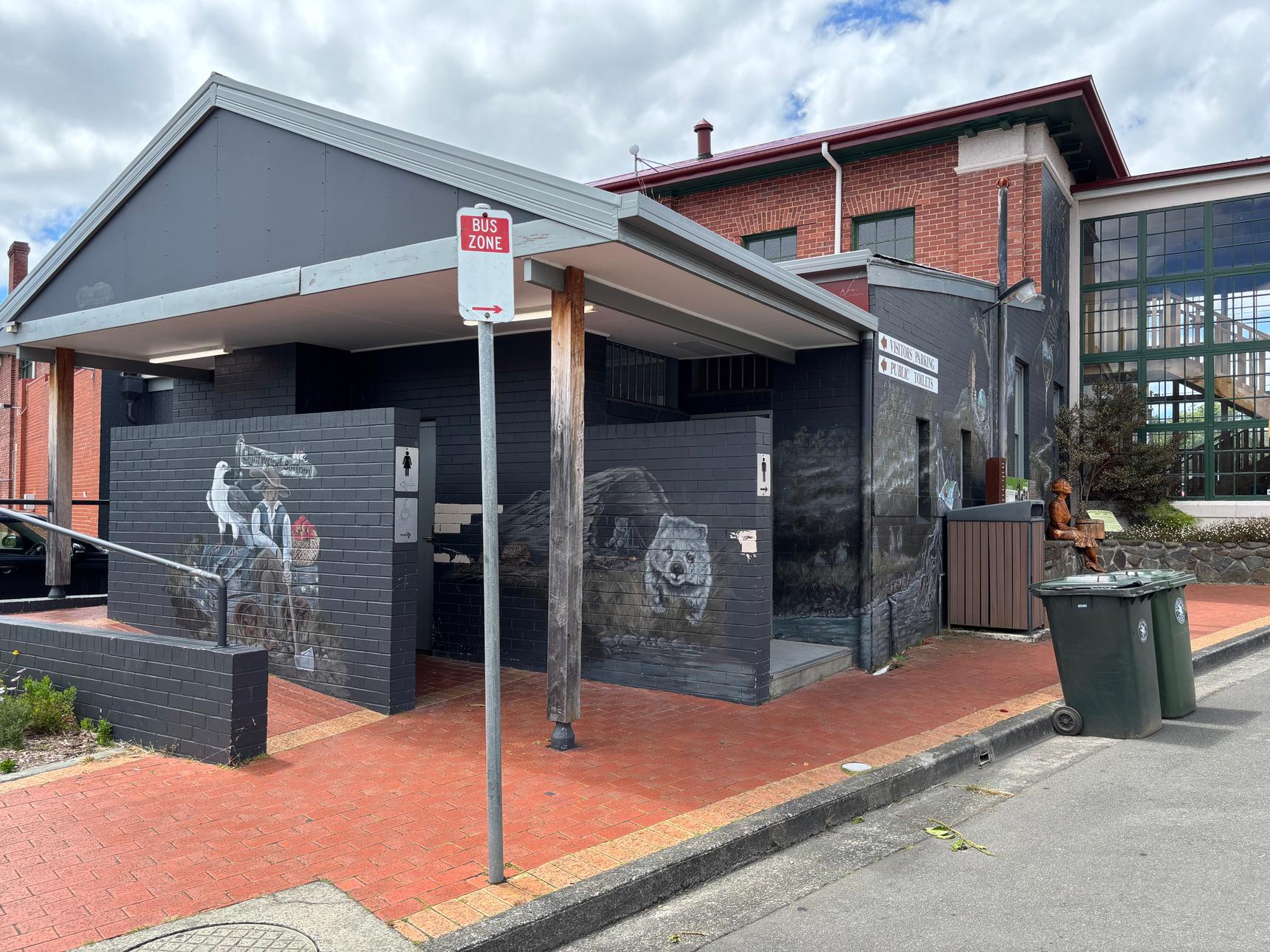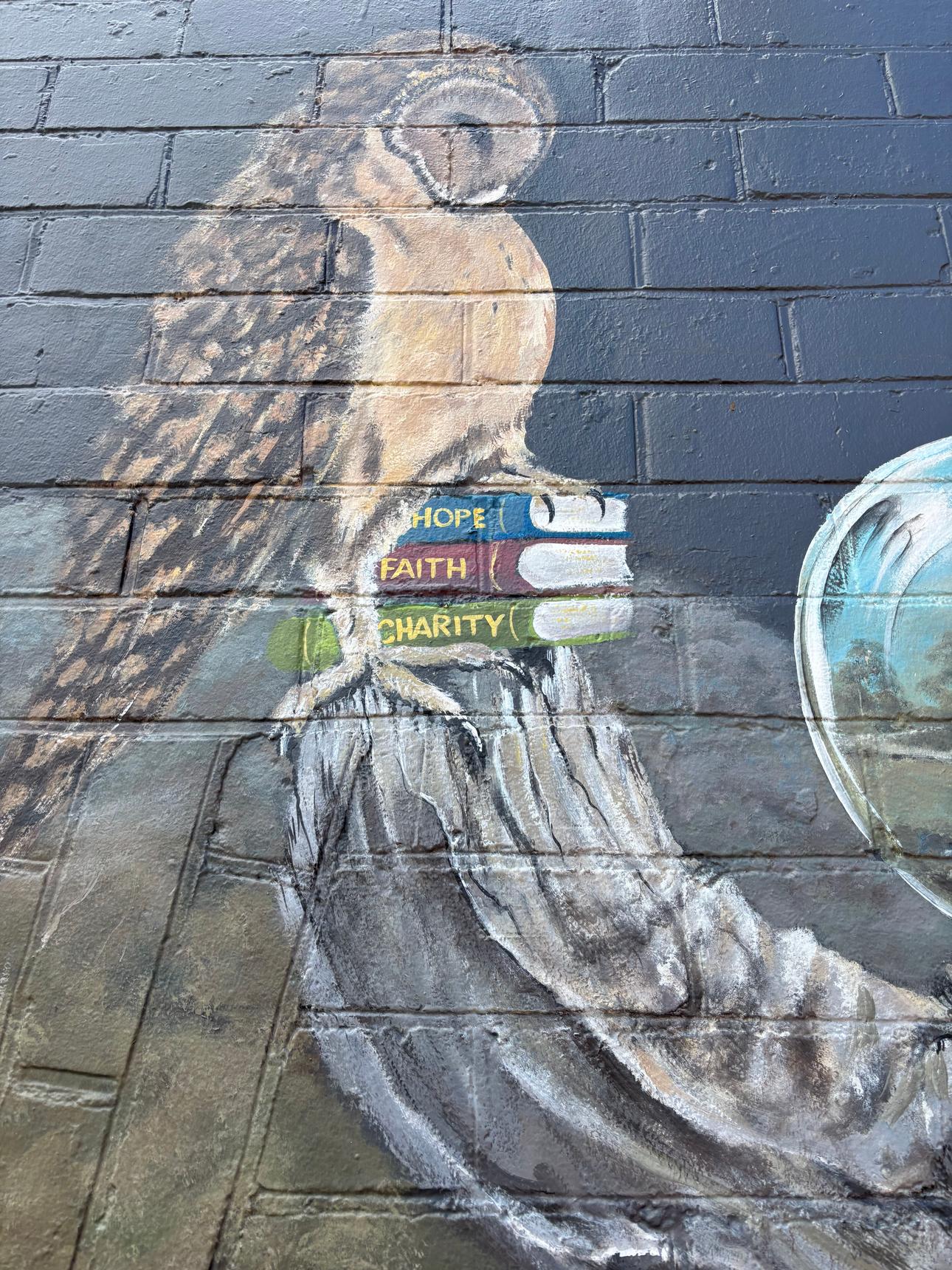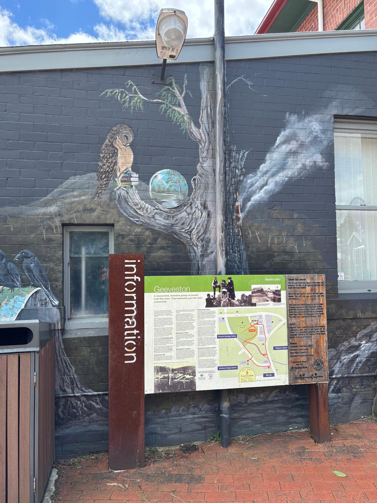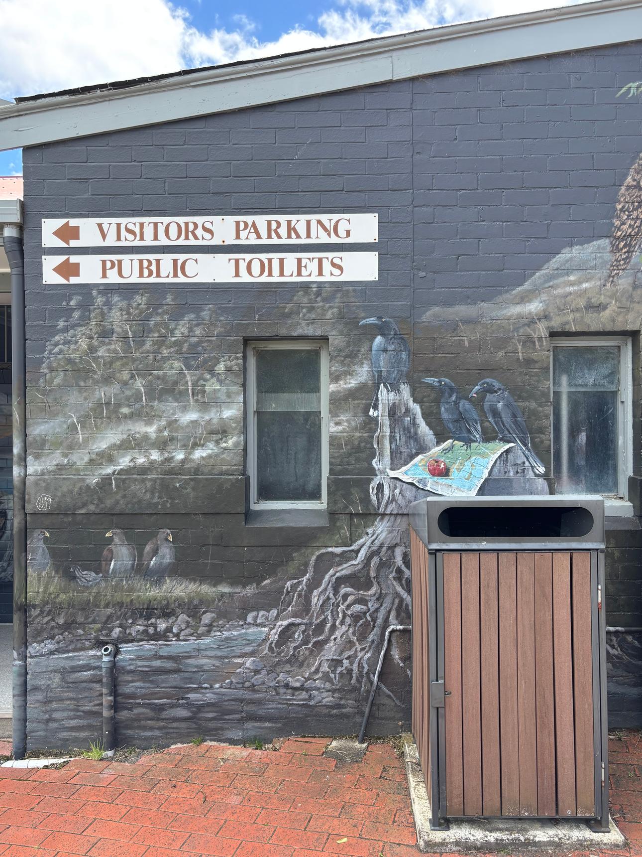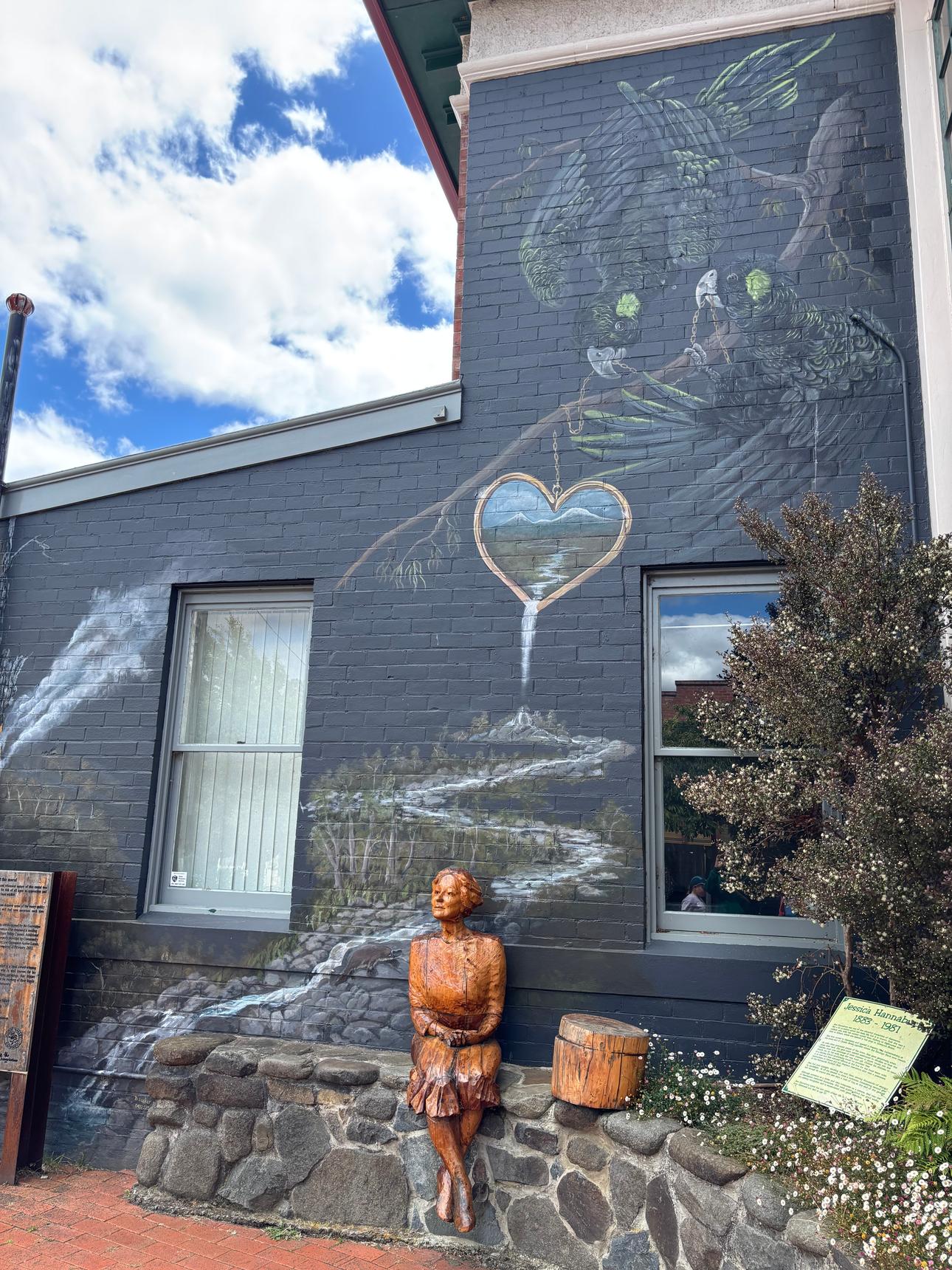 A detailed mural by Brian Looker weaving together wildlife, landscape, and local history. Painted in a muted, natural palette, the artwork features native animals, birds, and subtle symbolic scenes set within flowing waterways and rugged terrain. Look closely to discover layered details – maps, apples, tools, and quiet moments that reference place, labour, and connection to the land. Thoughtful and atmospheric, the mural invites slow viewing and rewards curiosity, revealing new elements with each pass.