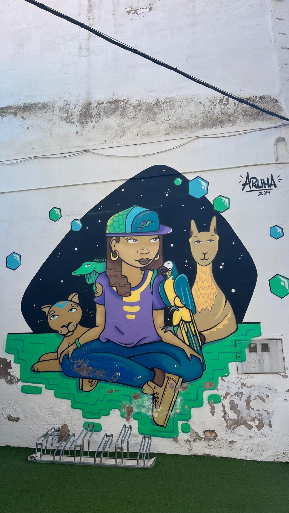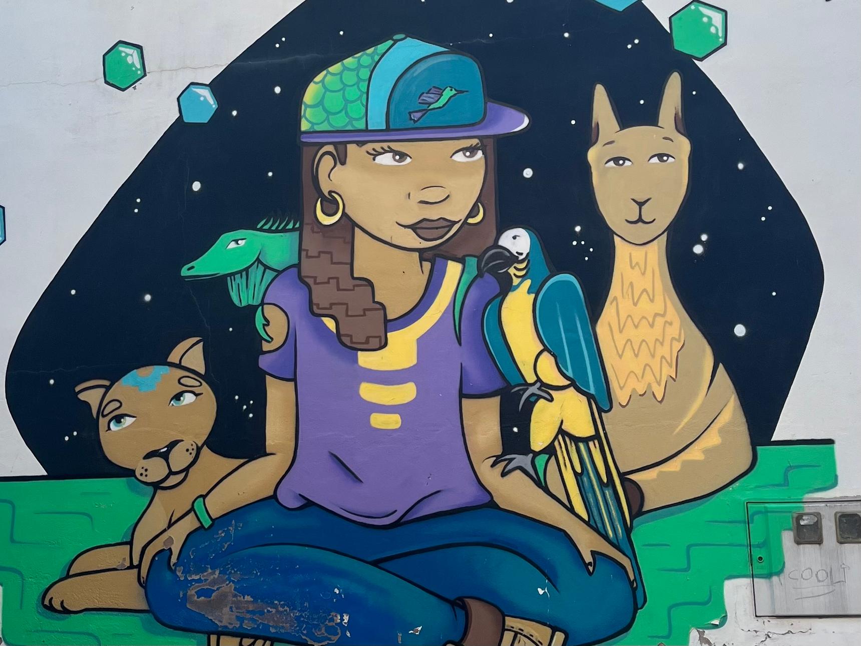 Fresque représentant les animaux d’Amérique du Sud, elle a été réalisée lors du Festival de Geldo.
