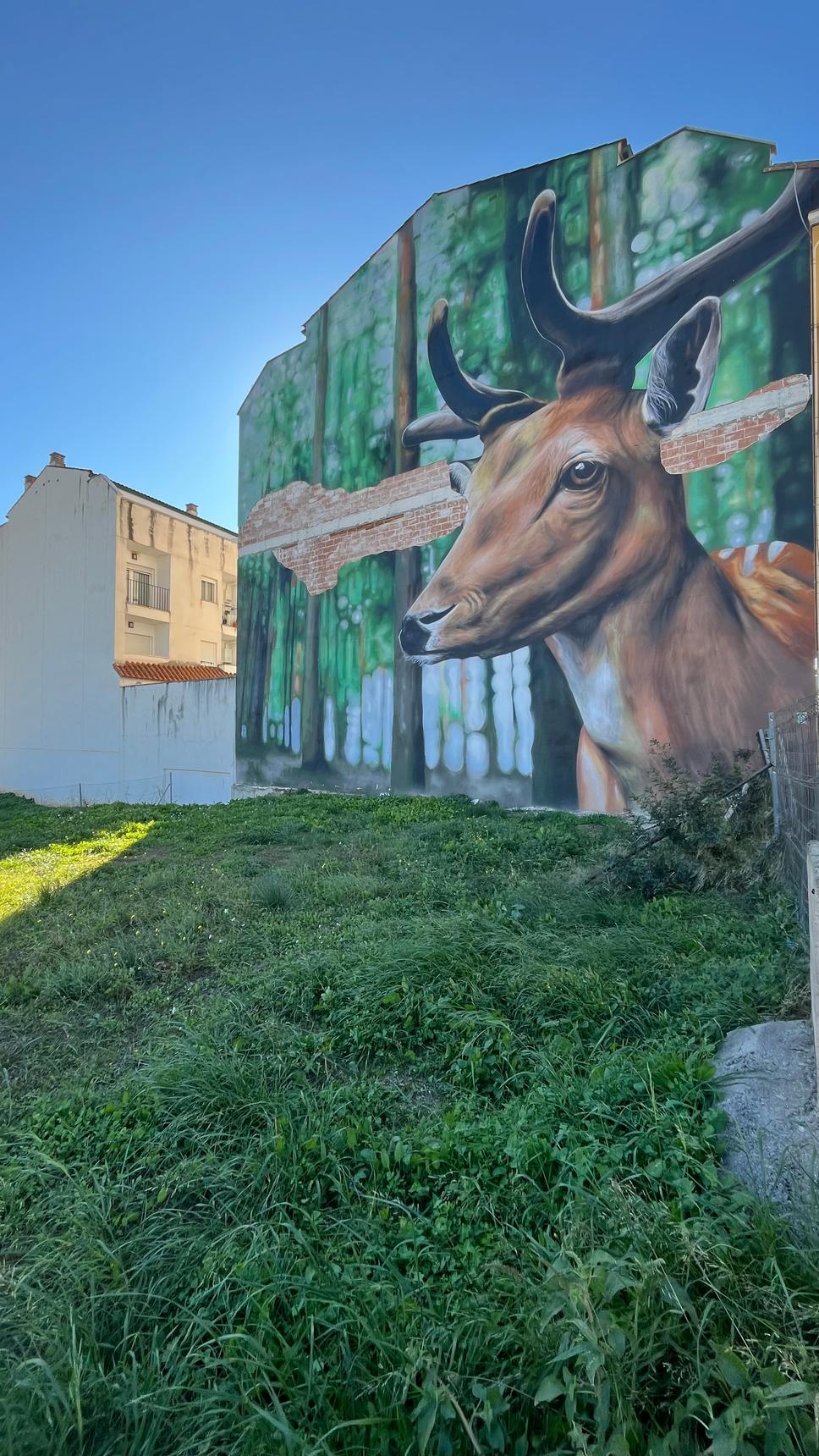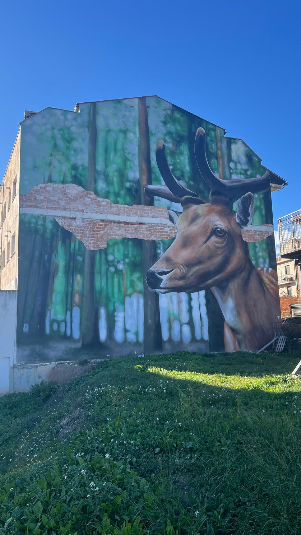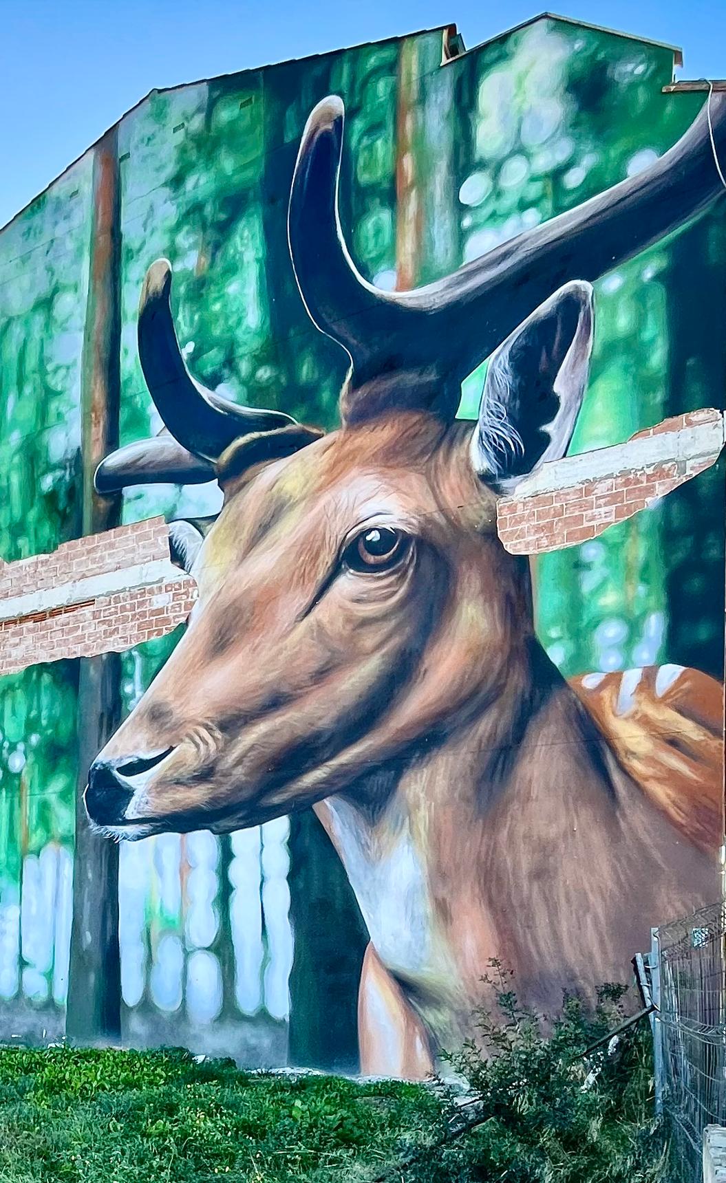 Large-scale mural depicting a deer emerging from a forest landscape.