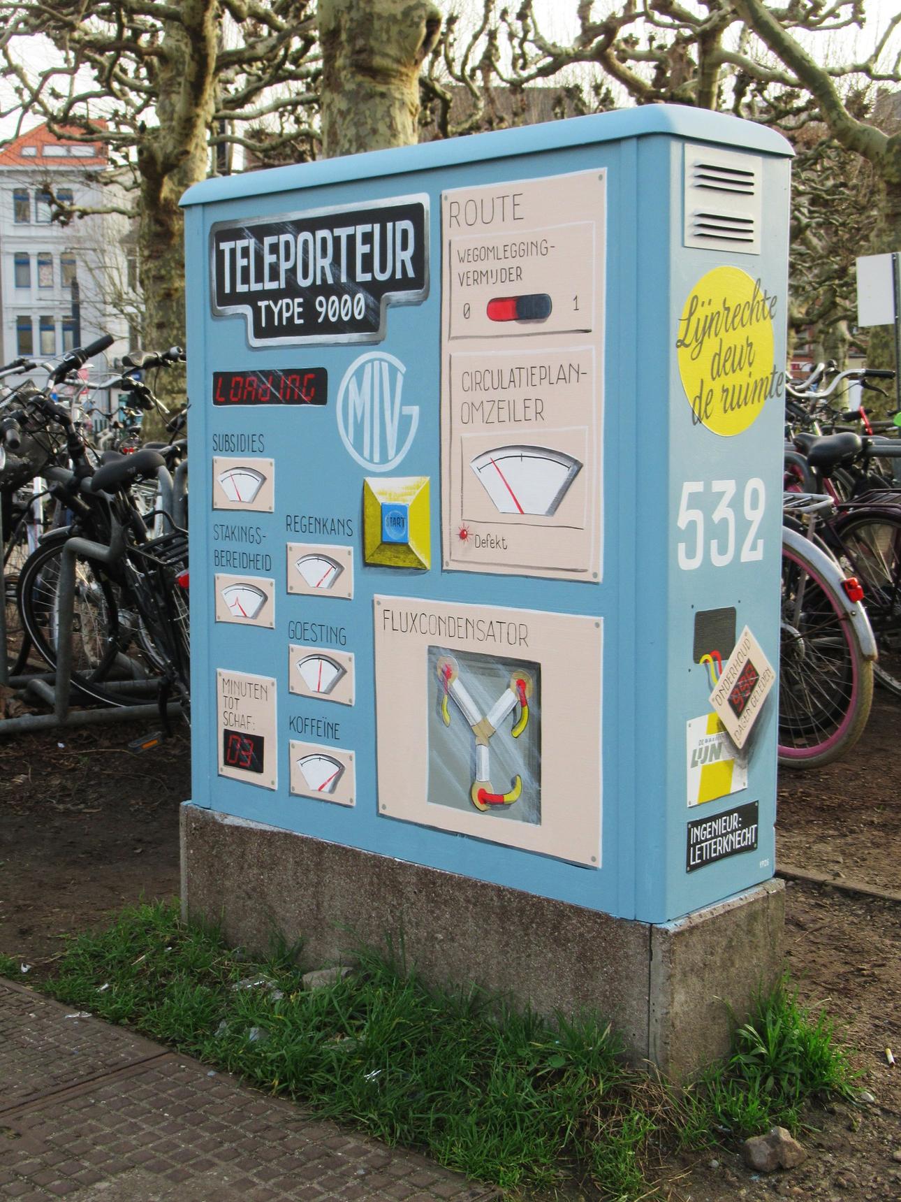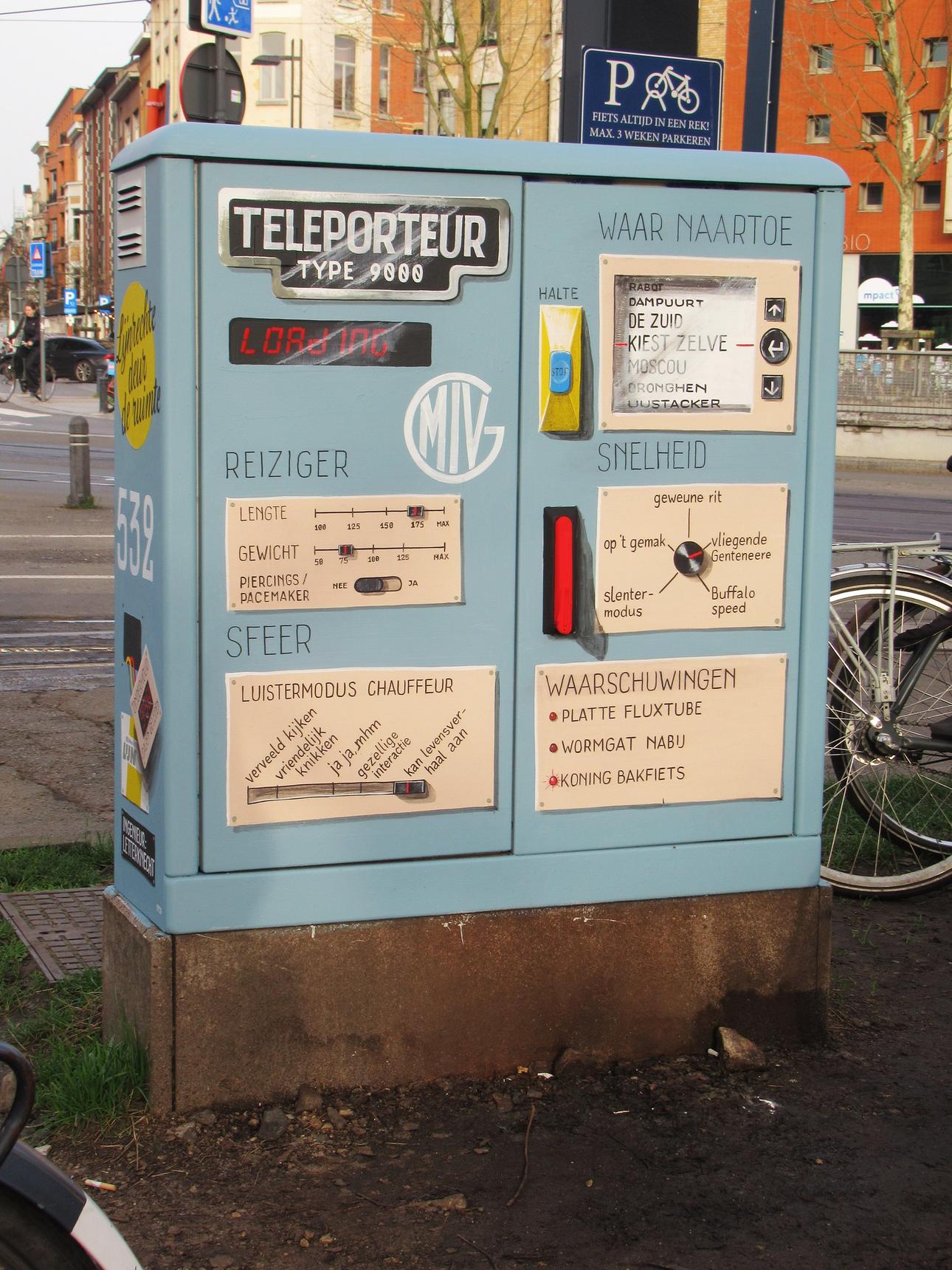 Dit is wat de artiest zelf zei erover: "Terug van weggeweest: de Teleporteur. Midden vorige eeuw experimenteerde de MIVG (de Maatschappij voor Intermoleculair Vervoer in Gent, voorloper van De Lijn ) met een vernieuwende vorm van transport, op snelheid van het licht. Ik mocht dit vernuft stukje technologische geschiedenis restaureren, opknappen en uittesten."