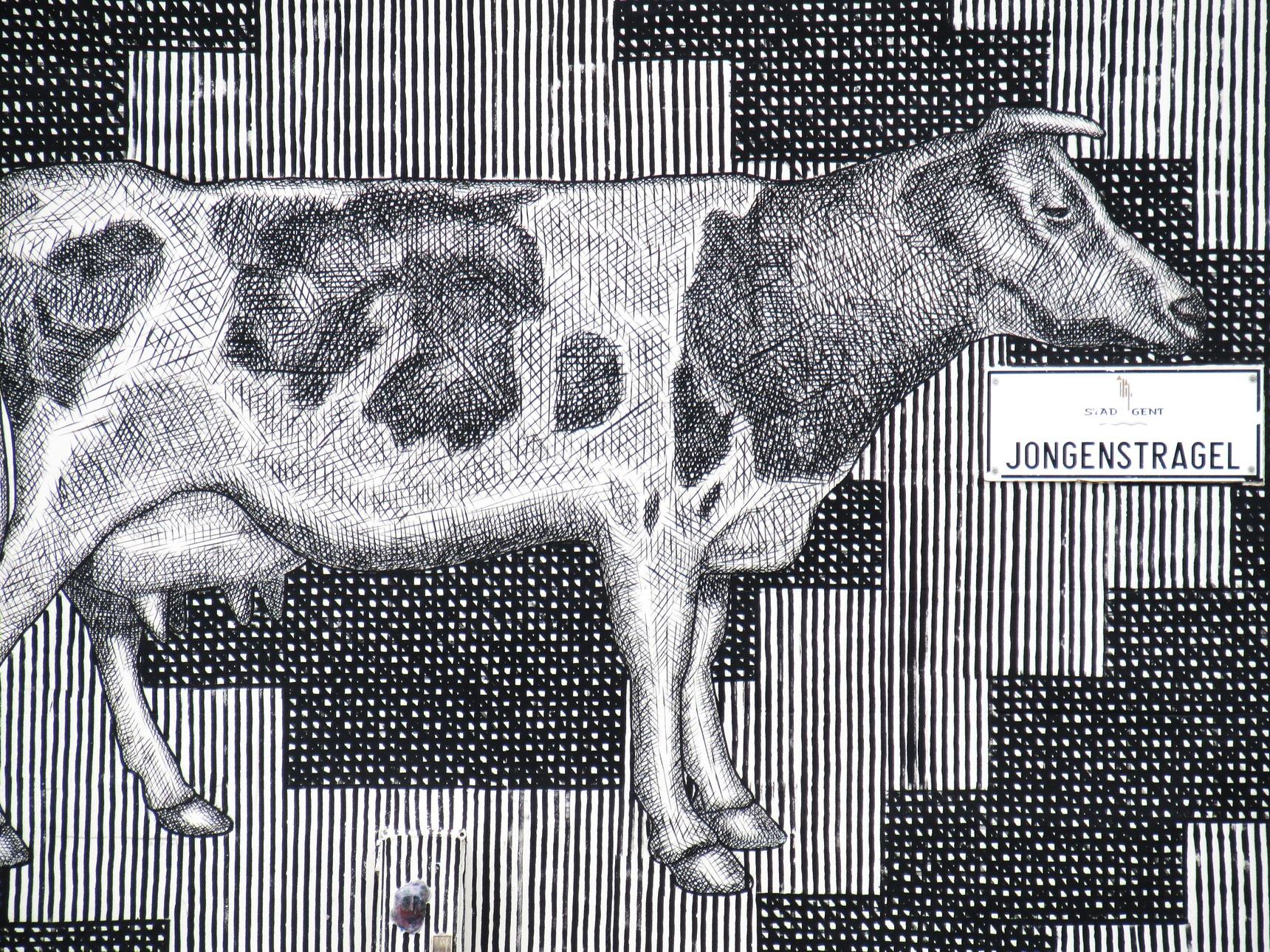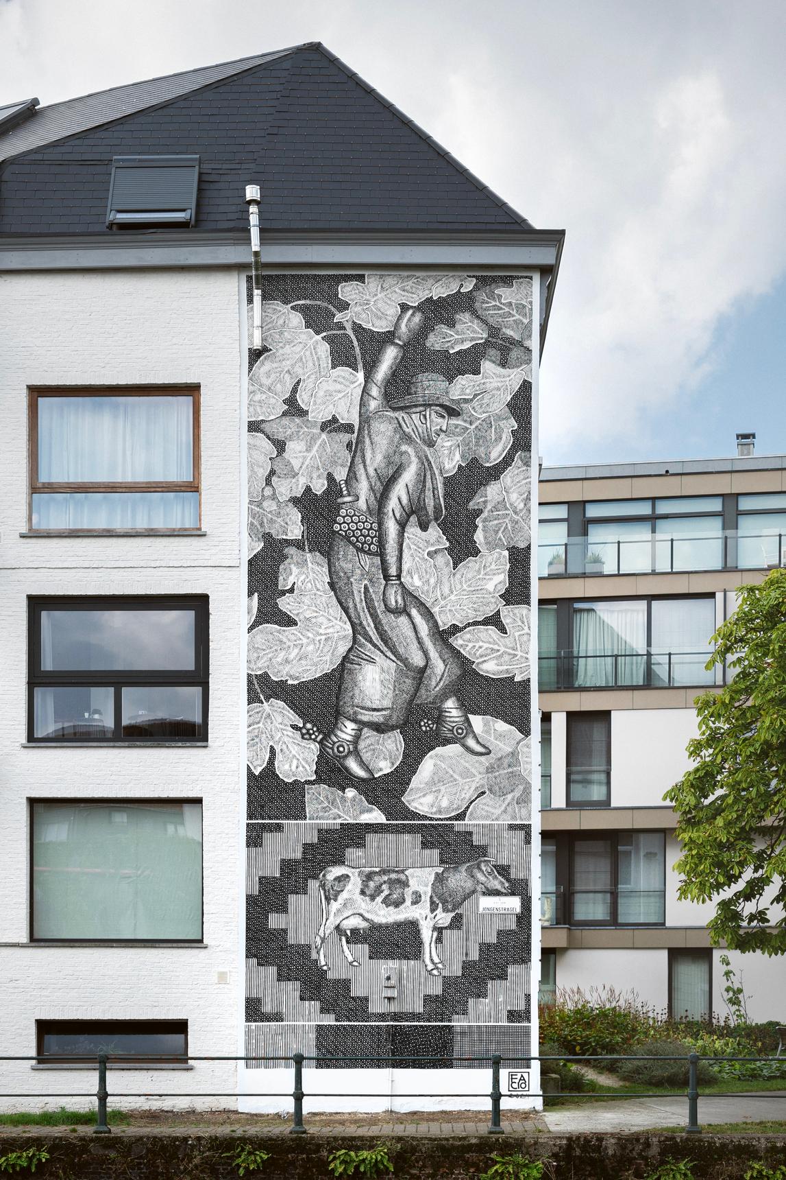 "Drawing inspiration from local history, Tomas created a mural that invites us to revisit the past of Ghent. This artwork adorns a wall at Koepoortkaai, named after the "Koepoort" (Cow Gate). Dating back to the 11th and 12th centuries, this area was historically used for cattle breeding, with the gate likely named for the cows that passed through it to graze. FACIO reimagined this story through his cultural perspective, featuring an Argentinian farmer in a unique cultural exchange."